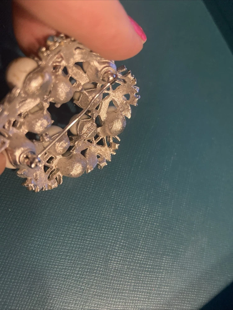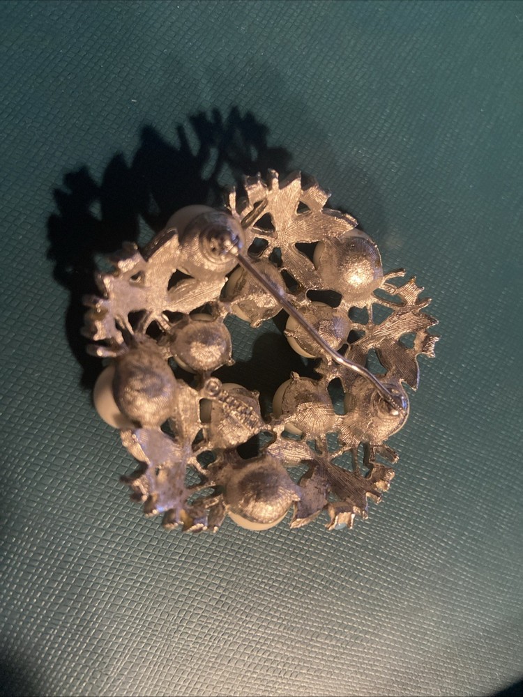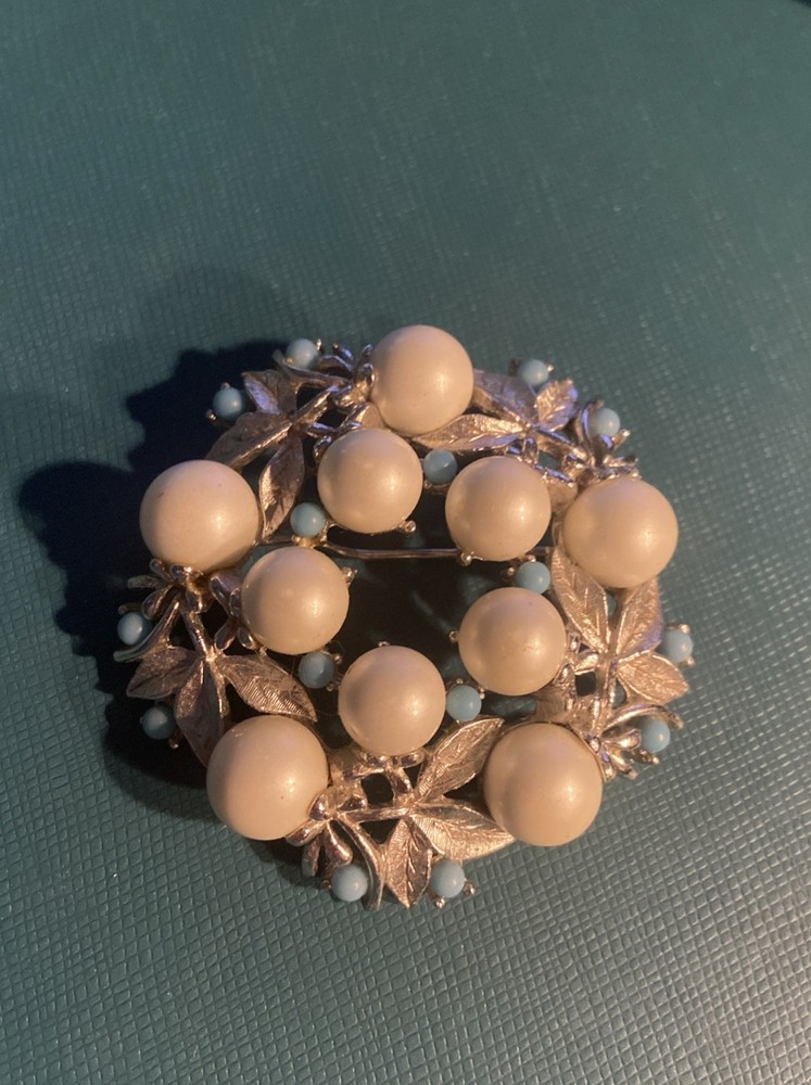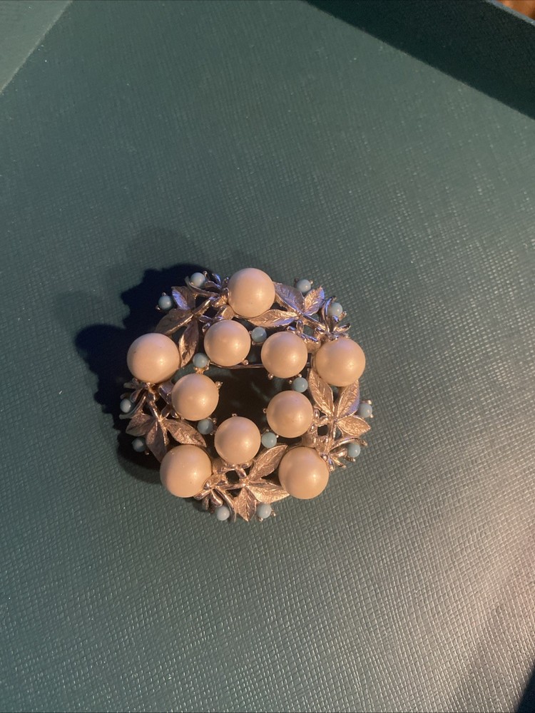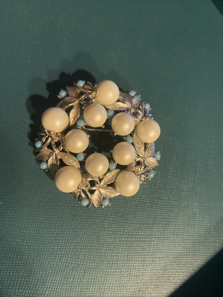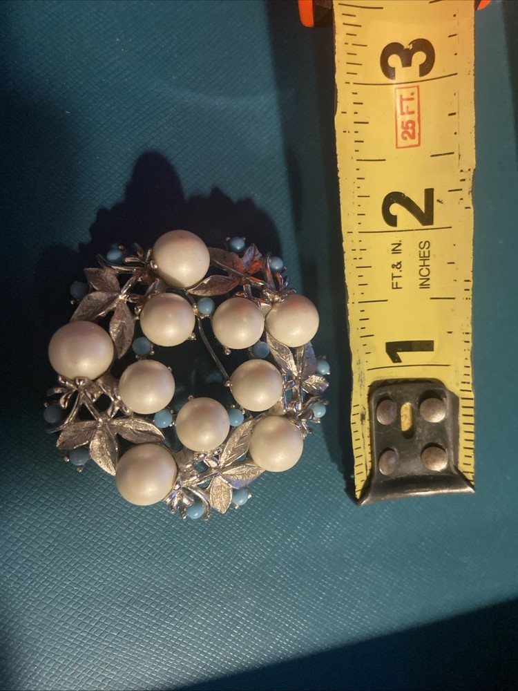 This vintage Sarah Coventry brooch from 1961 features a wreath design with faux pearls and turquoise accents, embodying the theme of Alaskan Summer. The silver toned metal and signed branding add to its charm, making it a unique and collectible piece of fashion jewelry from the 1960s era. Perfect for women who appreciate vintage accessories with a touch of elegance and nostalgia.good condition with light bend pin back working order.