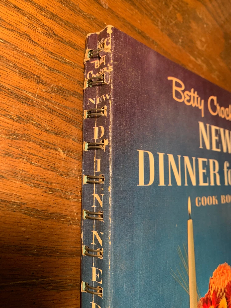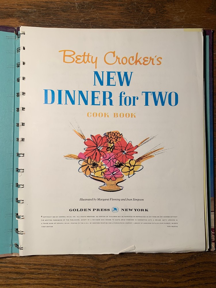 Genre:CookbooksPublication Year:1964Country/Region of Manufacture:United StatesIntended Audience:AdultsTopic:Cooking, BooksNarrative Type:NonfictionOriginal Language:EnglishBook Title:Betty Crocker's New Dinner for Two Cook BookFormat:Hardcover, Wire BoundEra:1960sISBN:Does not applySeller Notes:“see pictures for condition. first page is coming off spiral (see pictures).”Vintage:YesLanguage:EnglishPublisher:General Mills Incgtin13:Does not applyAuthor:General Mills Inc.Type:CookbookEdition:First Edition, First Printing
