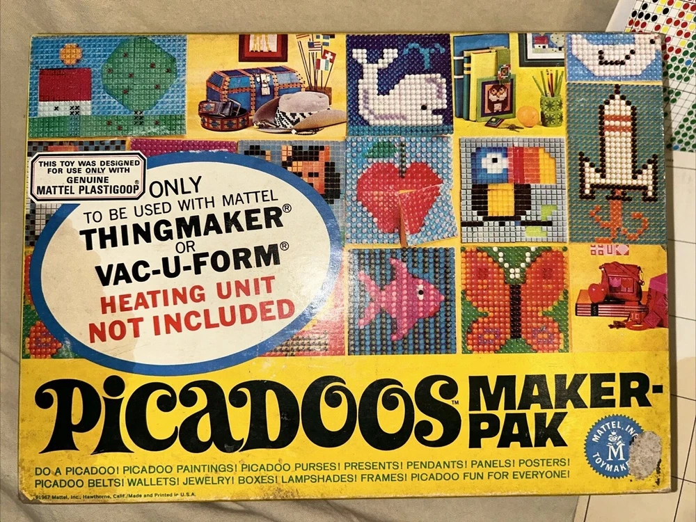 Vintage 1967 Mattel Thingmaker Picadoos Maker Kit in Box with Plastigoop & Molds. Used, includes 6 molds, a couple of tools, wire, and Plasticgoop as seen. All 6 are liquid, not sur how useable, dated 1965 and one dated 1966. Includes cool little catalog, instructions, order form, and patterns as seen. The graph board is stained but I left it in there. The Styrofoam is messy, box lid shows wear, but a nice vintage lot. Please see photos. Please check my other sales.