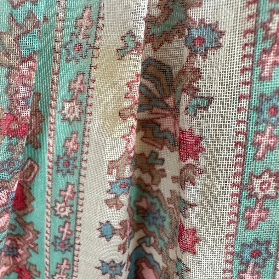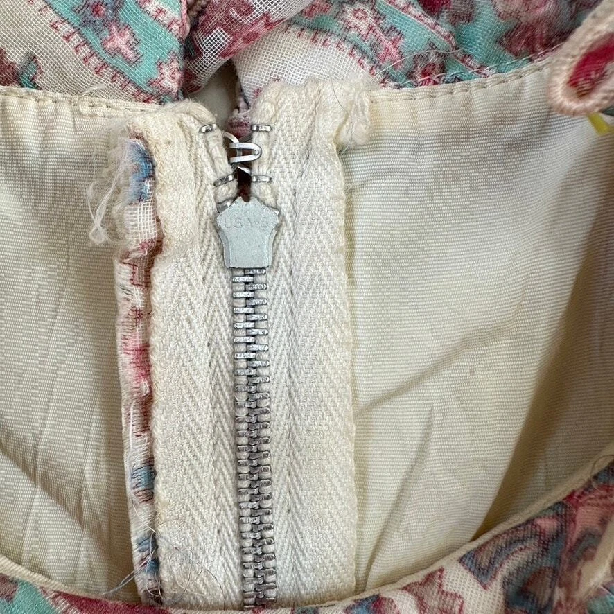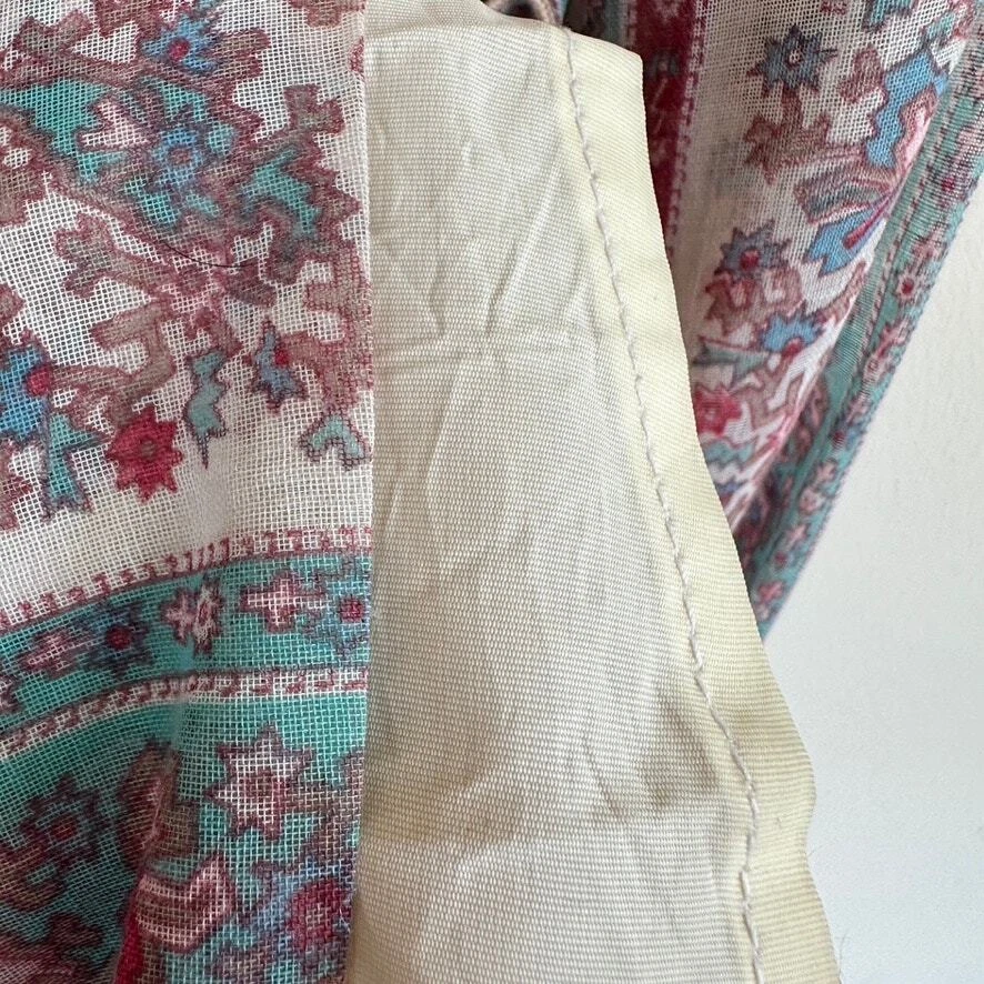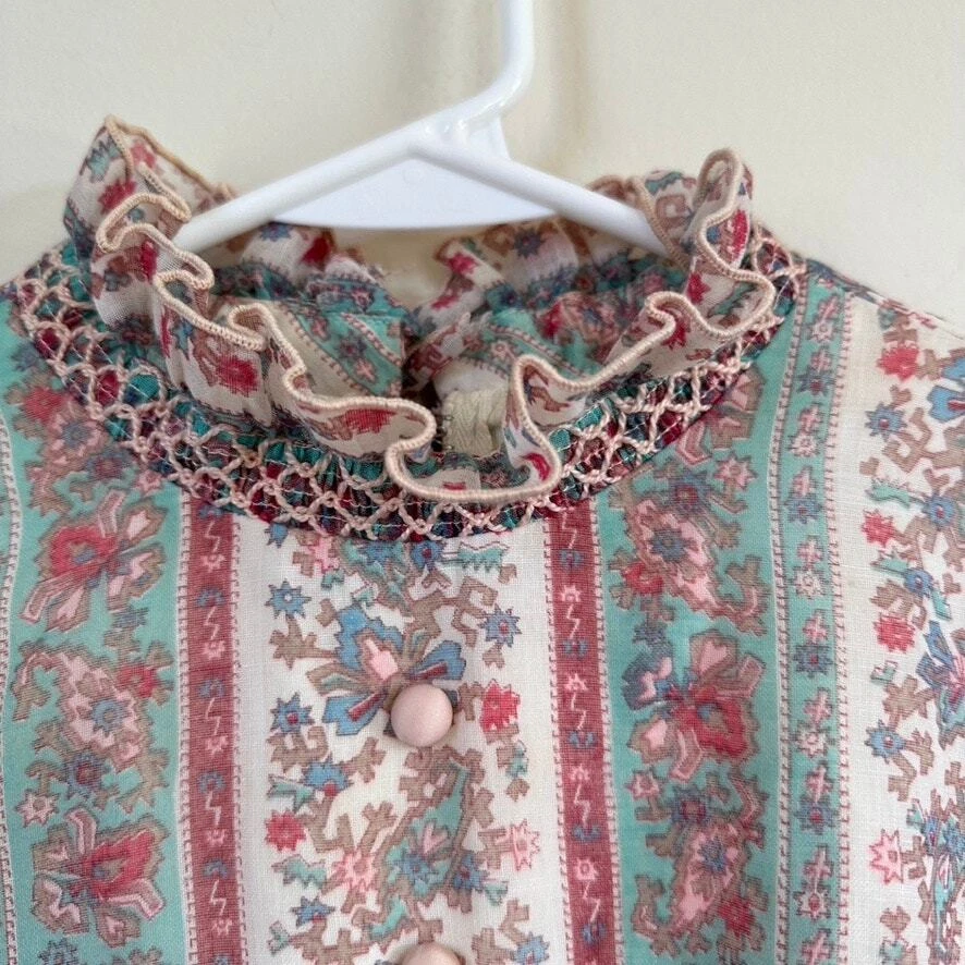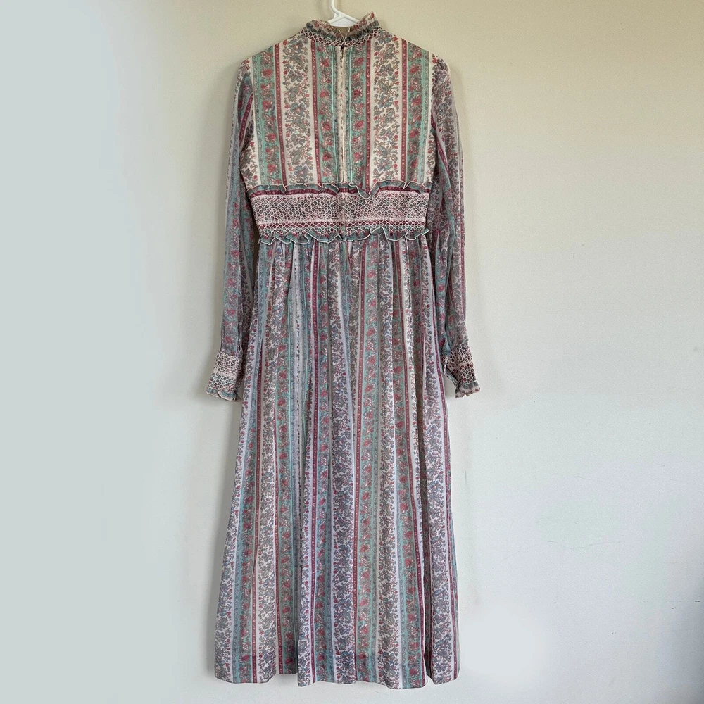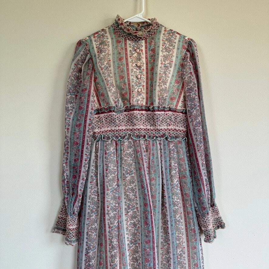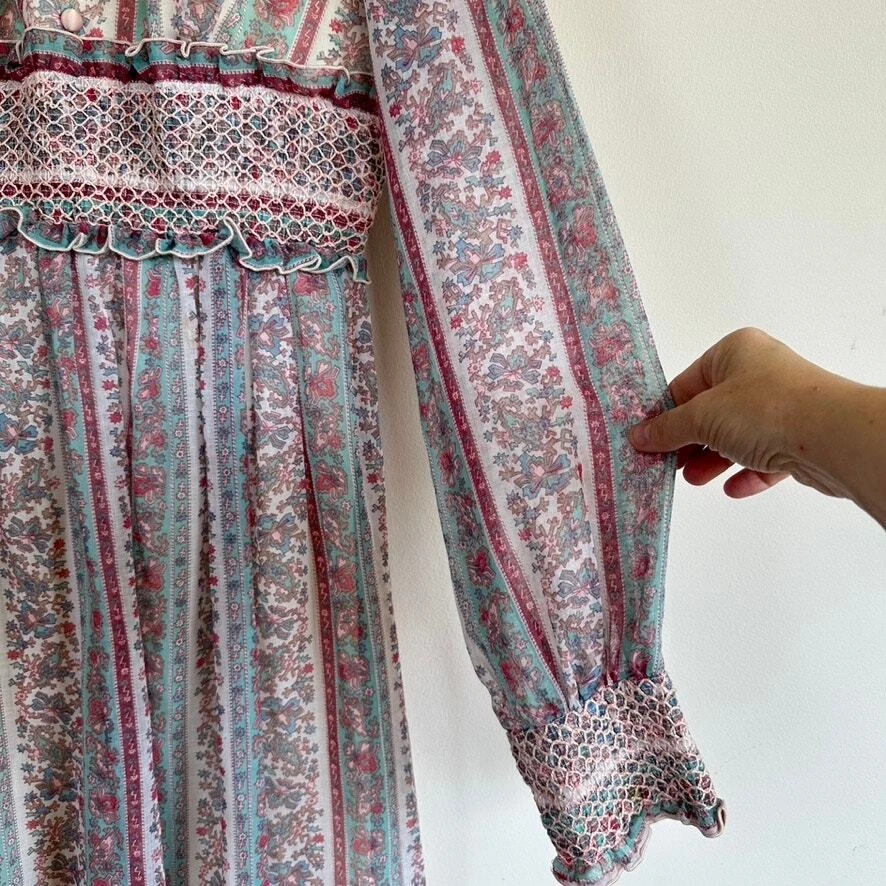 Vintage 1970 Cottagecore Victorian Maxi Dress Prairie Floral Smocked High Neck. Sheer sleeves with smocked detail on the cuffs. Dress is fully lined, except for the sleeves. Metal zipper on the back. Size: NO SIZE TAG. PLEASE SEE MEASUREMENTS TO ENSURE PROPER FIT Approx. measurements: 17" across (pit to pit), 14 waist, 52" long (shoulder to hem) Condition: Pre-owned good. Pre-loved and in gently used condition. Light wear. A few faint stains on the front, just under the chest. Please see all pics for any wear/condition. cottage, cottagecore, prairie, prairiecore, little house on the prairie, florence welch dress, Victoriana, regency, victorian, romantic