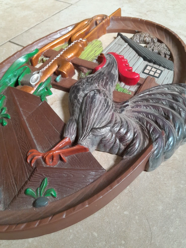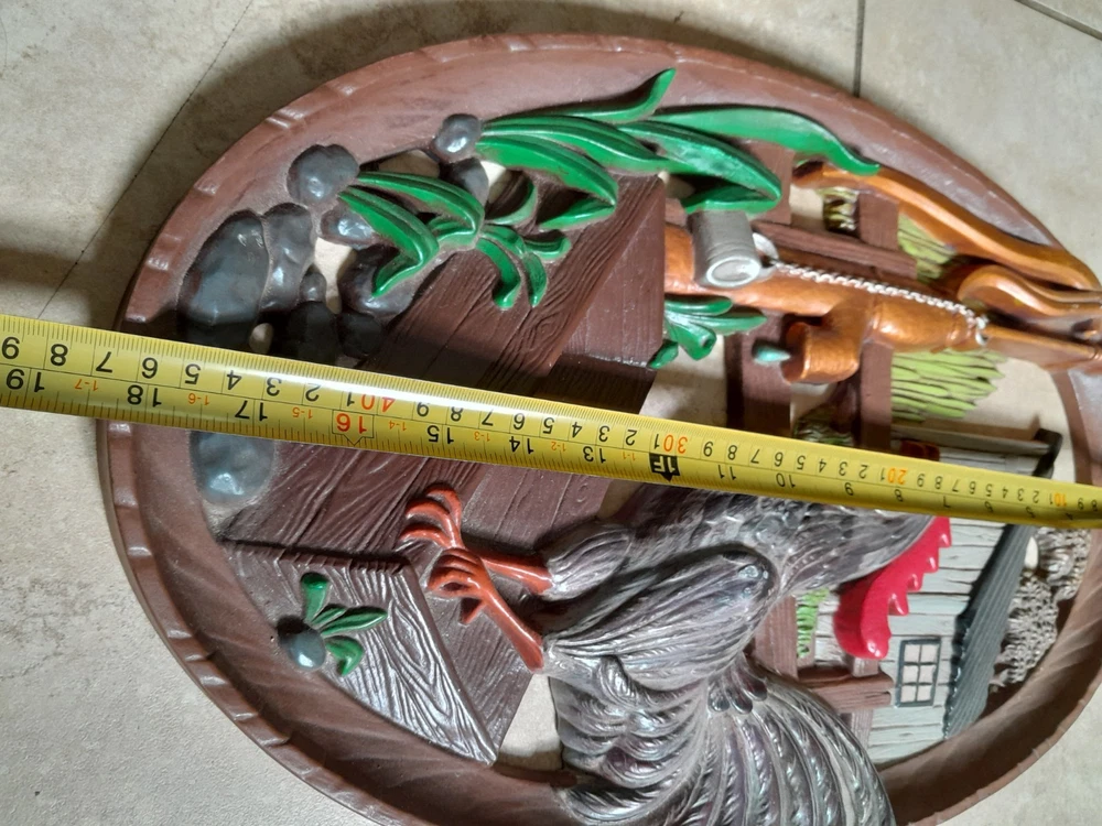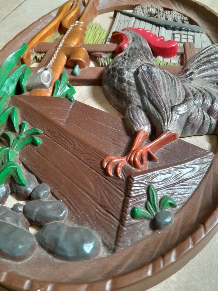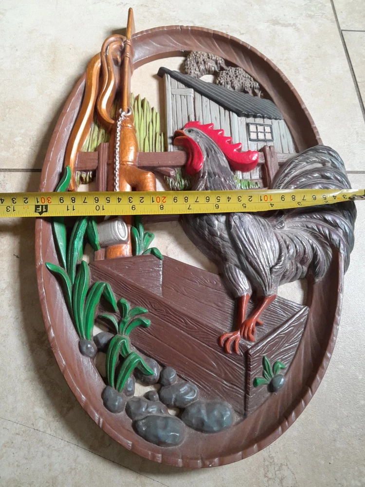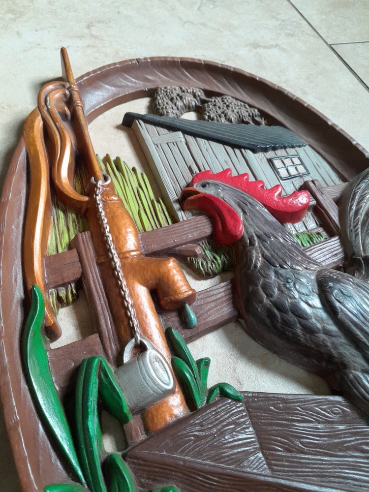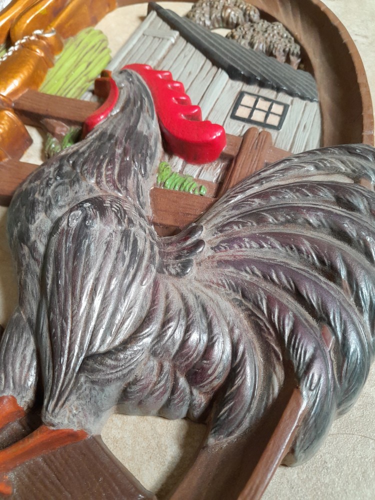 Add a touch of vintage charm to your home decor with this beautiful 1970's farmhouse-style wall plaque. The oval-shaped plaque features a hand-painted rooster design, giving it a unique and authentic feel. Measuring 18x12 inches, it is made of high-quality ceramic and clay materials with a high gloss finish, making it durable and long-lasting. This wall plaque is perfect for any room in your home, and its multicolor design will complement any decor style. It is handmade with a 3D effect, giving it a realistic and charming look. This vintage piece is perfect for adults who love rooster-themed decor and want to add a touch of nostalgia to their home. Gorgeous Piece. Small vintage wear