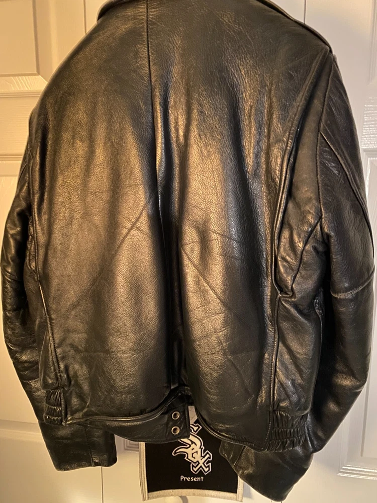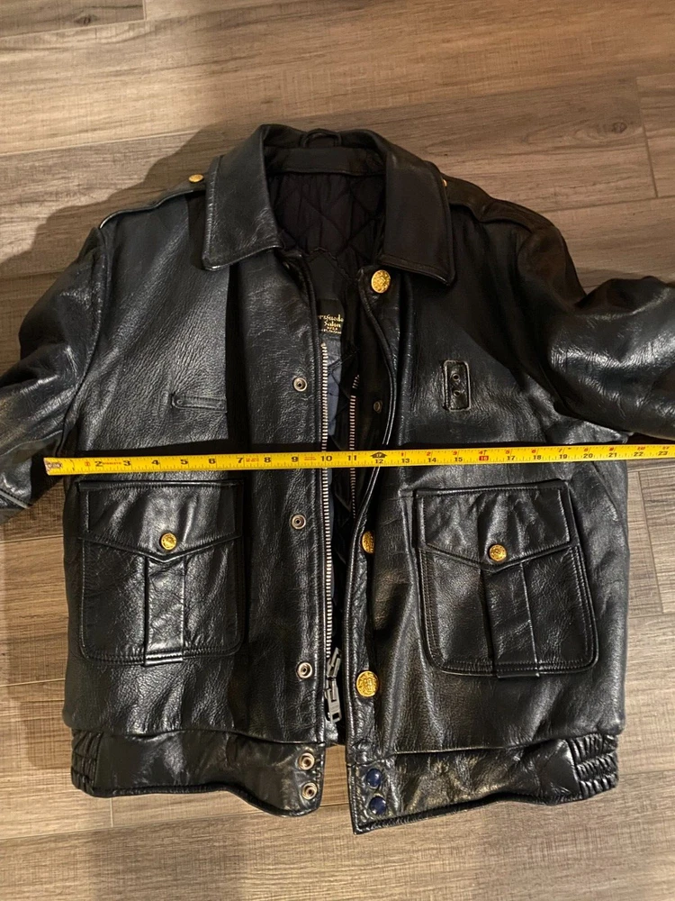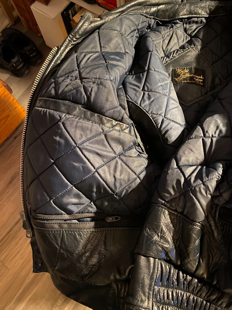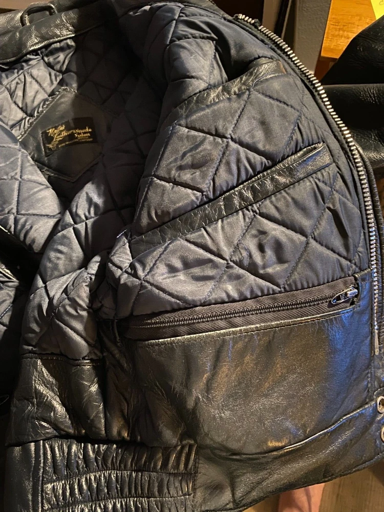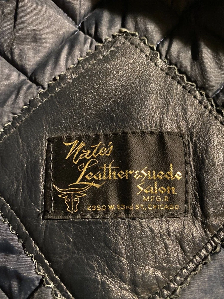 Vintage (1970's) Nate's Leather & Suede Salon, Chicago. Police leather jacket with quilted lining. Very good condition with minimal wear. Threading holes where police patches were removed from both arms. Multiple inside pockets. Fits like a size large. NO RETURNS.