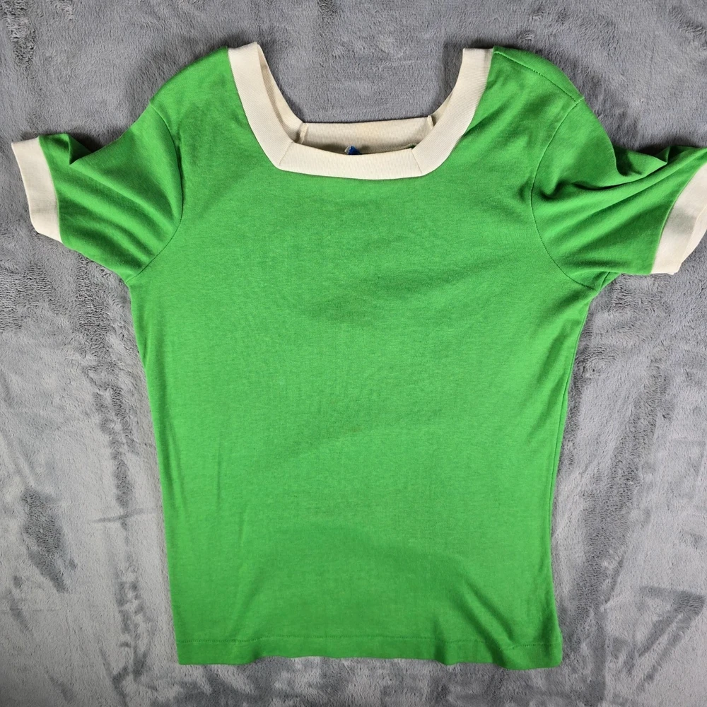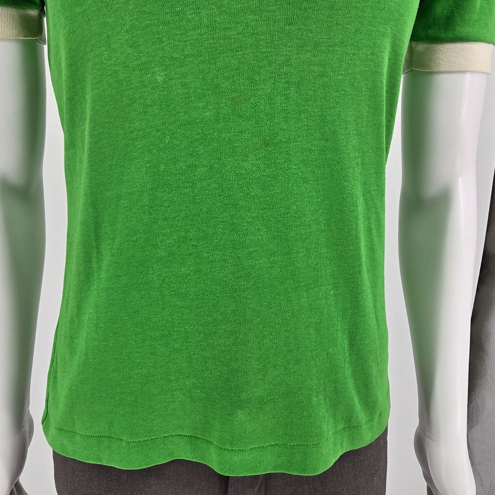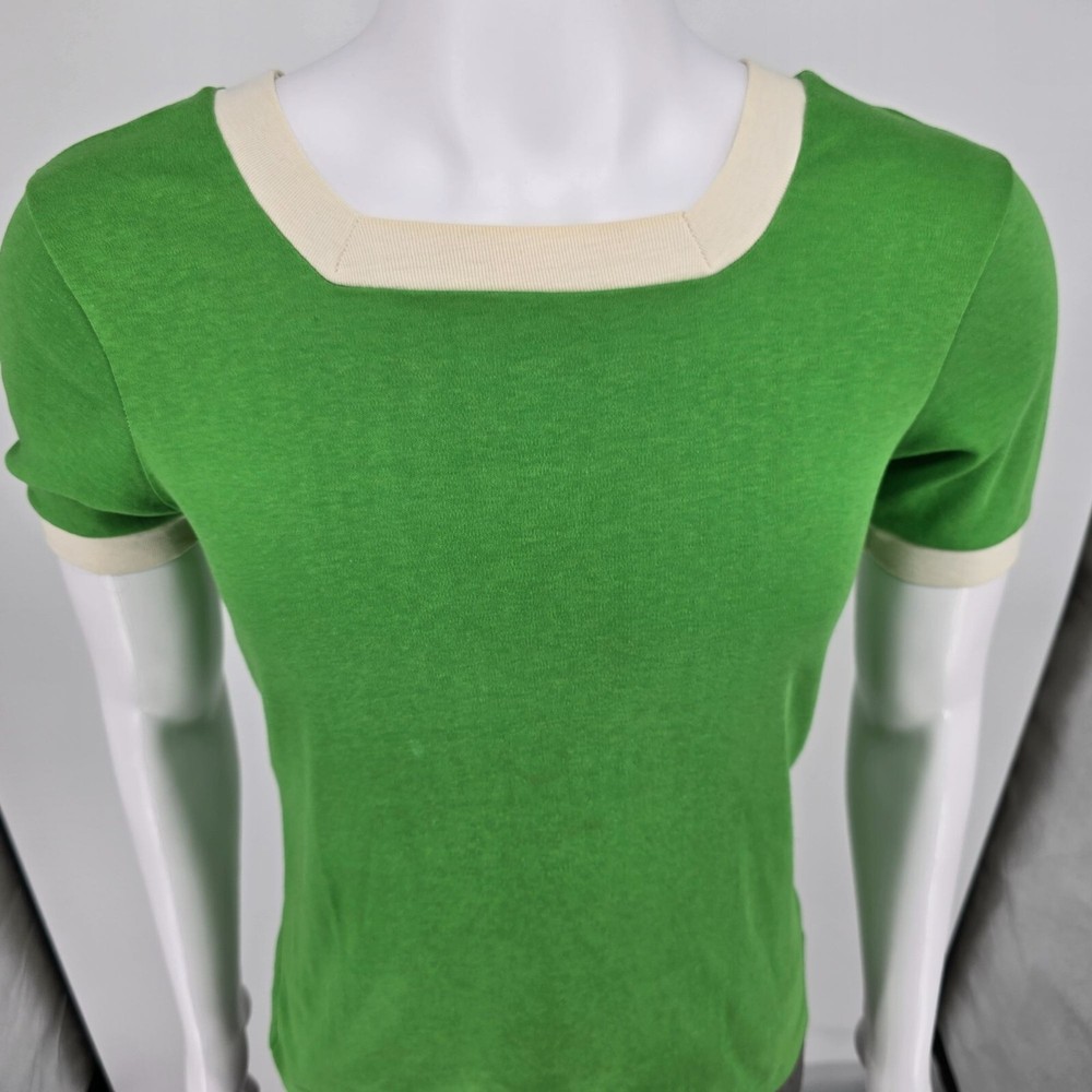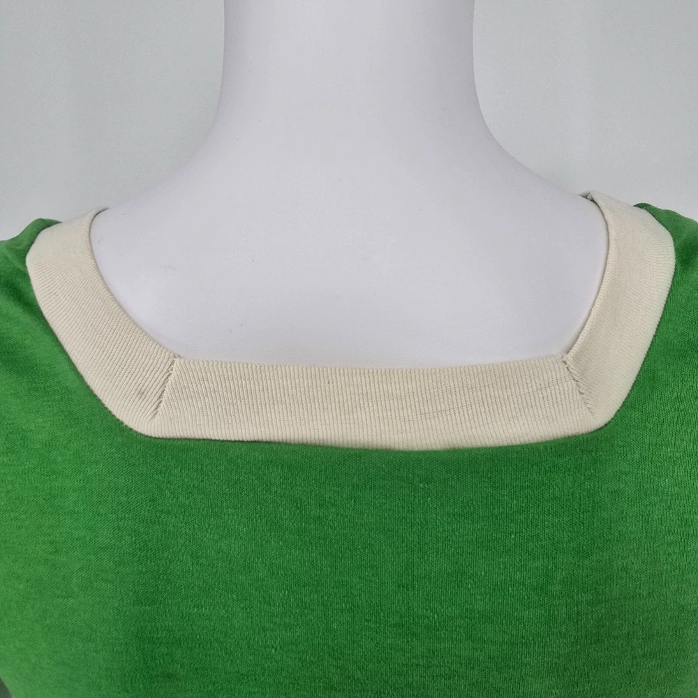 ๐น Item Details: Brand: Sears Material: Unknown (tag illegible- feels like 50/50 cotton/poly blend) Color: Green Decade of Manufacture: 1970s Country of Manufacture: Unknown (but almost certainly United States) Notable Features: Square crew neckline, contrast collar and cuffs, single stitch hem ๐น Condition Notes: Good used vintage condition. Discoloration at collar and at both cuffs. Moderate fabric wear, fading, and pilling throughout. See photos. ๐น Size Notes: Vintage Tag Size: Unknown (tag illegible) Modern Measured Size: Small ๐น Measurements (Approximate): Chest (pit to pit): 35.5 inches Collar to Hem: 24.5 inches ๐น Shipping & Returns: Ships worldwide from Lexington, KY. Ships within 3 business days of purchase. Returns accepted within 60 days for domestic orders and 30 days for international orders.