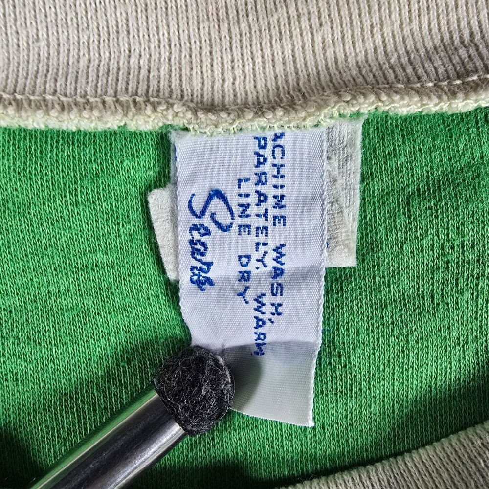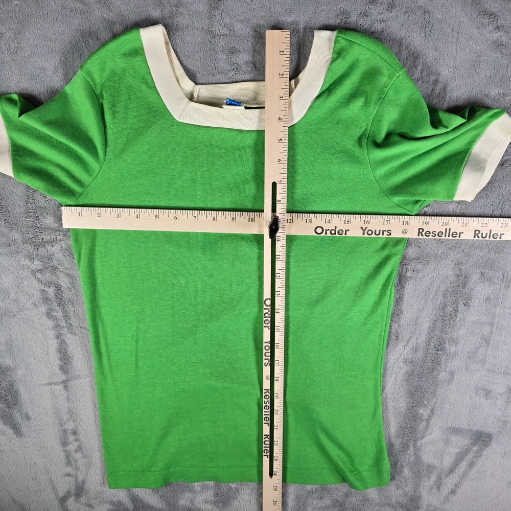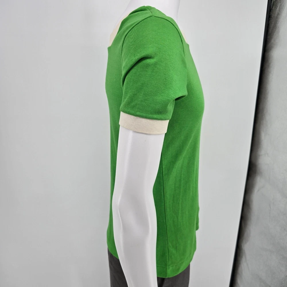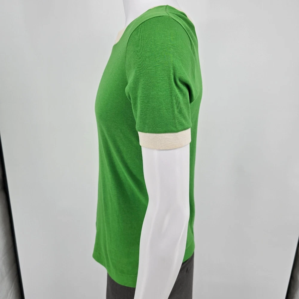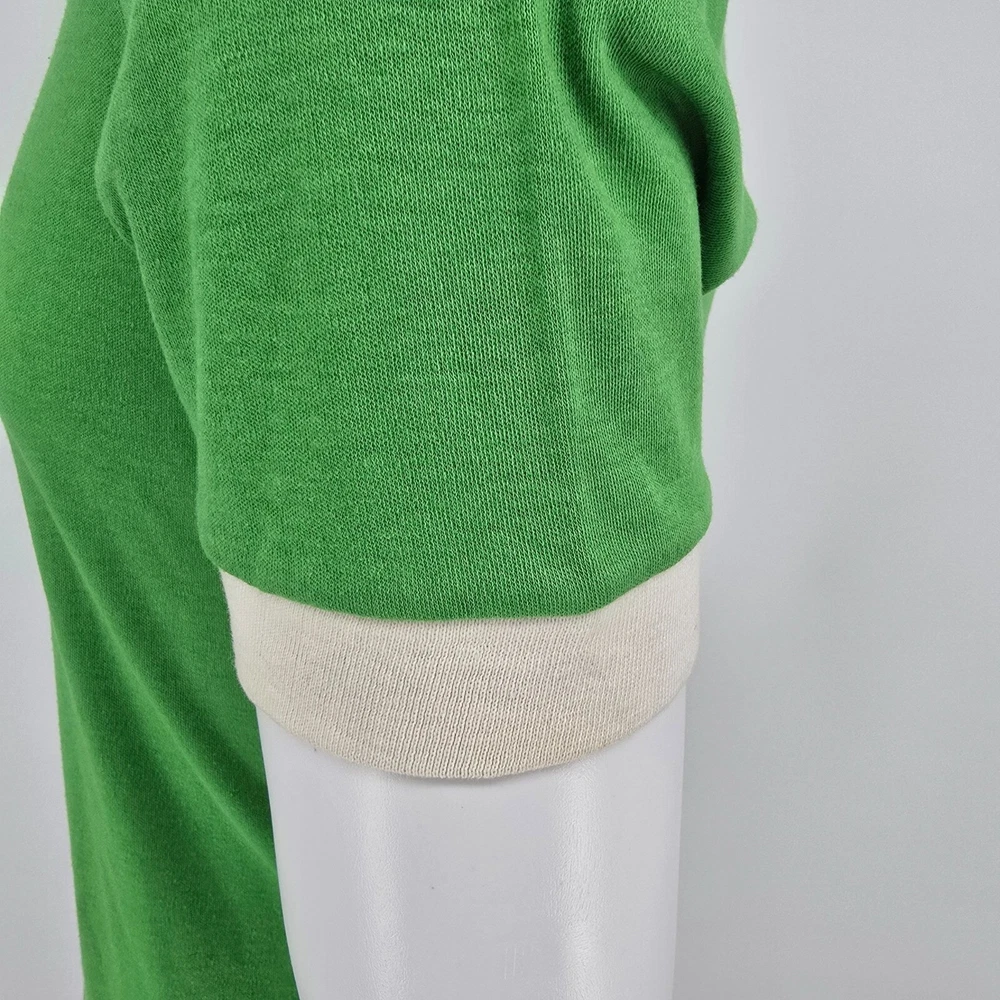 ๐น Item Details: Brand: Sears Material: Unknown (tag illegible- feels like 50/50 cotton/poly blend) Color: Green Decade of Manufacture: 1970s Country of Manufacture: Unknown (but almost certainly United States) Notable Features: Square crew neckline, contrast collar and cuffs, single stitch hem ๐น Condition Notes: Good used vintage condition. Discoloration at collar and at both cuffs. Moderate fabric wear, fading, and pilling throughout. See photos. ๐น Size Notes: Vintage Tag Size: Unknown (tag illegible) Modern Measured Size: Small ๐น Measurements (Approximate): Chest (pit to pit): 35.5 inches Collar to Hem: 24.5 inches ๐น Shipping & Returns: Ships worldwide from Lexington, KY. Ships within 3 business days of purchase. Returns accepted within 60 days for domestic orders and 30 days for international orders.