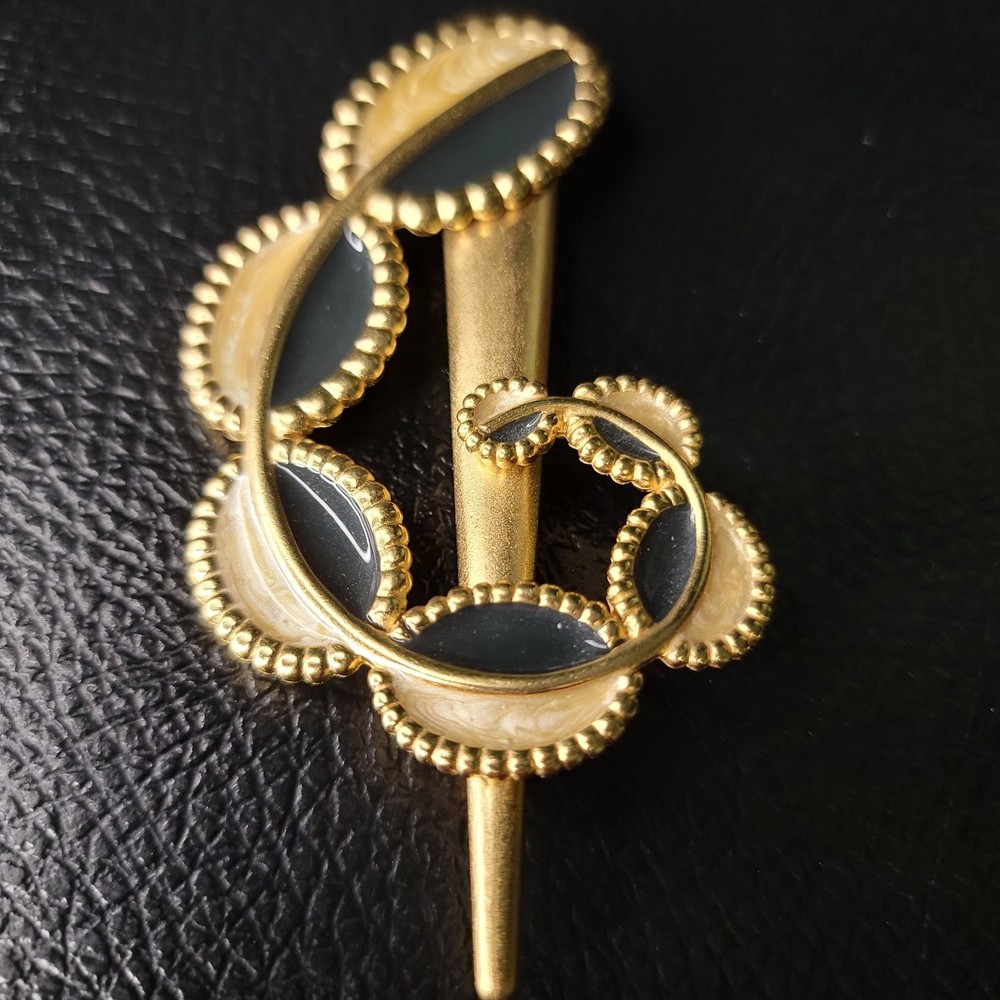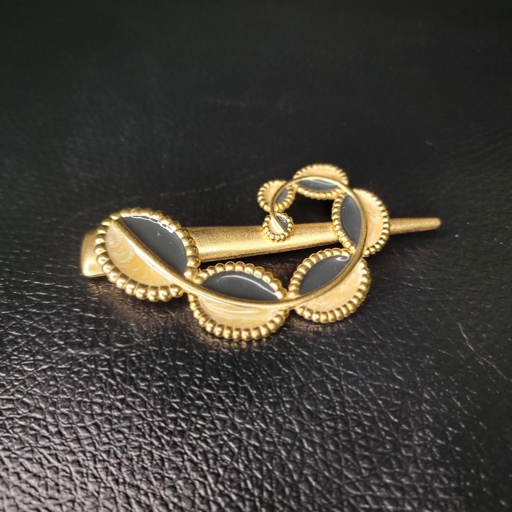 The product is a vintage 1970s MONET for YSL gold enamel modernist designer runway brooch. This brooch features a modernist design in gold enamel, typical of the YSL fashion house from that era. The brand and material suggest a high level of quality and craftsmanship, making it a unique and eye-catching accessory for any vintage jewelry collection.