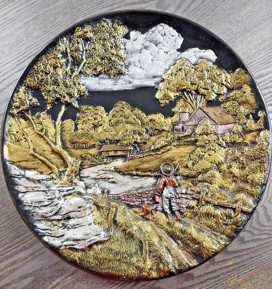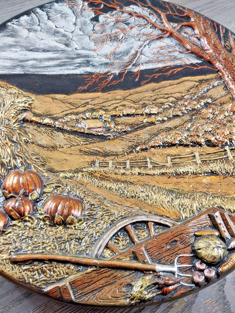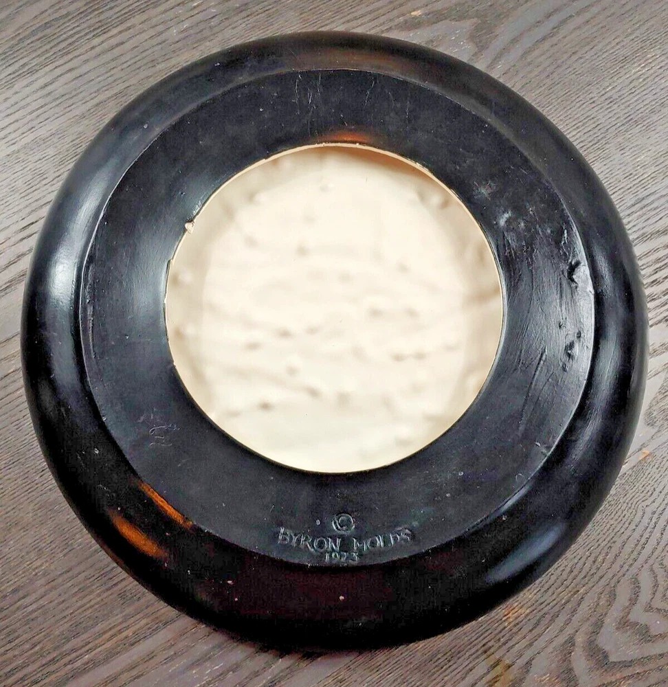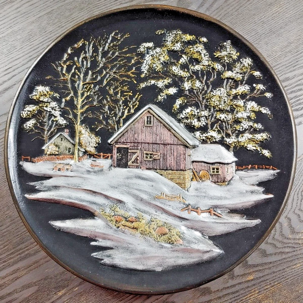 This vintage Byron Molds collector plate from 1973 features a 3D ceramic winter scene, showcasing a rustic round shape with a multicolor design. Measuring 13 inches in diameter, this decorative piece belongs to the late 20th-century era and reflects an American culture. The plate is a part of a seasonal theme, suitable for all occasions, and is a unique addition to any collector's display with its art pottery production style and vintage charm.