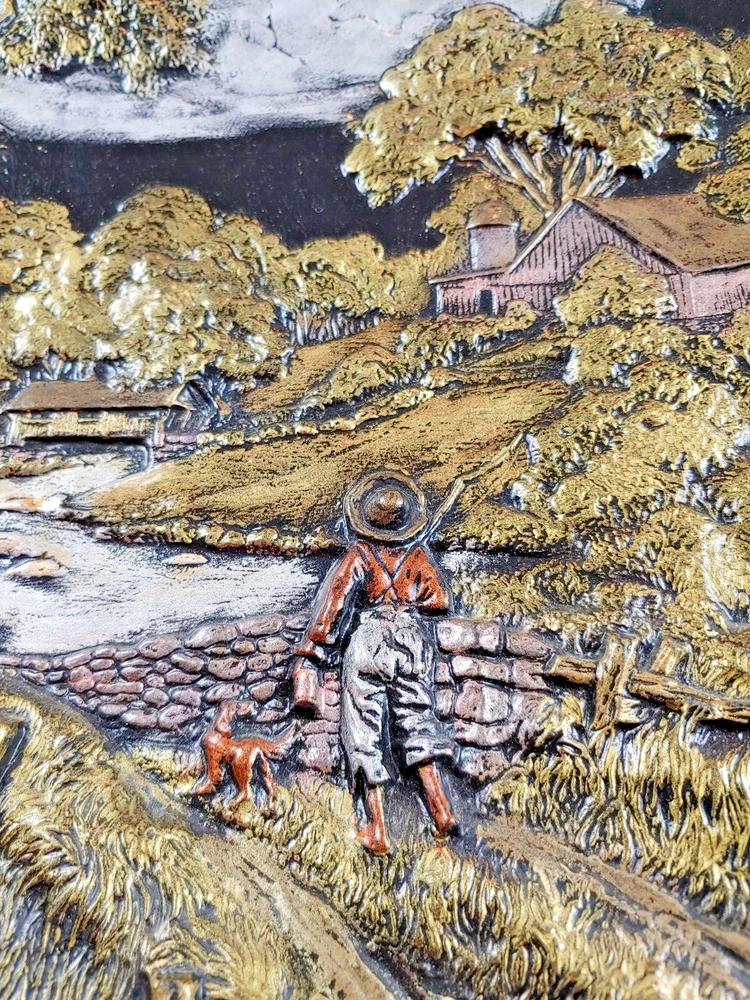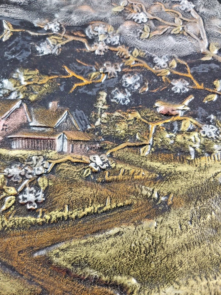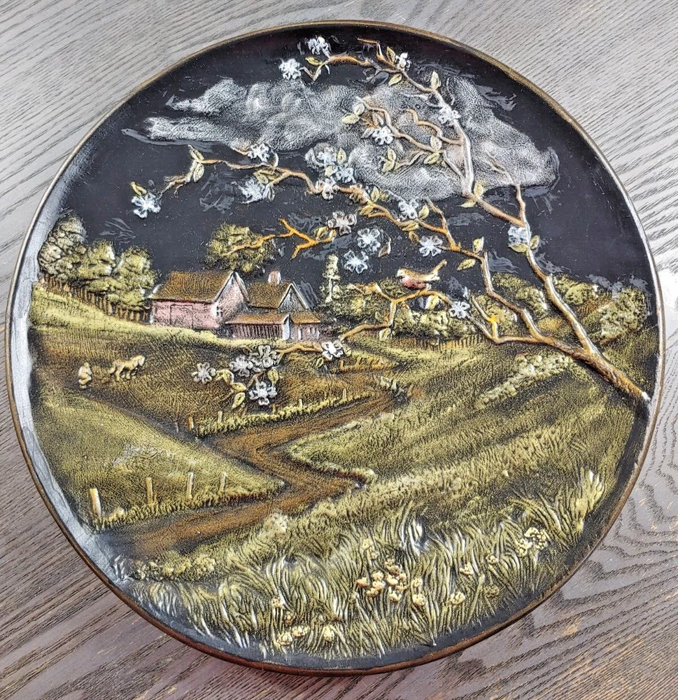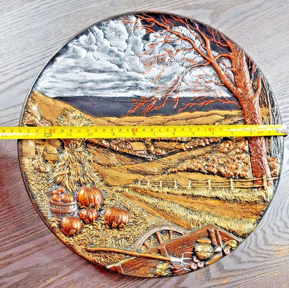 This vintage Byron Molds collector plate from 1973 features a 3D ceramic winter scene, showcasing a rustic round shape with a multicolor design. Measuring 13 inches in diameter, this decorative piece belongs to the late 20th-century era and reflects an American culture. The plate is a part of a seasonal theme, suitable for all occasions, and is a unique addition to any collector's display with its art pottery production style and vintage charm.