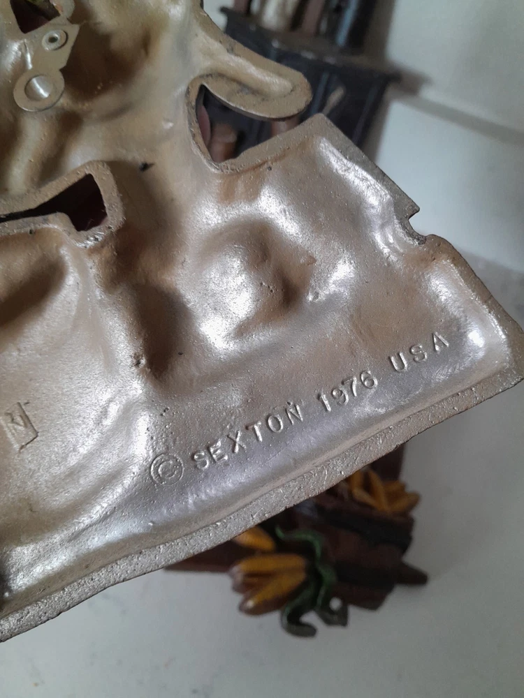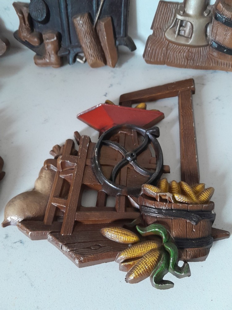 The product is a set of five vintage metal aluminum wall art pieces from 1976 by Sexton & Homco. These decorative plaques feature a cast aluminum design in multicolor, depicting a vintage country theme with elements of a farmhouse, cabin, and barn. The wall-mounted plaques are 7 inches tall and 6 inches wide, perfect for adding a touch of rustic charm to any room in your home, such as the kitchen or dining room. Made in the USA, these pieces showcase a metallic finish and are ideal for those looking to enhance their space with a touch of country and western decor. All very good condition