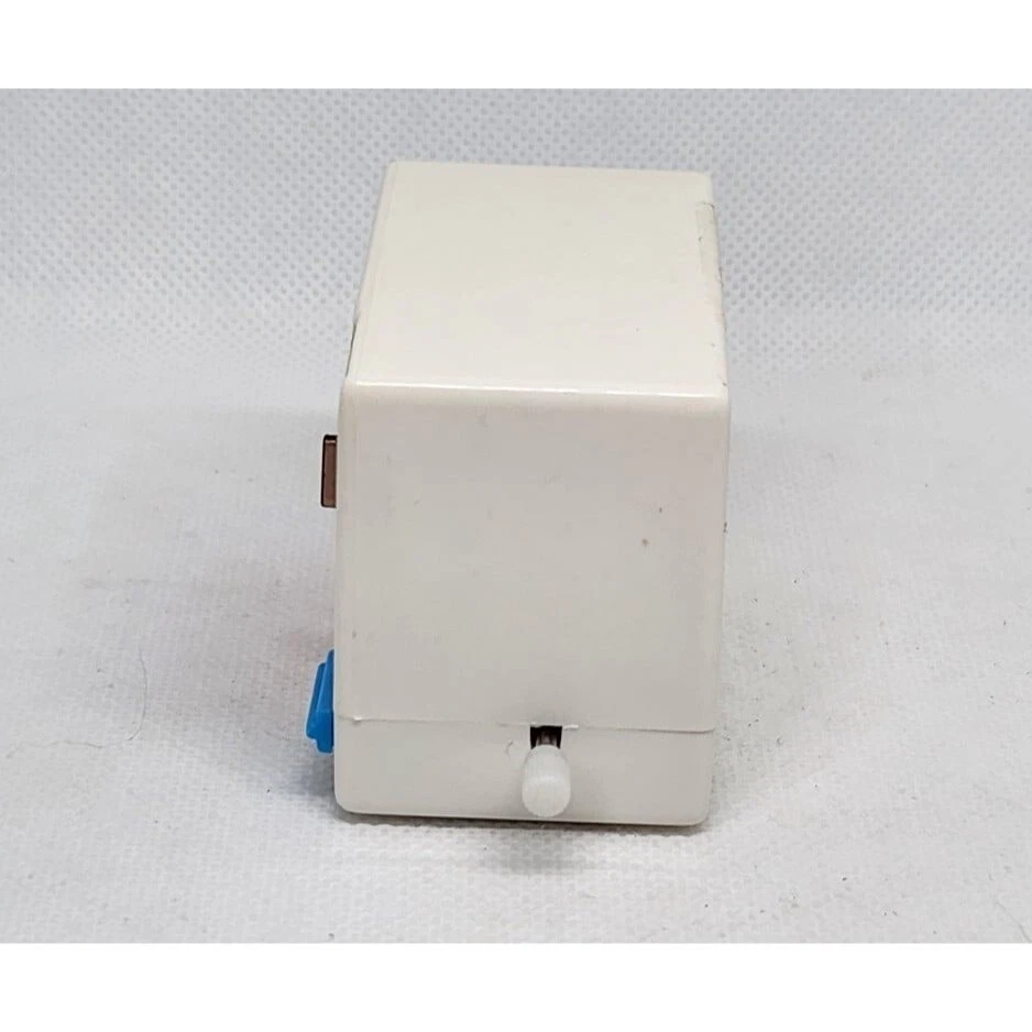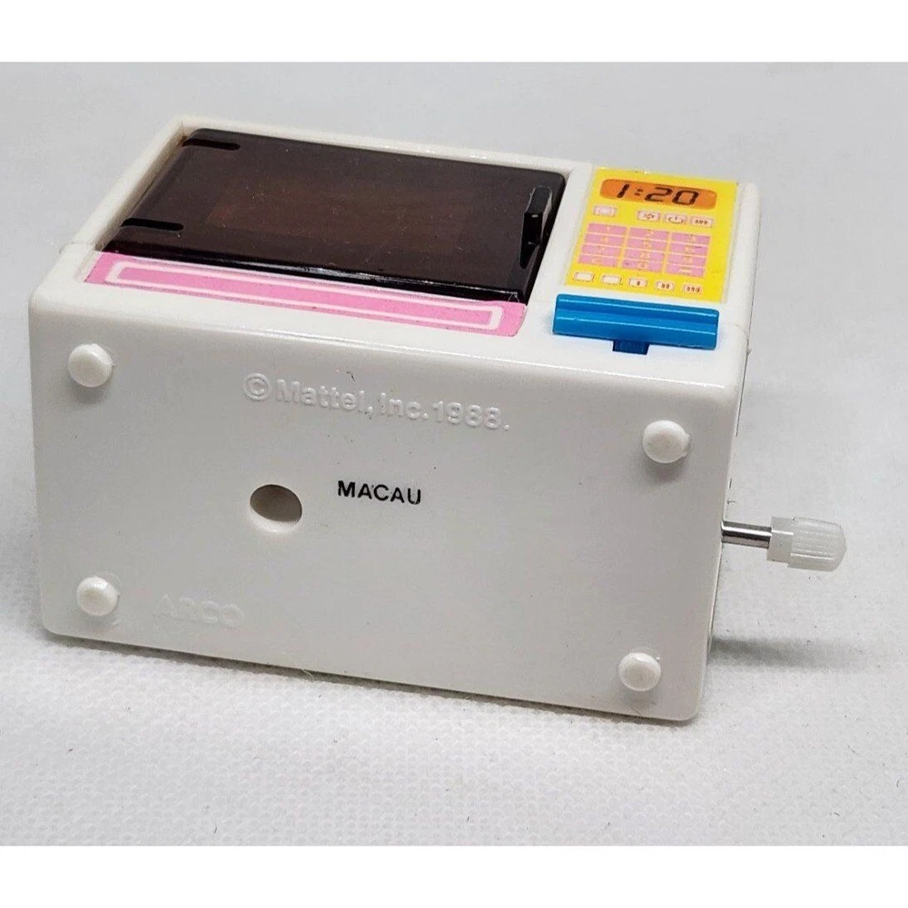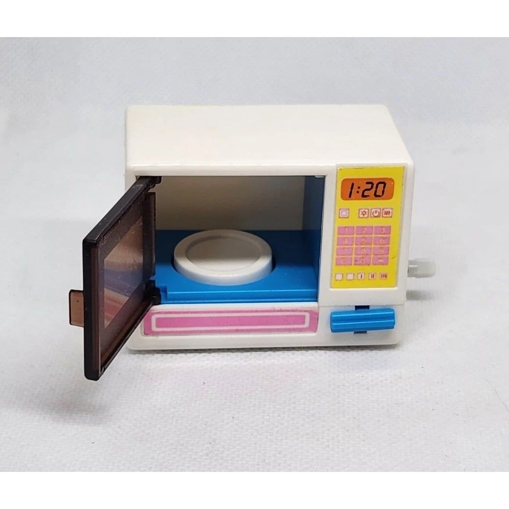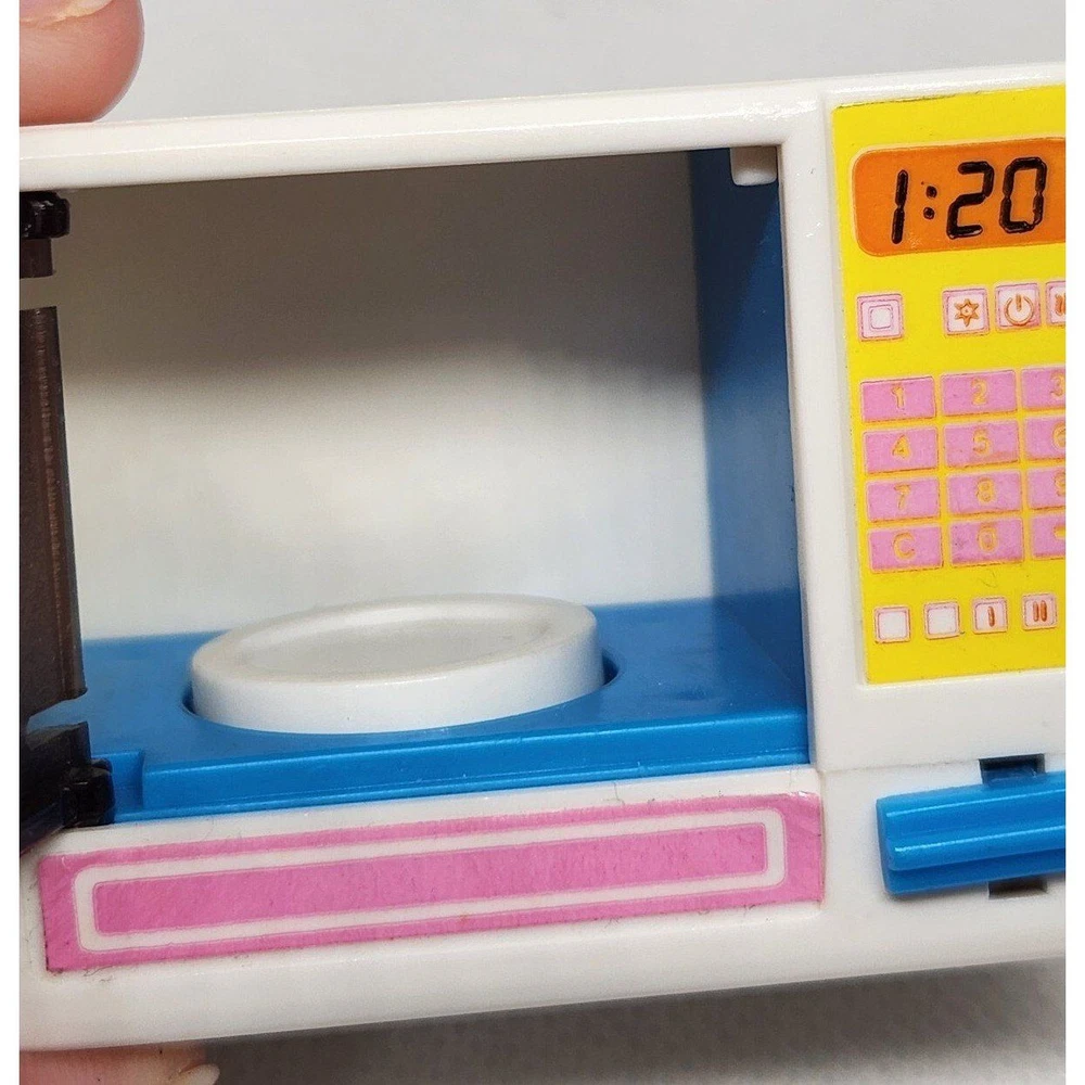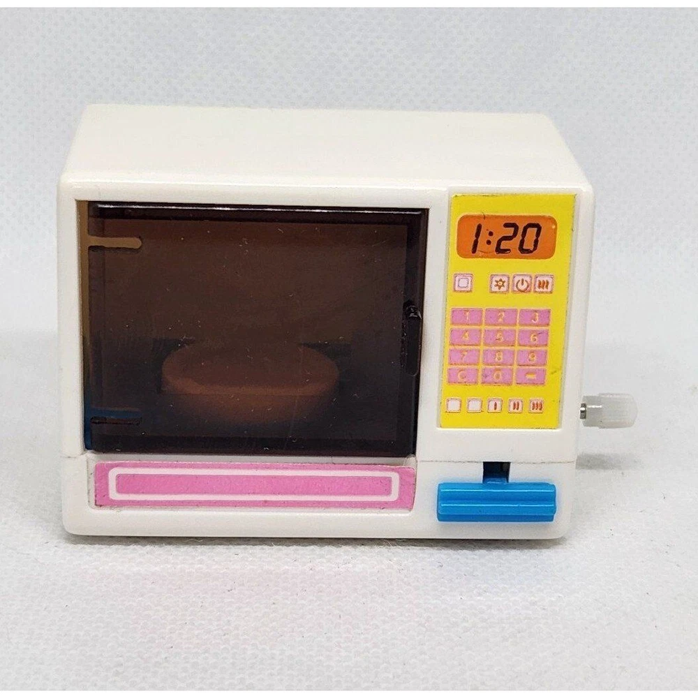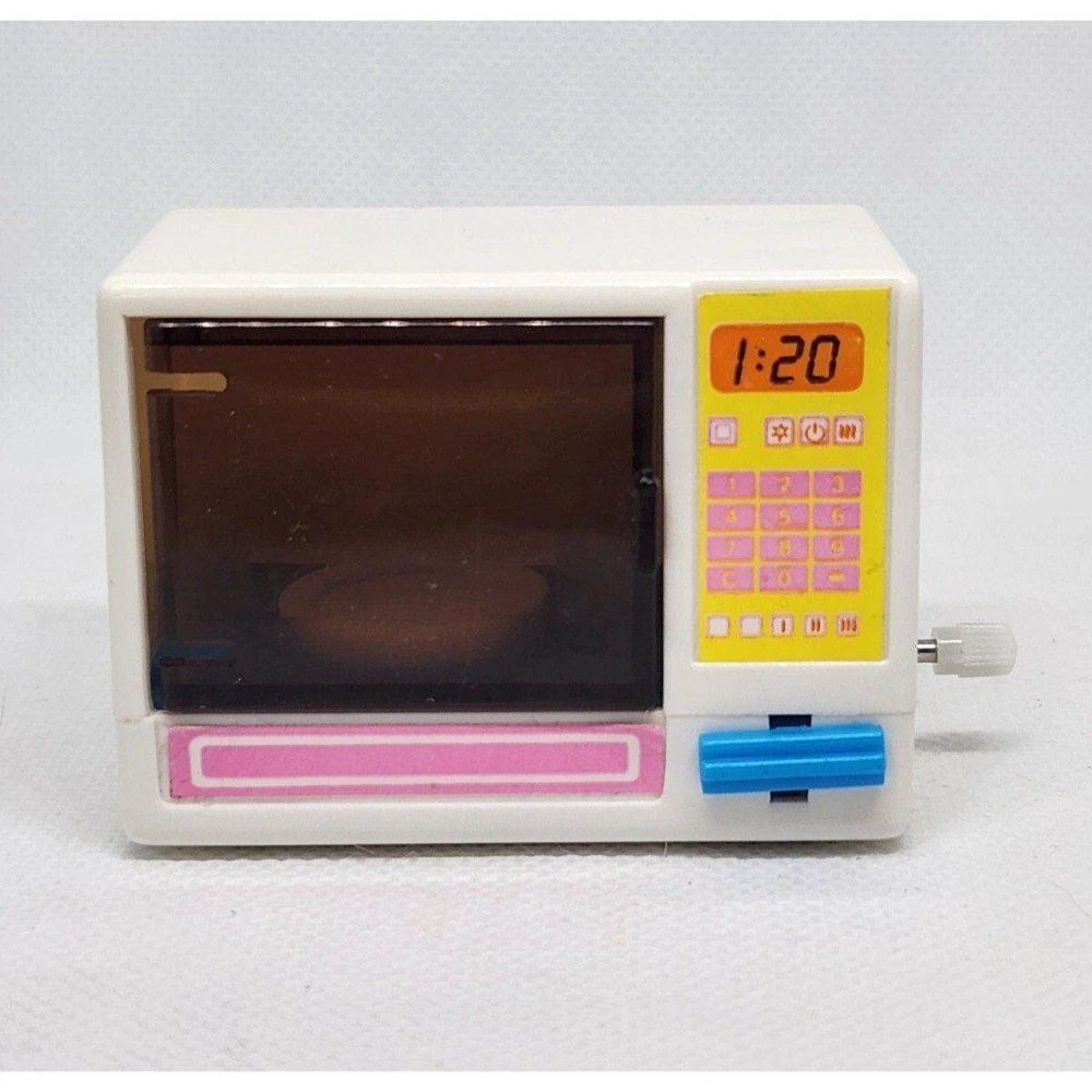 Vintage Barbie miniature wind-up microwave toy. Released in 1988. No bowl. Wind-up works. Off-white color, blue inside. Wind-up makes turn table inside move. Door opens and closes. In good condition with normal wear from age and play. Please refer to photos. Previously owned.