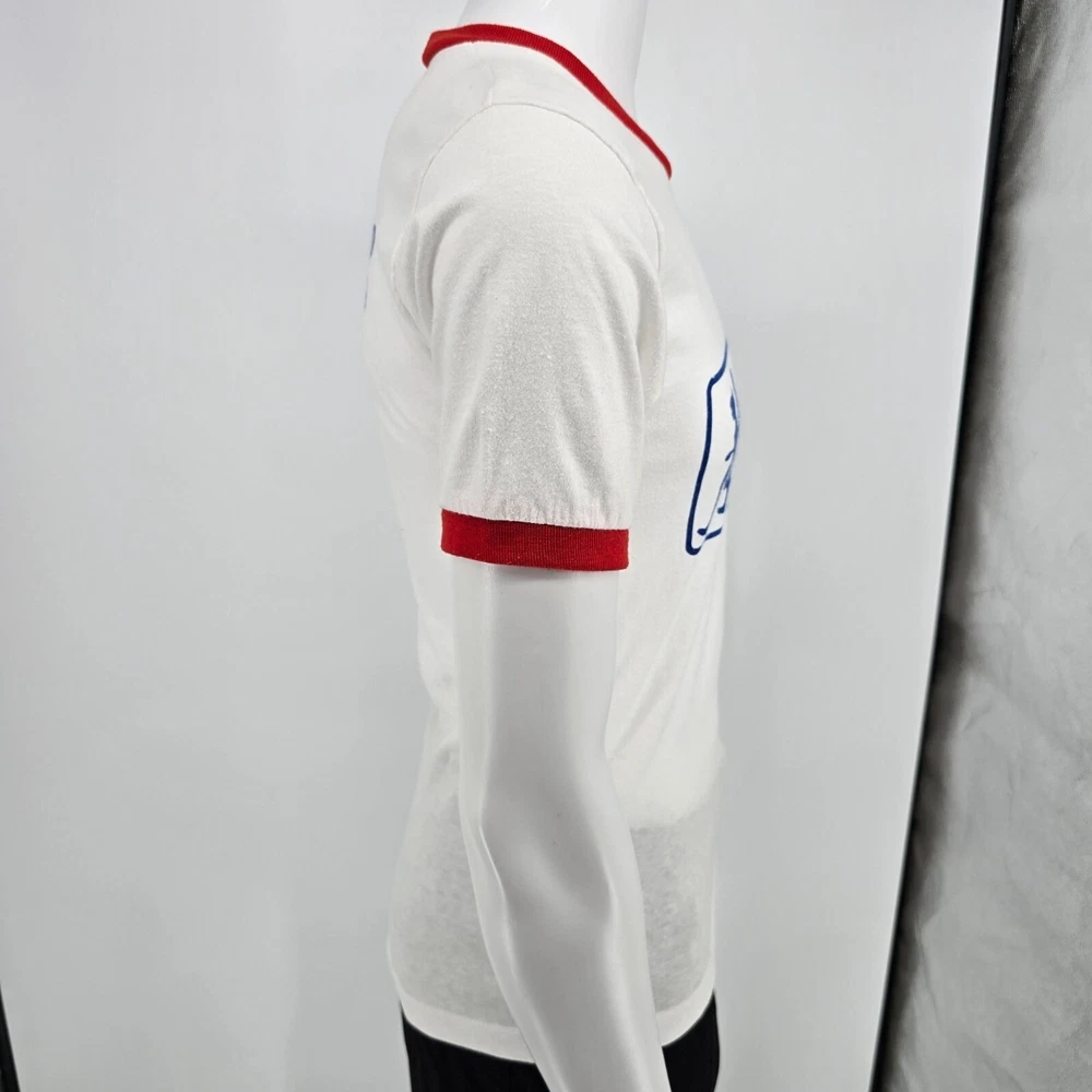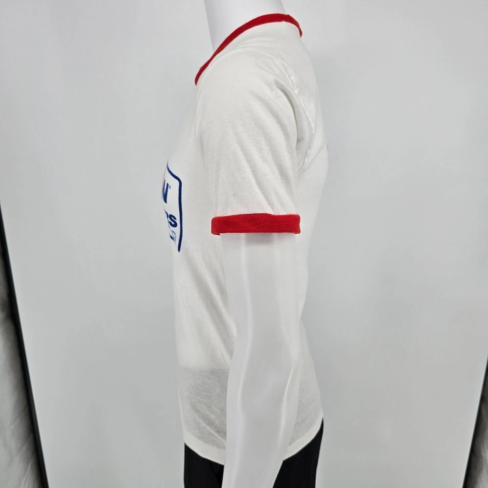 🔹 Item Details: Brand: Unknown (Tag illegible) Material: Unknown (feels like cotton/poly blend) Color: White and Red Decade of Manufacture: Early 1980s (chance of late 1970s- likely range is 1979-1982) Country of Manufacture: Unknown (almost certainly USA) Notable Features: Ringer collar and cuffs, single stitch hem Front Text: Dannon Road Runners Club Series RRCA Road Runners Club of America Back Text: Hartford 6.4 miles 🔹 Condition Notes: Good used vintage condition. Tag illegible. A few ink spots on front lower hem of t-shirt. Light to moderate fabric wear throughout. See photos for details. 🔹 Size Notes: Vintage Tag Size: Unknown Modern Measured Size: Small (34.5) 🔹 Measurements (Approximate): Chest (pit to pit): 34.5 inches Collar to Hem: 25.5 inches 🔹 Shipping & Returns: Ships worldwide from Lexington, KY. Ships within 3 business days of purchase. Returns accepted within 60 days for domestic orders and 30 days for international orders.