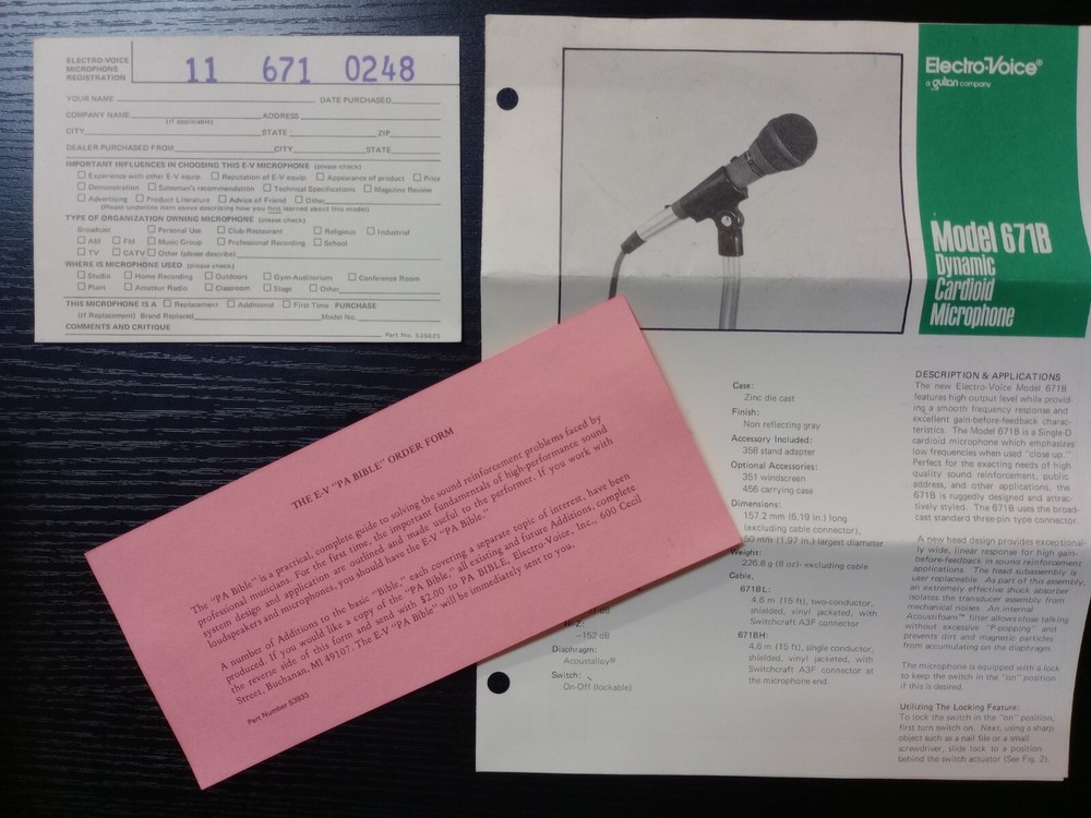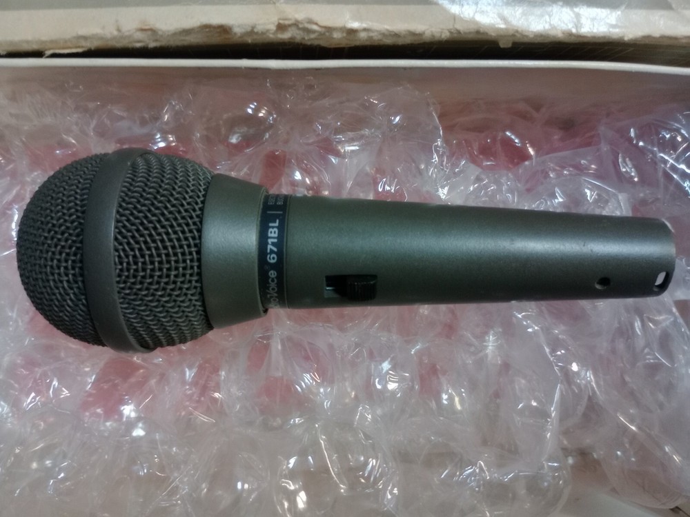 Electro-Voice EV 671BL Cardioid Dynamic Microphone Low Z Vintage 1980's *** FREE SHIPPING *** *** FREE SHIPPING *** Any questions, just ask ;) Super cool, vintage 1980's EV Microphone, with original box, paperwork, and registration card. Works great, Tested! Overview: 1980's era Electro Voice 671BL model Cardioid microphone with Low Impedance setting and perfect for singing as well as broadcasting as it was intended. This was based on the similar 671 (with chrome finish) and the 672A that had a lower pistol grip. Otherwise both microphones were basically identical. This 671BL has a very nice sound and quite strong too...100% output. The "cardioid" element has excellent uni-directional capabilities as well. A warm smooth tone that's a bit more mid range. Not as heavy on the bass as a Shure SM-58. This mic sounds very similar to the E.V 664 in low impedance.