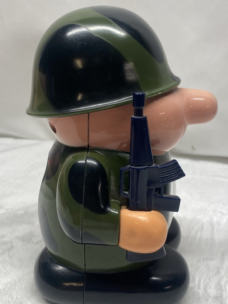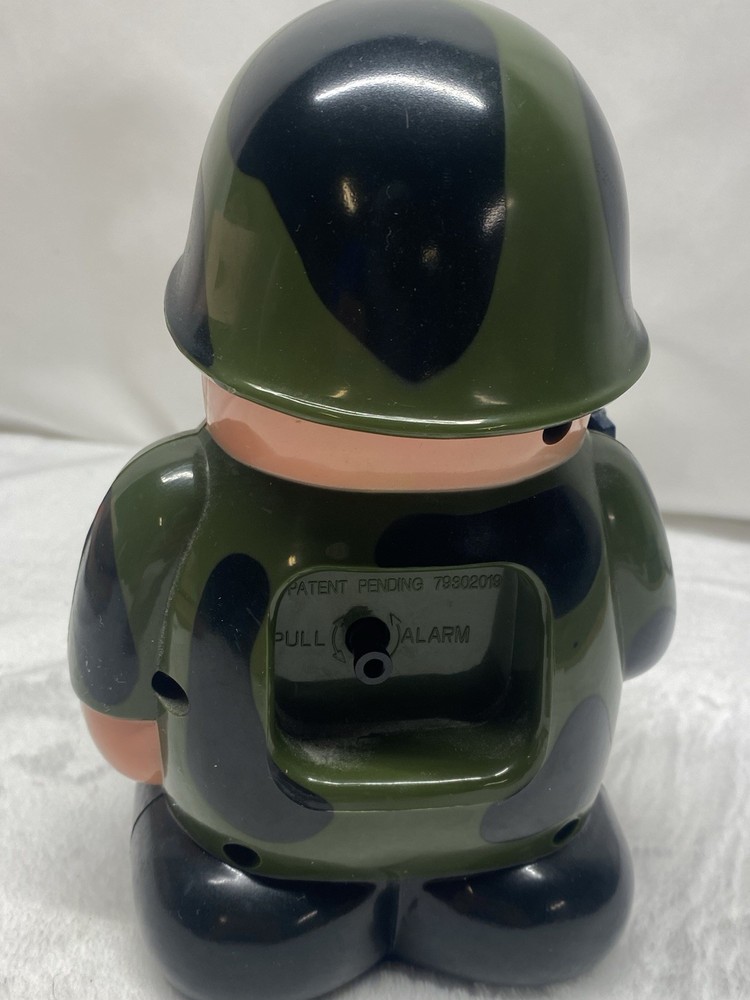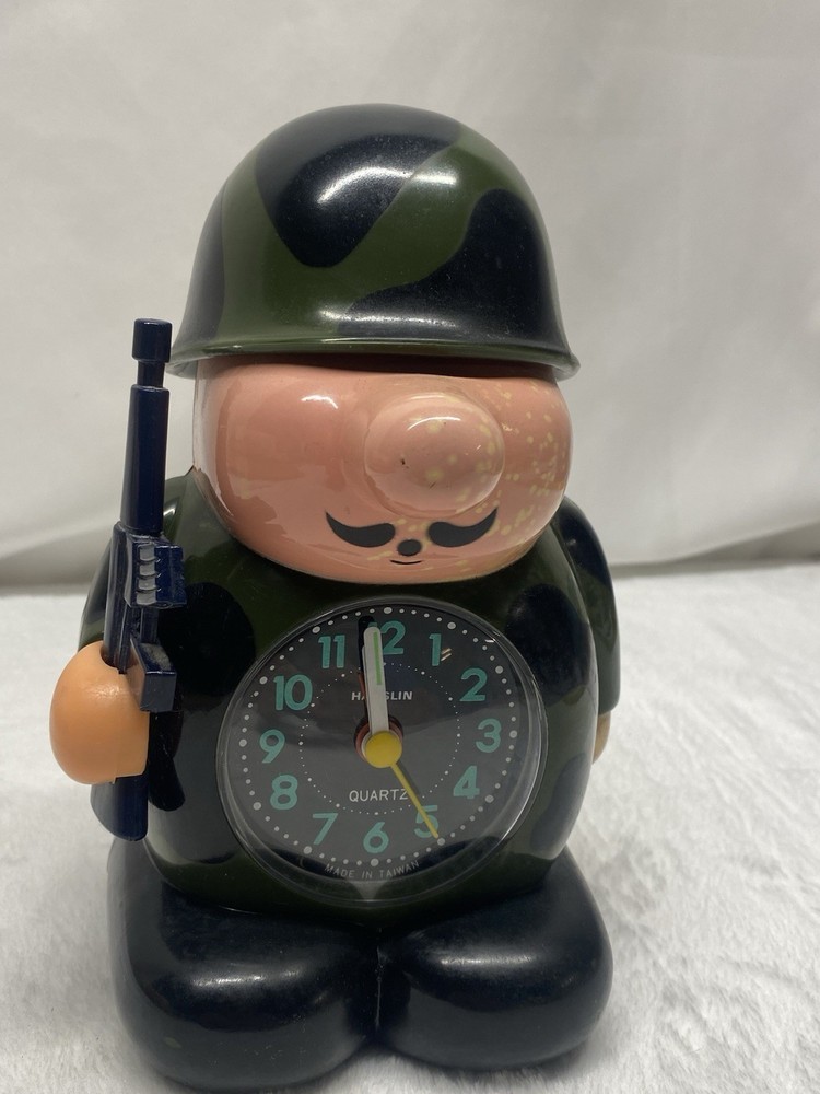 The Vintage 1980s Hanslin Mr. General Drill Sargent Army Soldier Alarm Clock features a classic quartz movement, making it both functional and collectible. This unique alarm clock, manufactured in the 1980s, showcases a quirky design with a military theme, perfect for fans of vintage memorabilia. Its multicolor plastic material adds a fun pop of color to any decor, and its battery-operated power source ensures long-lasting use. This alarm clock is a nostalgic piece that combines both practicality and charm, making it a standout addition to any collection. Battery cover is missing. Clock is not fully tested clock dose work but I’m not sure how to set the alarm
