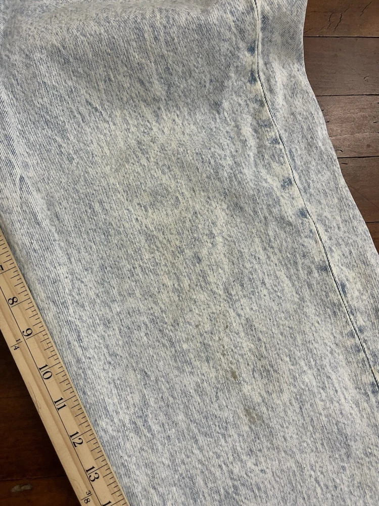 Vintage Levi’s 501 button fly jeans made in 1980! Acid wash finish and a tapered leg fit. Wash is light and there is a fair amount of staining (please refer to photos). I was able to get a significant amount of the staining out with bleach, so more could possible come out with more elbow grease than I was willing to give these. Otherwise pretty minimal distressing to the denim. I believe the original sizing was a 38 x 34 but not the waist measures between 34-35 inches and the inseam is just over 32”. More specific measurements are also in the photos. Thanks for shopping! Search words: vtg retro hippie hippy 36 Levi red tab orange tab preppy casual lighter blue as is 5 pocket relaxed silhouette
