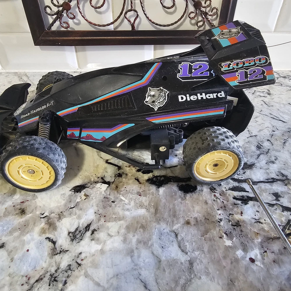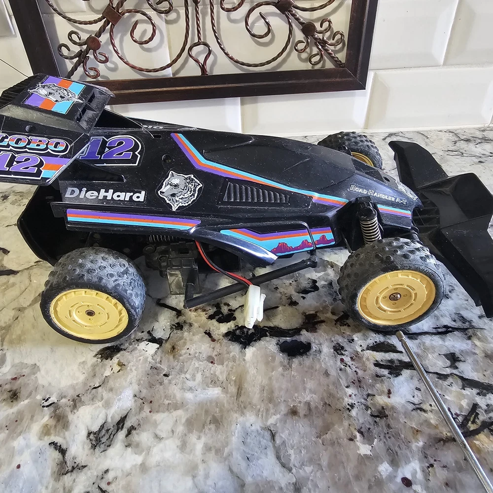 This is a vintage Nikko RC truck from 1980's, model LOBO #12 . The truck is black in color and features a brushed motor. It is a 4WD electric RC car that comes with a remote control. Please note that batteries are not included with this product. Remote turns on but not tested. Not in original box. Sold as is