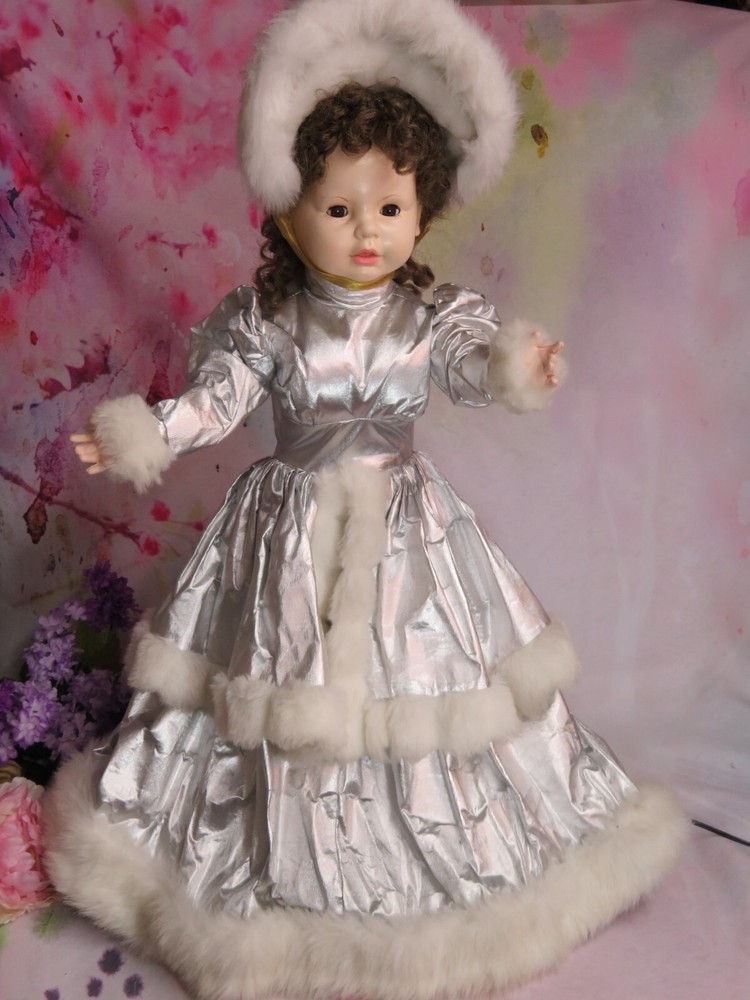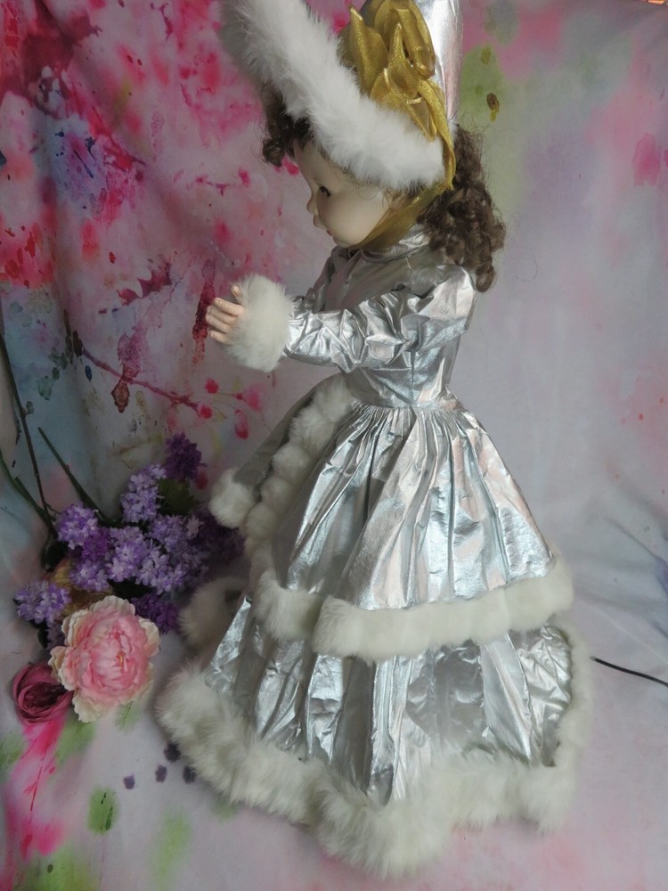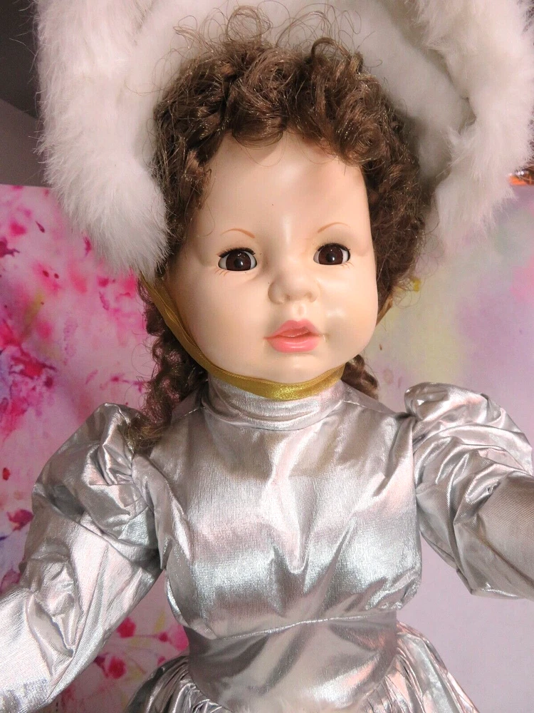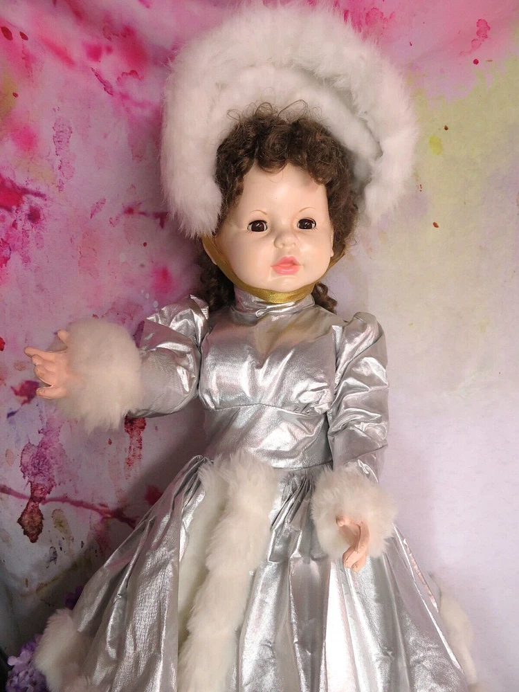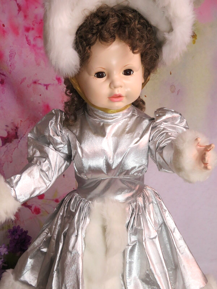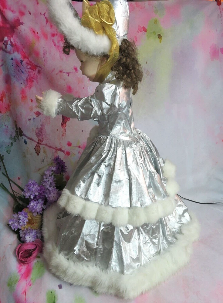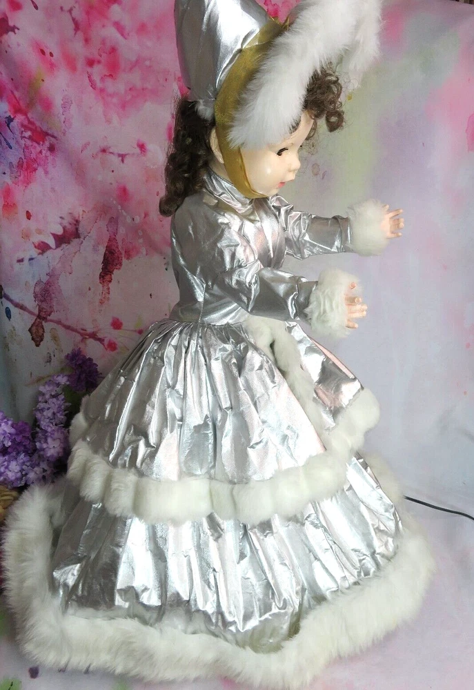 *32" tall automated Christmas girl doll/ 35" with hat *Marked on back of head; World doll 1983 and numbers *Hard plastic/ vinyl *Wearing silver metallic Victorian dress with faux fur trim and matching bonnet *Clothes are not removable *Dark curly hair, brown eyes, open and close *White shoes *Doll is attached to base *Has electric cord with plug *Head turns and one arm moves/ movements are sticky/ there is an opening to the movements in the back of the doll *Good condition, clean, sturdy *Please note that shipping may run high due to the size and weight, it is on a shipping calculator for your area I sell a variety of items of which I am not an expert on, please view all photos, they are the major part of the description. The written description is based on my opinion and observation of the item.I do my best, if you have another opinion please feel free to let me know, additional knowledge is always appreciated. Measurements are approximate. The listing is for the items described only, props and display items are not included. THANKS FOR BIDDING!! Check out my other items !Be sure to add me to your favorites list ! Sign up for my email newsletters by adding my eBay Store to your Favorites *Payment accepted; Paypal *Item shipped by USPS *Item shipped within 1 business day of receipt of payment *Combined shipping available *Standard shipping and handling fees for the USA are posted so you know before you bid what the cost will be *Please email for international shipping estimates. VINTAGE & ANTIQUE ITEMS ARE SOLD AS IS, there may be flaws due to age, if you want new condition please buy a new item. I try to note any obvious damage or flaws but there may be flaws or damage not noticed on initial inspection. I do not take anything apart or check every hidden fold. I DO NOT GIVE AFTER PURCHASE DISCOUNTS, there is a return policy. Note: Items "new with tags" may have been display models, overstock or self pulls, they have been in the retail environment and while they are new, they may have been handled by customers. There is a chance they might have minor cosmetic conditions from being handled or tried on. This is the reason you can purchase a high quality item for a VERY low price.
