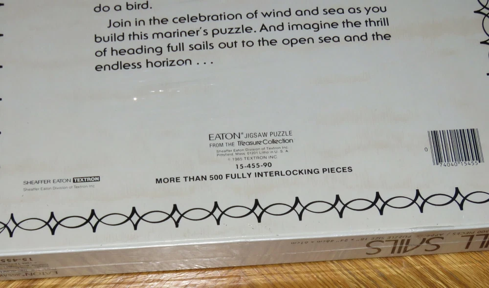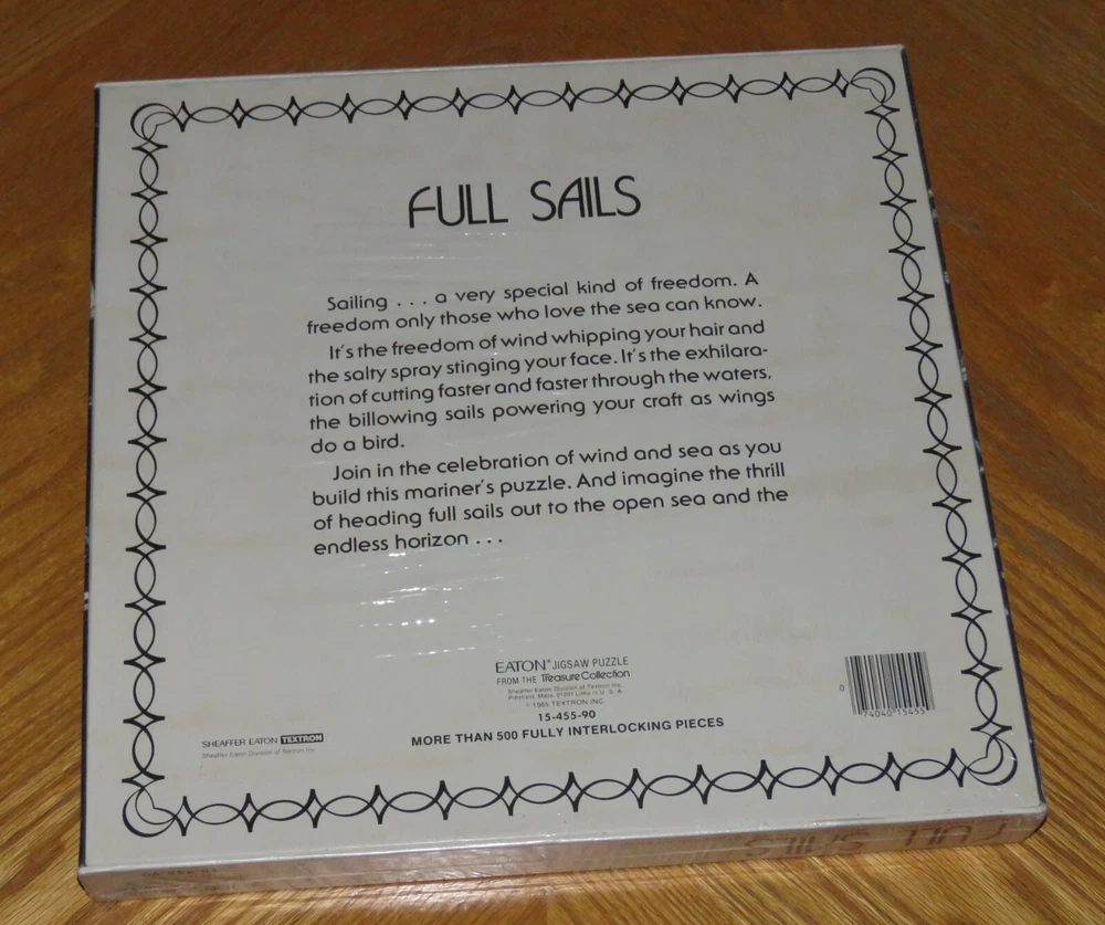 Vintage Factory Sealed Puzzle "Full Sails" No.15-455-90 Over 500 Pieces Finished Size: 18" x 24" Made in U.S.A.©1985 Sheaffer Eaton, Textron Inc. Pictures are of the actual puzzle you will receive. Will be shipped in a box. Package weighs over 2 pounds.