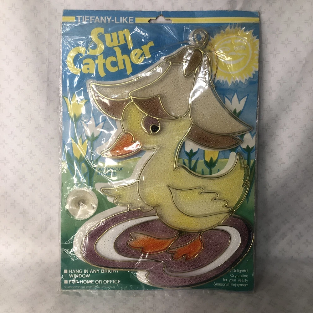 Add a touch of vintage charm to your home decor with this Tiffany-Like Duck Sun Catcher from 1986. This decorative suncatcher features a beautiful design that is sure to catch the eye of anyone who sees it. It is perfect for adding a cozy and welcoming atmosphere to any room in your home. Crafted with care, this suncatcher is a great addition to your collection of decorative accessories. It is a perfect gift for your loved ones or a nice treat for yourself. The duck design is whimsical and playful, making it a great addition to any space. This suncatcher is a great way to bring a touch of nature into your home. ** as seen in photos ,, yellow is faded in the duck design.