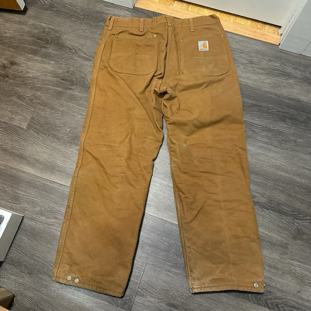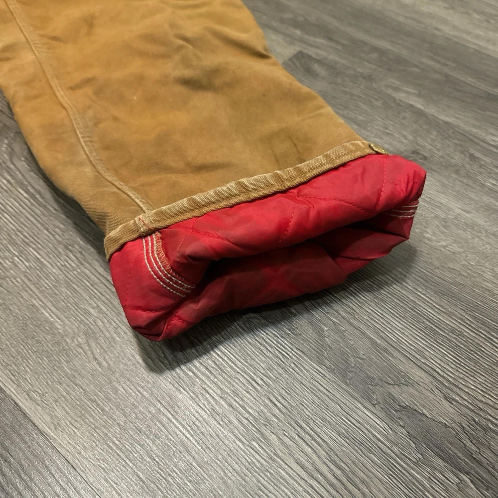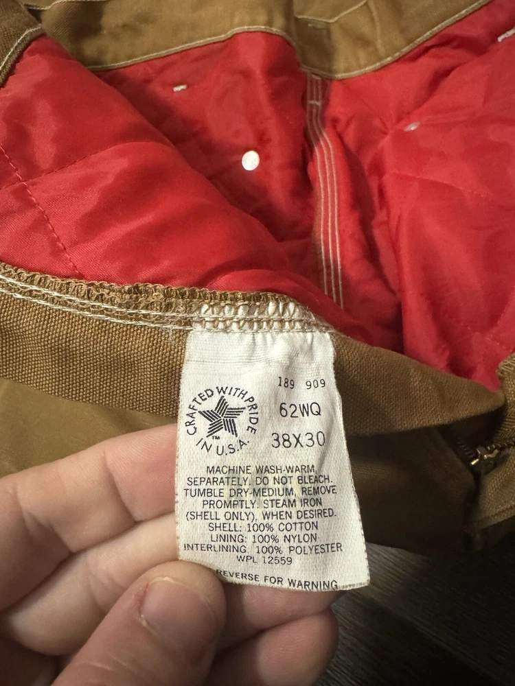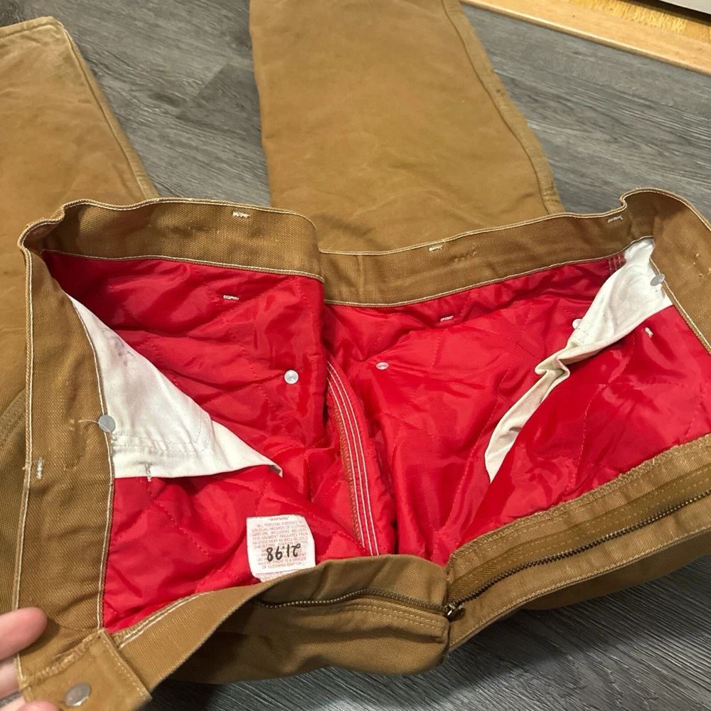 Vintage 1989 CARHARTT Tan Workwear Jeans Pants USAMade Red Quilted Lining Union Vintage 1989 Carhartt Lined Pants 100 Years Tagged Size 38x30 measurements fit 36x30 Great Fade & Wear & Stains Shown #carhartt #lined #vintage