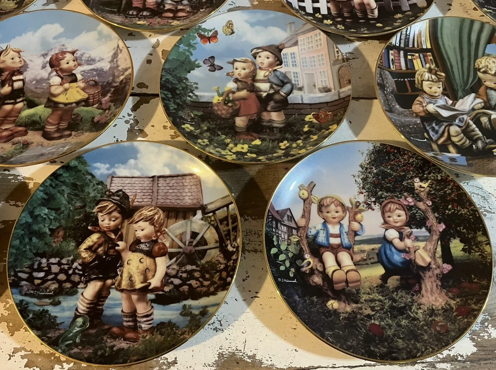 This is a vintage set of 12 collector plates from The Danbury Mint, featuring the M.I. Hummel Little Companions series. Each plate showcases a different scene of children, and is part of a product line that has become popular among collectors. The plates are a great addition to any decorative collectibles or collector plate collection. All plates are limited edition and part of a series that was only made for 14 firing days back in 1990. Each plate is numbered as well, helping to make this collection even more of a significant part of your collection. Each plate comes in its original packing as well, to help keep these plates safe during shipping as well as safe in your home when being stored as well. 1. Squeaky Clean 2. Private Parade 3. Tender Loving Care 4. Stormy Weather 5. Little Explorers 6. Hello Down There 7. Country Crossroads 8. Surprise 9. Apple Tree Boy & Girl 10. Budding Scholars 11. Come Back Soon 12. Little Musicians