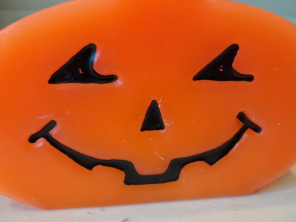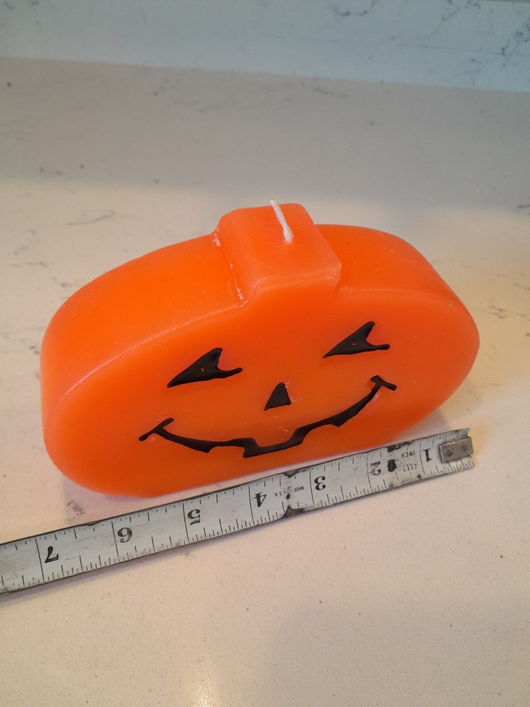 Add some spooky flair to your Halloween decor with this vintage 1990s smiling pumpkin jack o lantern candle. Measuring 6 inches tall, this candle is made of wax and features a vibrant orange color that's perfect for the season. Whether you're looking for a unique addition to your collection of holiday collectibles or simply want to add some ambiance to your home, this candle is sure to fit the bill. As a bonus, this candle was manufactured during the 90s and is not handmade. It's a perfect piece for collectors who are looking for something unique to add to their collection. Don't miss out on the chance to own this festive and fun vintage Halloween candle.