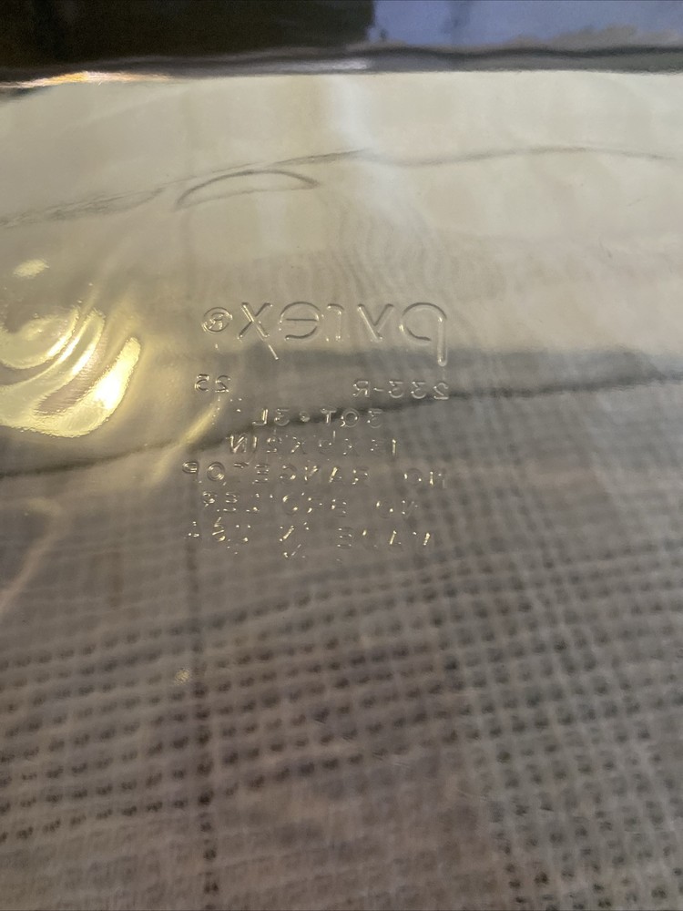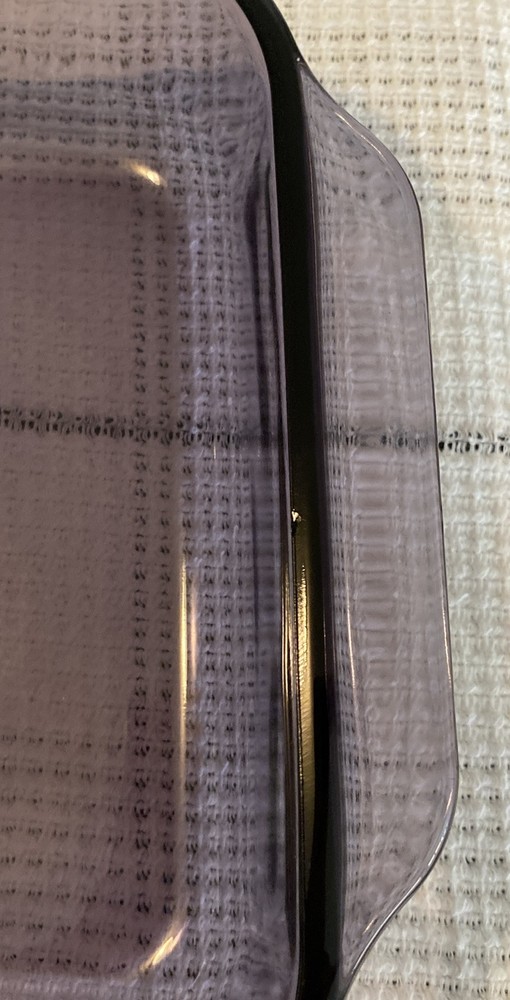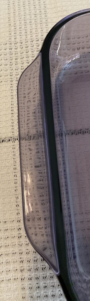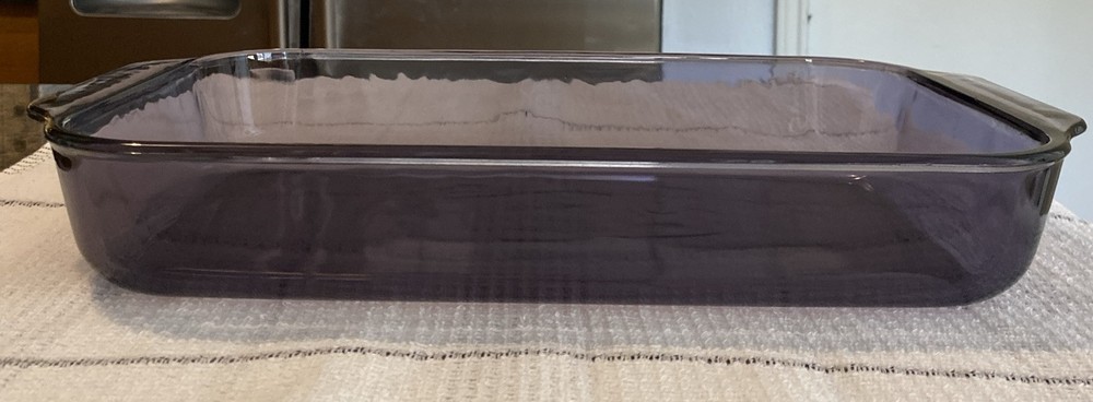 This vintage Pyrex baking dish is a beautiful amethyst purple color and measures 15 1/4 inches in length, 9 3/8 inches in width, and 2 1/4 inches in depth. It has a capacity of 3 quarts and is made of fused glass with a glossy finish. The dish features handles and has a solid pattern. This Pyrex casserole dish is an original vintage piece from the 1990s and is in excellent condition. It is an ideal dish for baking and serves as a decorative piece for your home.