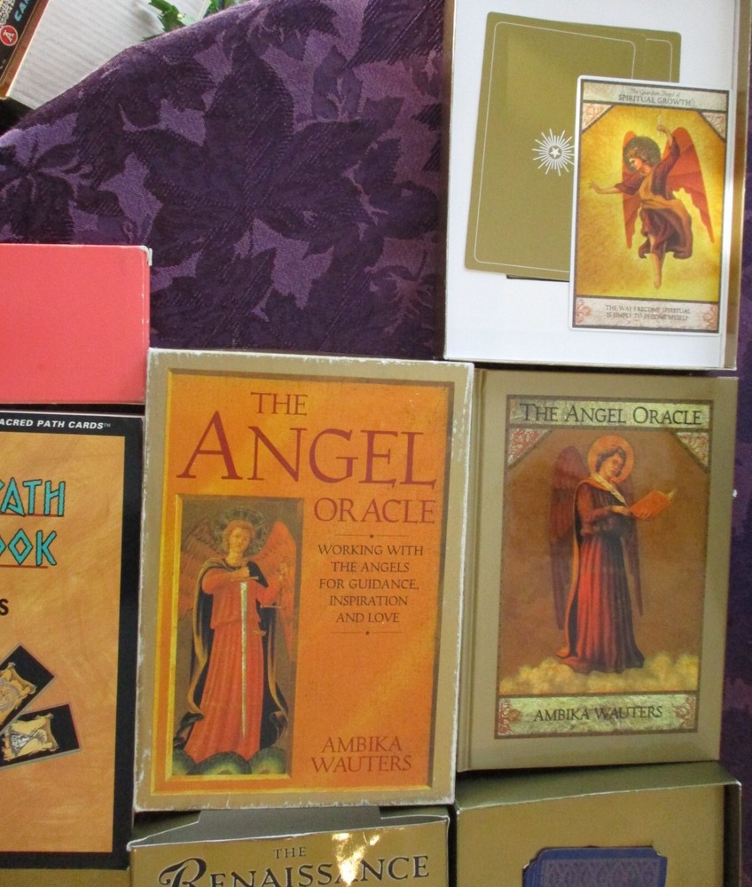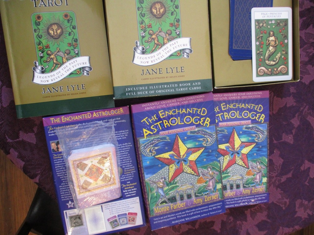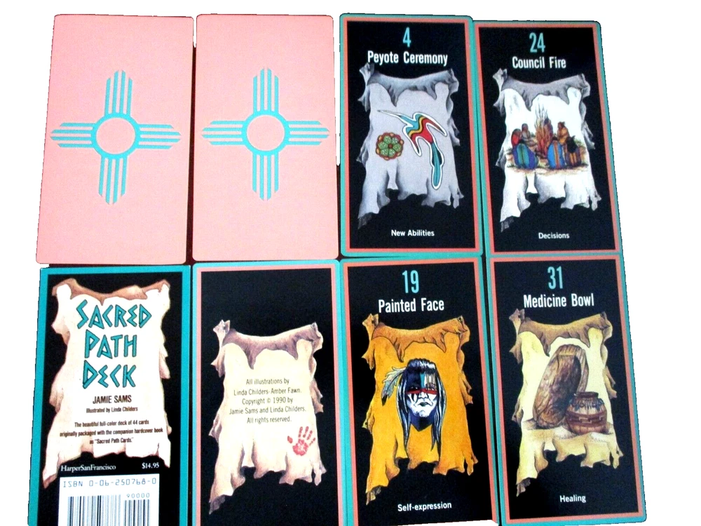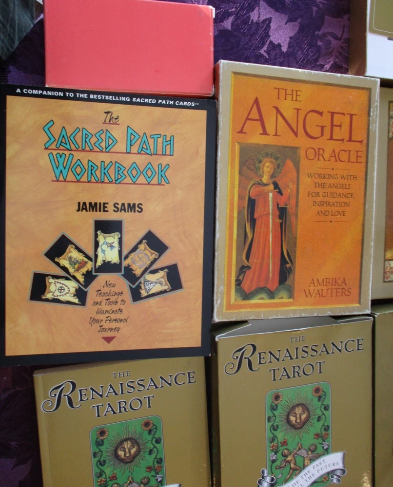 vintage 1990s Box Set Lot 4 Tarot Oracle Astrology sets books and cards Beautiful deck of 44 cards and 286 pg. book with explanation and uses for oracle readings, journaling and guidance based on Native American teachings of the Seneca Wolf Clan. You receive the Complete Sacred Path deck, unused, original box & Workbook 1991 Jamie Sams. First edition book. Very minor storage wear on book cover and card edges, Very good collectable condition. The Renaissance Tarot by Jane Lyle. Complete boxed set. Good condition, non smoking, pet free home.192 pg. book, + 78 card deck. The Enchanted Astrologer - Beautiful illustrations & great companion book. Minor wear on box.. Set of 36 full color cards, 200 page book and original box. First edition 2001. Unused. The Angel Oracle Amber Wauters book and deck 2 cards missing. good condition.. Ships from Canada no refunds no returns. I have many 90s and older vintage metaphysical books and decks listed please look.