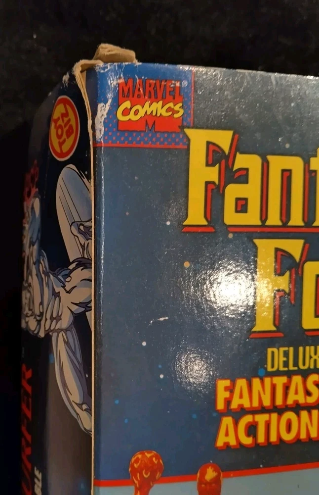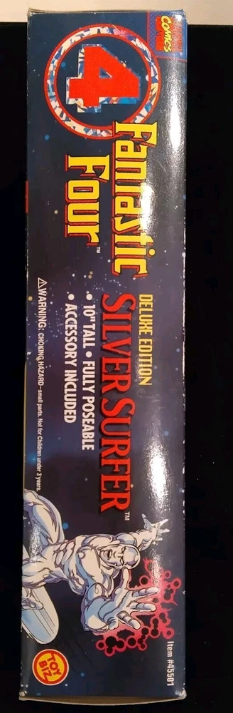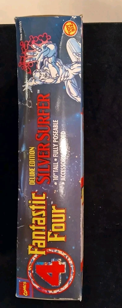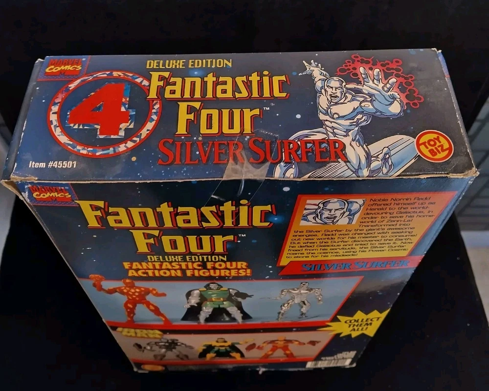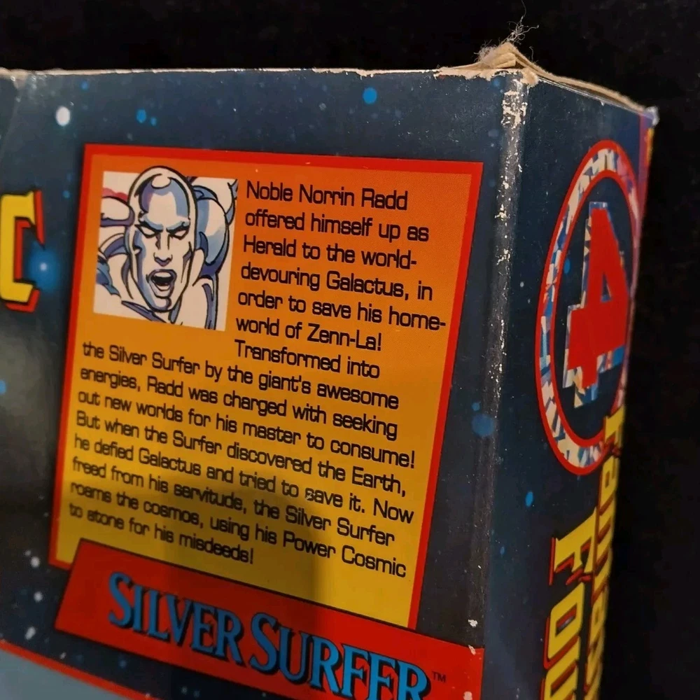 This vintage Toy Biz Marvel Fantastic Four Silver Surfer Action Figure is a must-have for any comic book hero collector. This 1st edition, boxed figure features the iconic Silver Surfer character from the Fantastic Four TV show and movie franchise. The figure stands at 10 inches tall and is made of high-quality plastic material with a silver color finish. The action figure is a licensed reproduction from the original 1994 Toy Biz collection and is perfect for fans of the Fantastic Four series. This item includes a helmet and surfboard, and is suitable for ages 8-11 years. Don't miss your chance to own a piece of Marvel history with this original Silver Surfer action figure. There is some damage to box, the plastic has separated from cardboard on one side. Please see photos for exact condition.