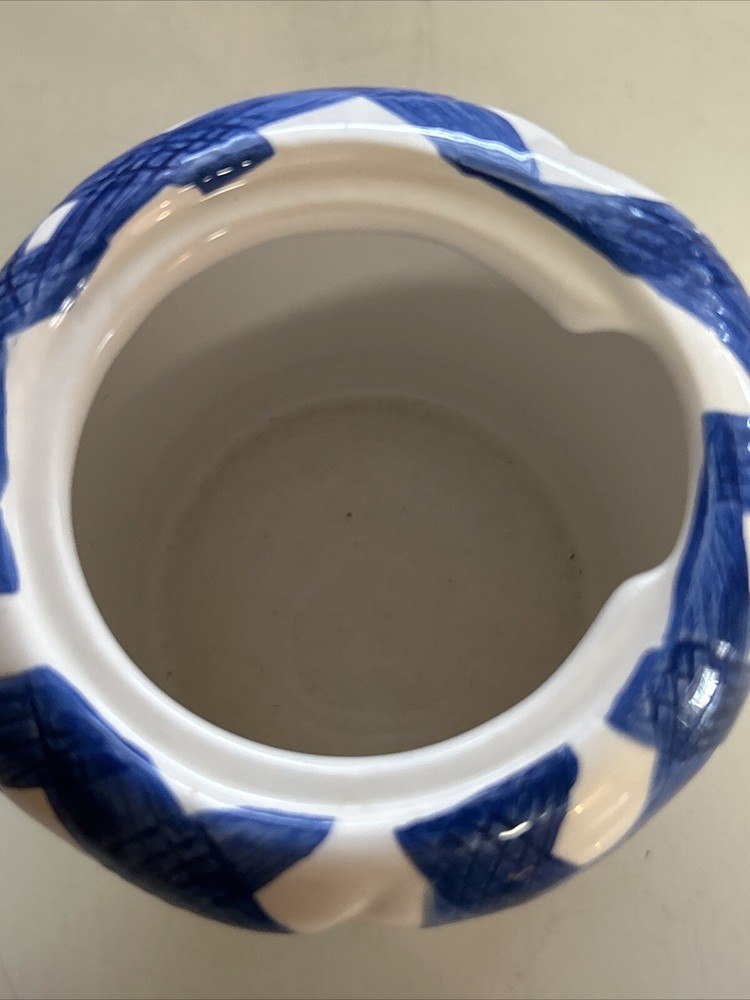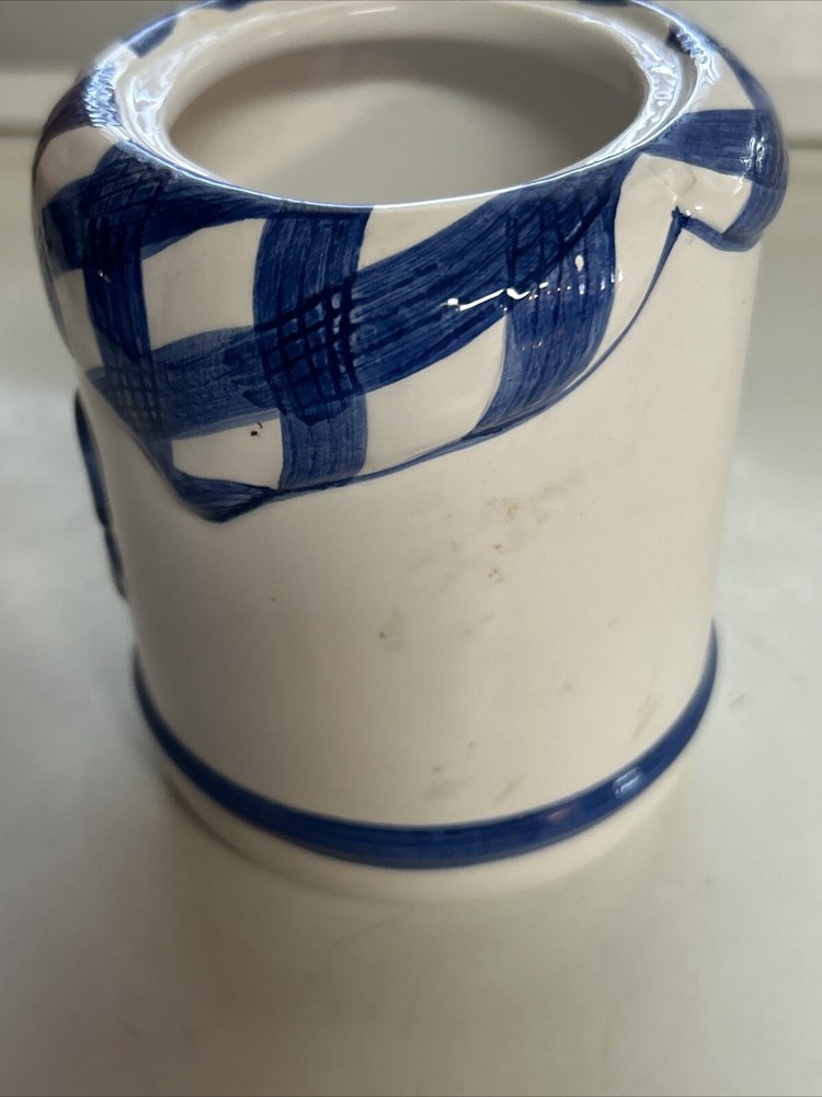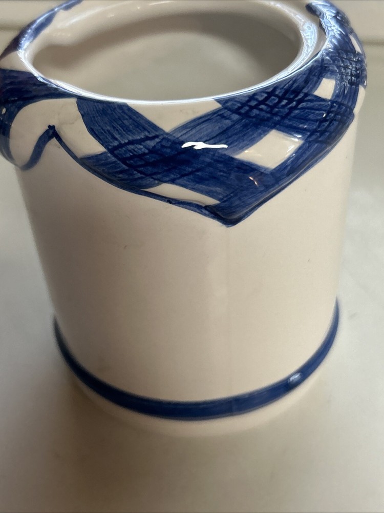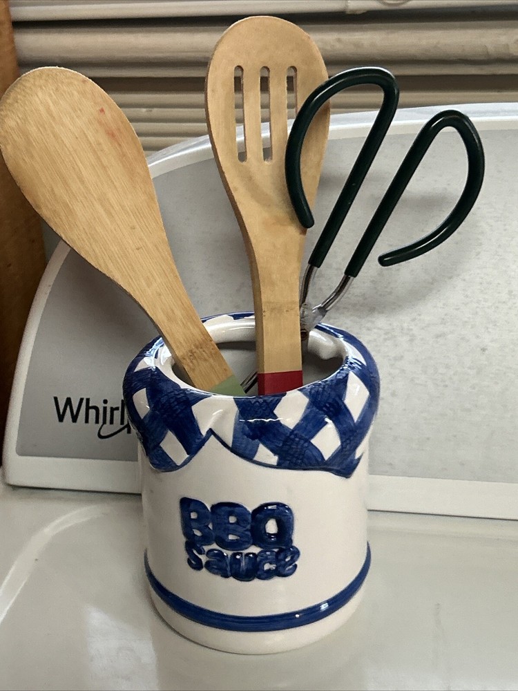 This vintage ceramic BBQ jar from Lotus is perfect for holding your cooking and grill tools, or even your favorite barbecue sauce. The blue color and ceramic material give it a unique and rustic look that will complement any outdoor space. Measuring 4 inches in width and 4.75 inches in height, this jar is both practical and stylish. It's a great addition to any home or garden, and is sure to impress your guests at your next outdoor gathering. The jar comes with a ceramic handle and is made in China. Whether you're a professional chef or just enjoy cooking and entertaining, this BBQ tool holder or sauce holder is a must-have. You can self personalize it for cute gift ideas by using a paint marker ! Perfect for that special griller in the family. Excellent condition **. Utensils NOT INCLUDED USED FOR STAGING purposes ONLY*****