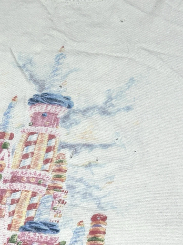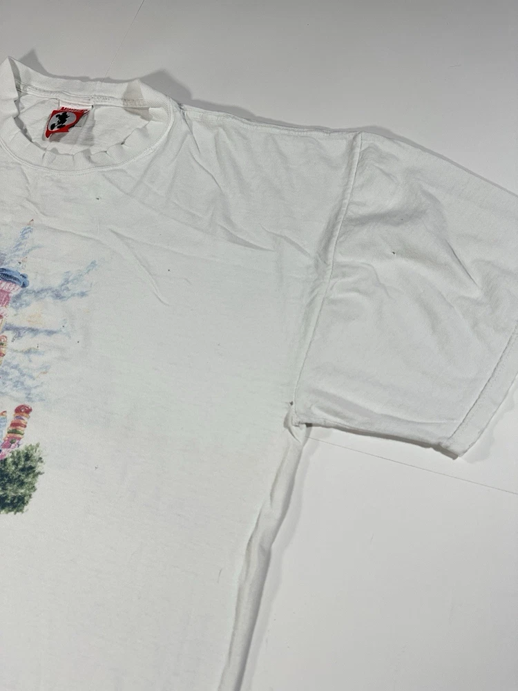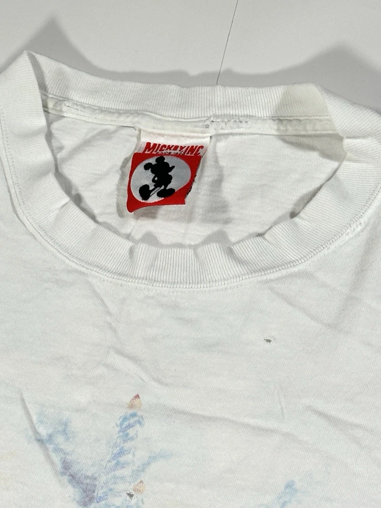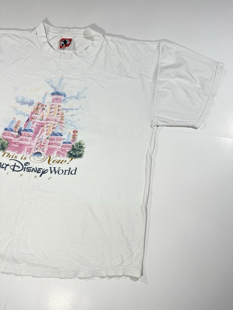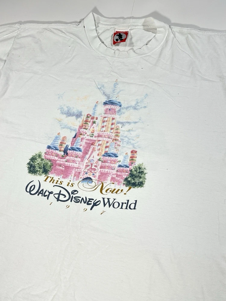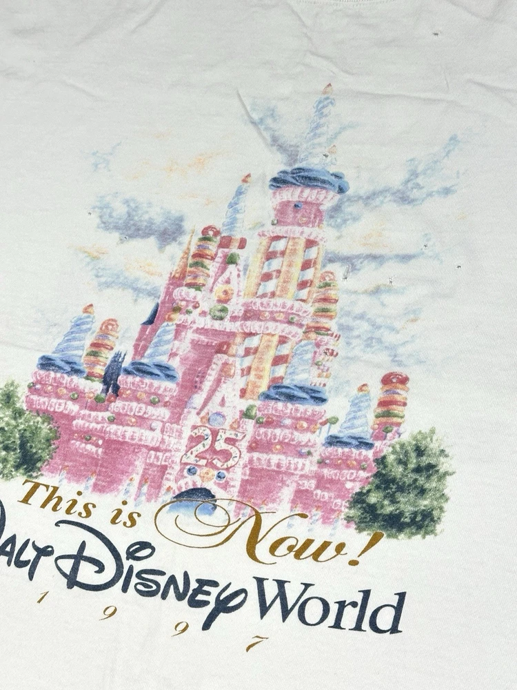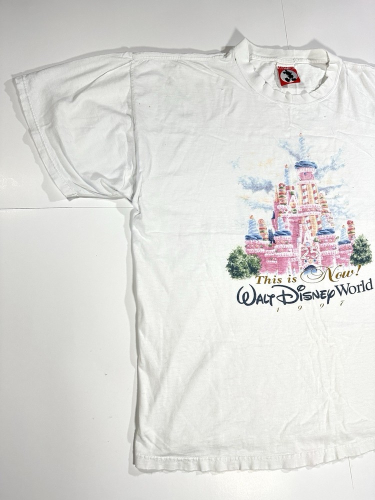 Vintage Walt Disney World 25 That Was Then This Is Now Castle 1997 T-Shirt Sz XL Okay - to - kinda poor condition overall - distressed vintage disney shirt - see ALL photos very closely See photos for measurements Shirt has moderate- pretty heavy wear/tear overall throughout - some discoloration/fade in while color throughout - some series of pinholes throughout front side of the tee - mostly mid - upper portion on front side - on sleeves - around collar - some light small little marks/spots on front side - near sleeve / little by graphic - trim(s) around shirt has moderate heavy stressing - distressed vintage disney tee - worn used tee - see ALL photos very closely for condition of the shirt Will ship with care