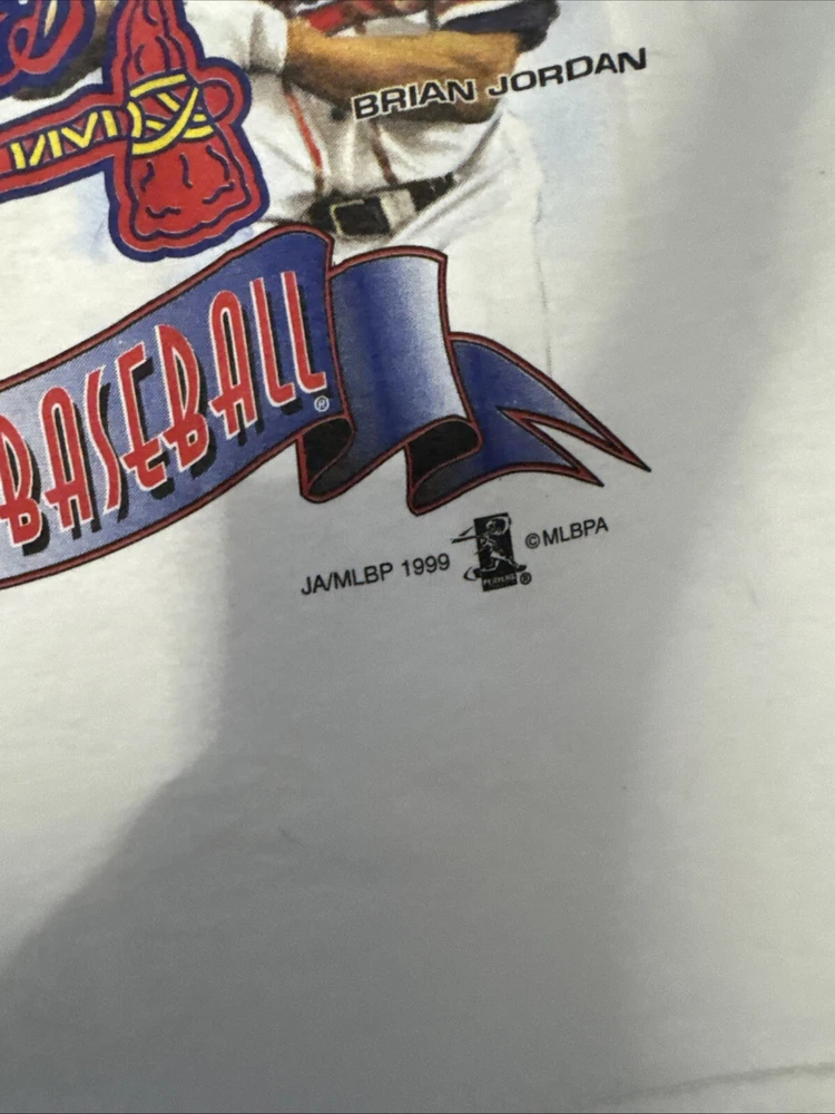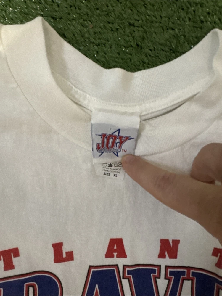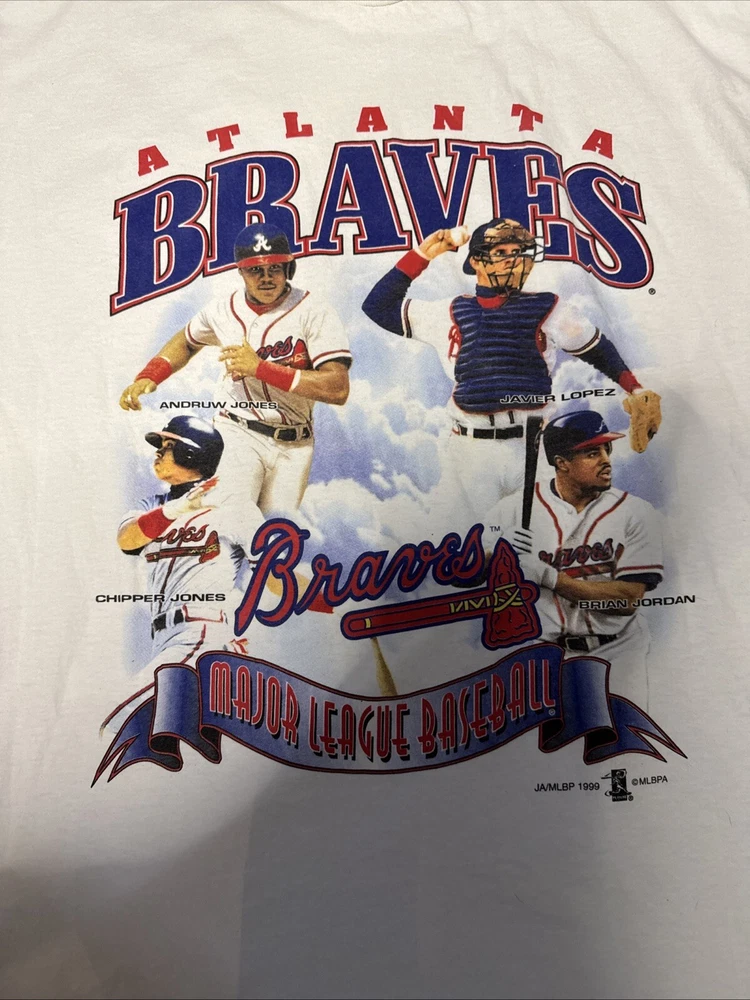 Show off your love for the Atlanta Braves with this vintage 1998 MLB T-shirt featuring Chipper Jones and Andruw Jones. Made by Joy Athletics, this white cotton crew neck T-shirt is a size XL and has a regular fit. The short sleeves and all-season features make it perfect for any fan who wants to show their support for the team. This T-shirt is easy to care for and has a classic 90s sports theme that any baseball fan will love. It's made in Mexico and has the MLB and Atlanta Braves character family. Whether you're watching a game or out and about, this T-shirt is a great way to show your team spirit. Measurements 23x30
