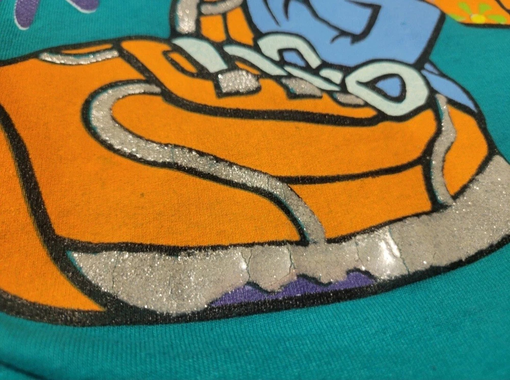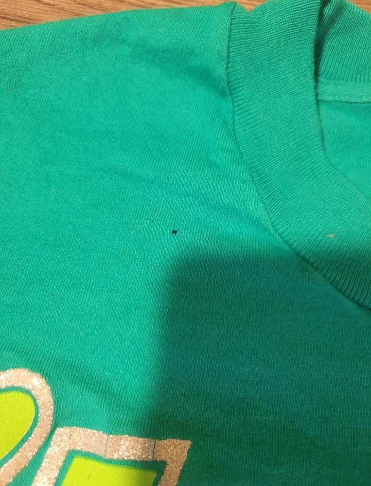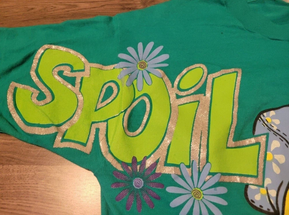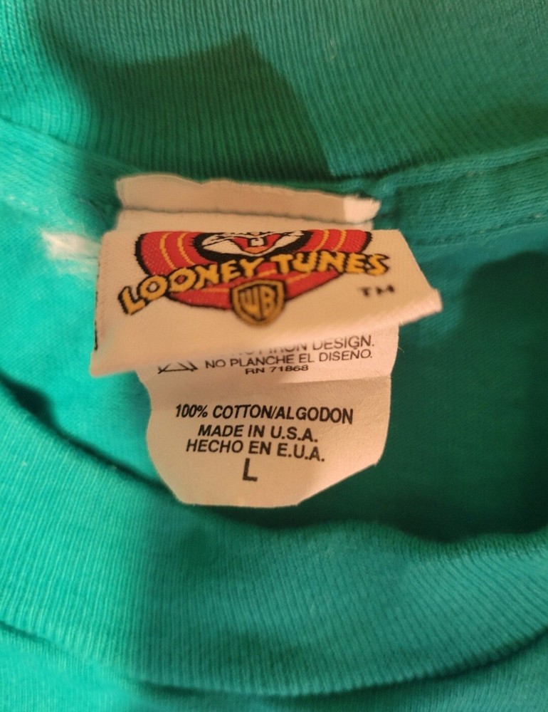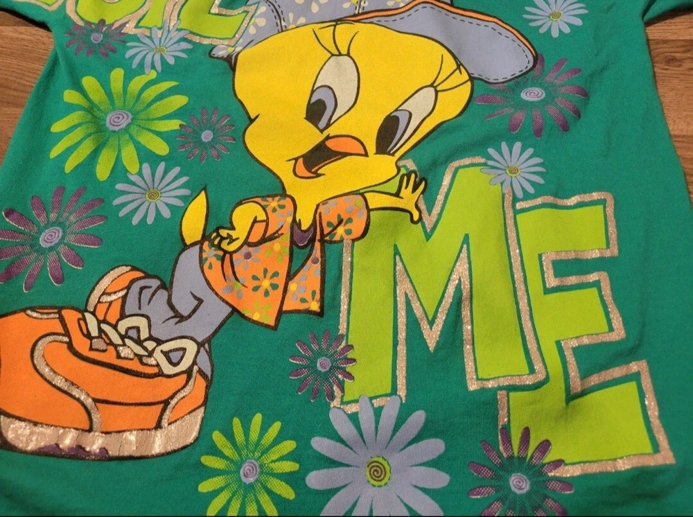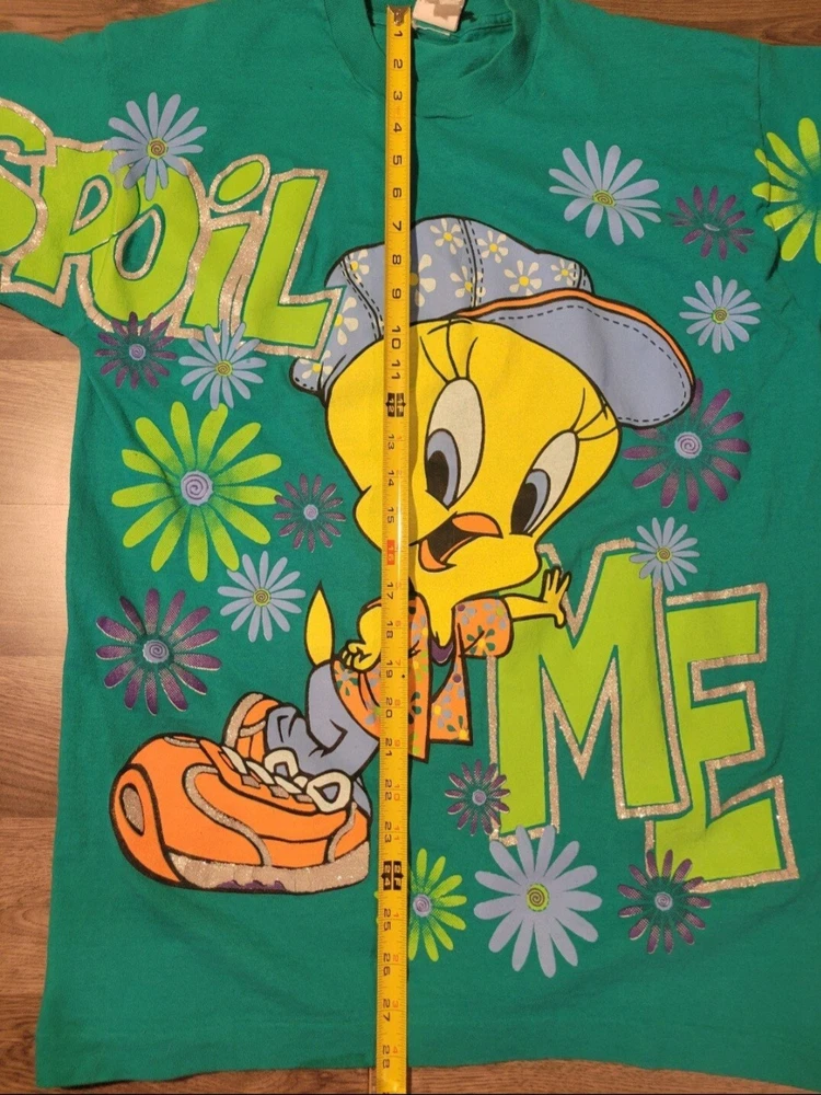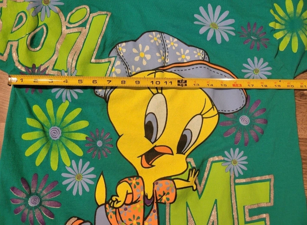 Vintage 1998 Looney Tunes Tweety Bird Spoil Me shirt. Huge print across front and sleeves. Single stitched. Tealish green colored shirt. Size Large, measures approx 20" chest x 28" length. Please use measurements provided for approximate size. Has a small pinhole near collar, see picture.