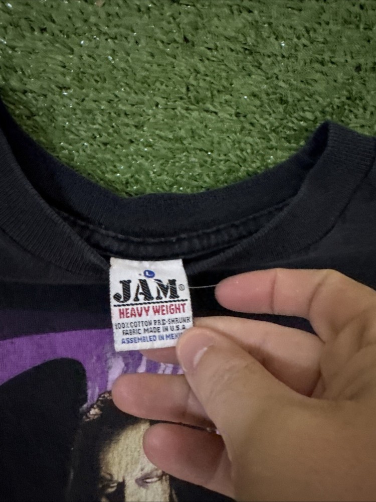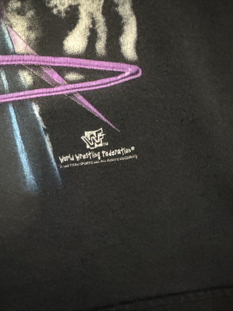This vintage WWF t-shirt from the late '90s features The Undertaker and a classic box logo. Made from comfortable, black cotton knit fabric, this shirt is perfect for any wrestling fan or collector. The crew neck and short sleeves make it a versatile piece for any season. The shirt is a size L and has a regular fit, with no personalization. It was manufactured in Mexico and is an authentic piece from the WWF/WWE era. Whether you're a fan of wrestling or just love the '90s sports theme, this t-shirt is a must-have addition to your collection. Measurements 22x27