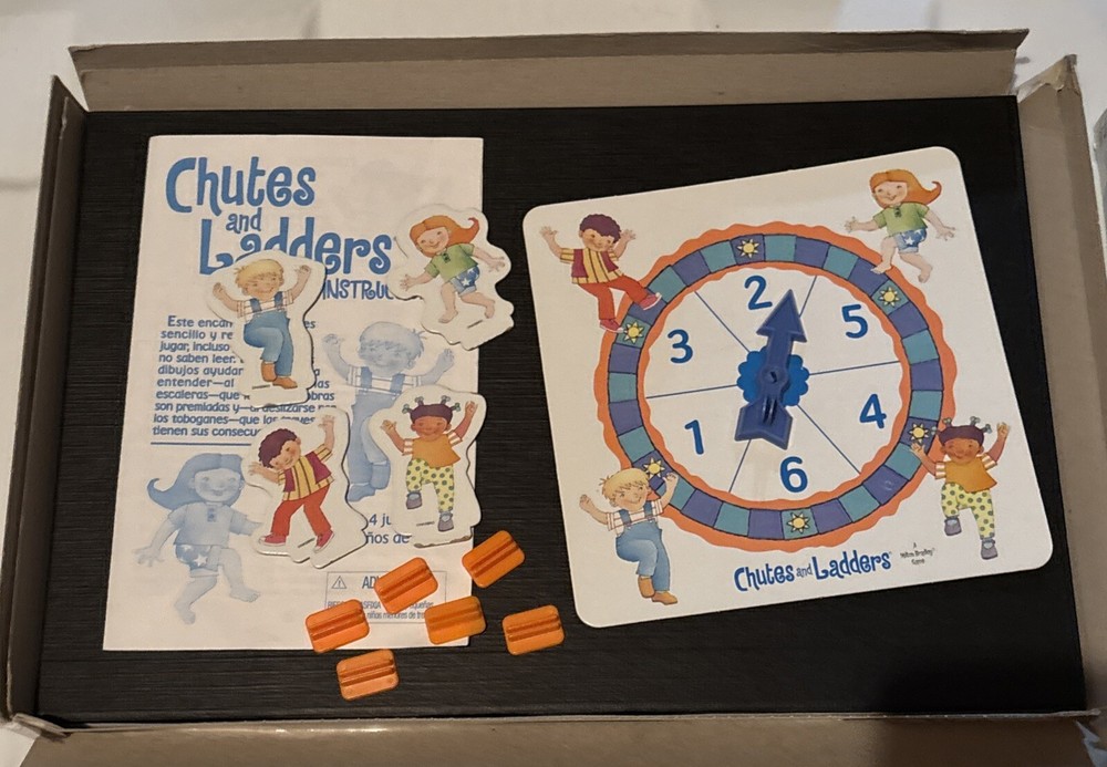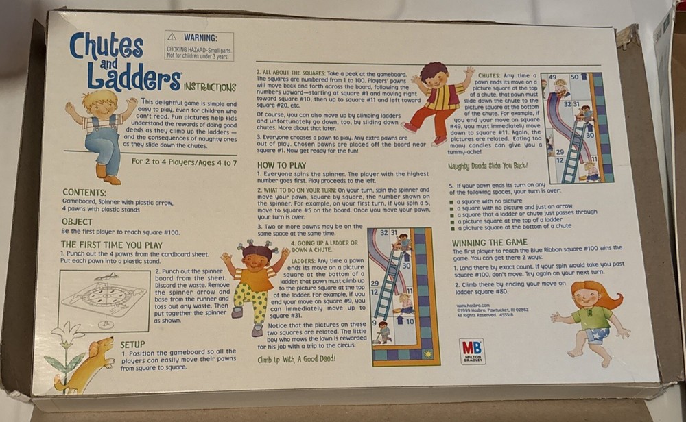Character Family:HasbroBrand:Milton BradleyAward:N/AFeatures:N/Agtin13:0032244045554Game Type:Board GameUPC:0032244045554Custom Bundle:NoYear:1999Gender:Boys & GirlsAge Level:4-7Recommended Age Range:4-7Game Title:Chutes and LaddersType:Complete GameMPN:4555Theme:GameModified Item:NoMin. Number of Players:2 players