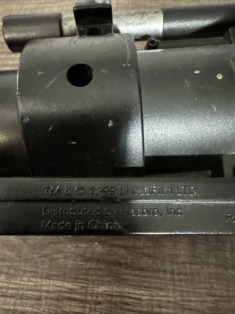 The Vintage 1999 Stars Wars Lights And Sounds Toy Rifle by Lucas Films Works is a collectible toy from the VI: Return of the Jedi movie. Produced by Hasbro for Star Wars Celebration in 1999, this rifle features lights and sounds that add to the immersive sci-fi experience. Being a vintage item, it holds value among collectors of Star Wars memorabilia and is a sought-after piece for fans of the franchise.