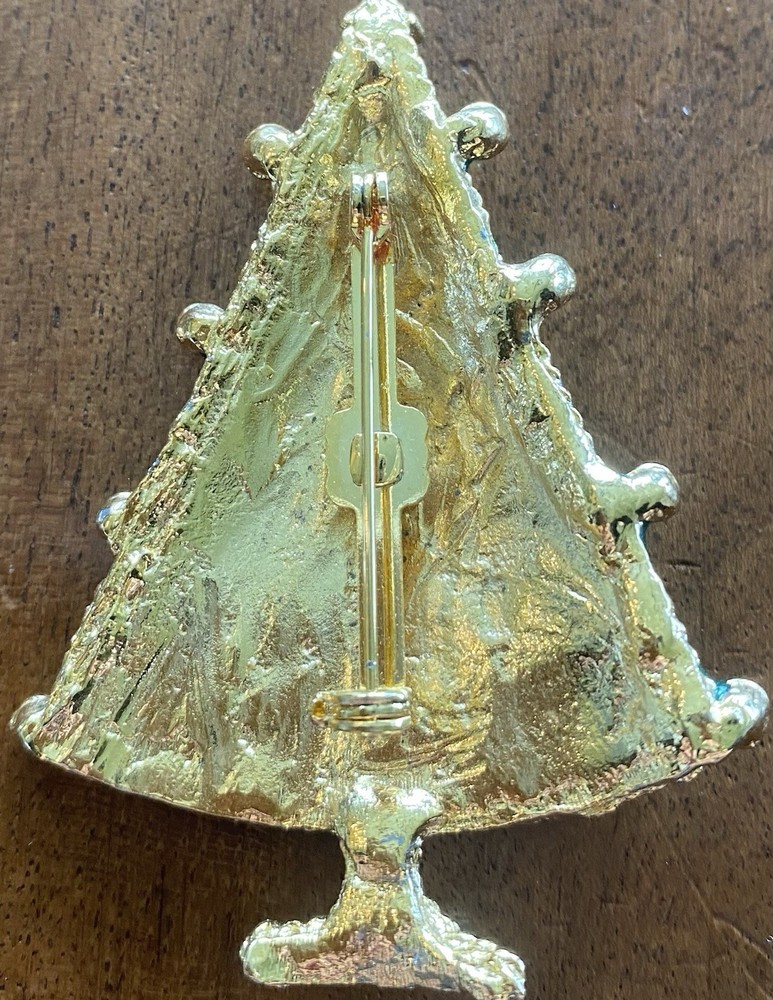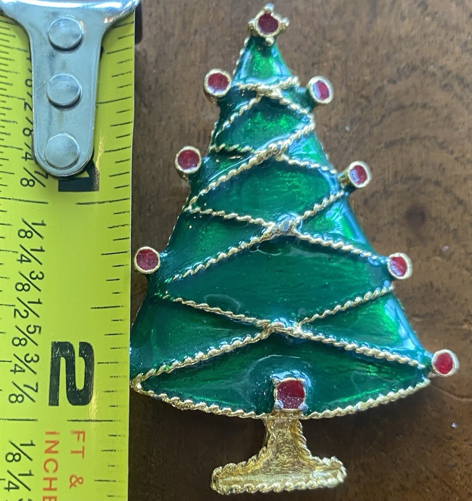 This vintage 2 1/2” Gold Tone Christmas Tree Brooch Pin features red and green enamel accents. It is a festive and elegant accessory for the holiday season. The brooch is of retro design, perfect for anyone who appreciates classic vintage jewelry. The Christmas tree shape adds a playful and whimsical touch to the overall design, making it a standout piece in any jewelry collection. Smoke free, pet free home. Always combined shipping. Shipped by USPS Ground Advantage.