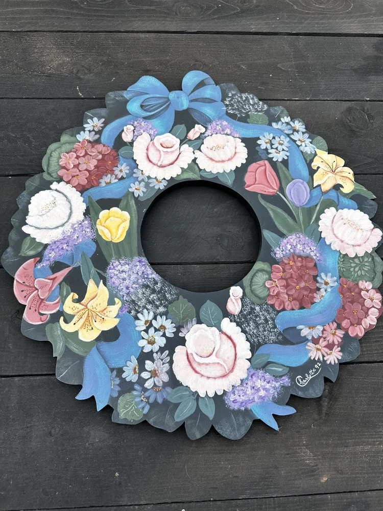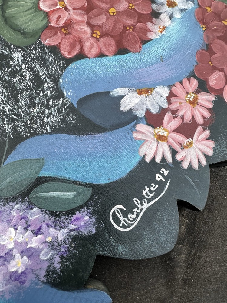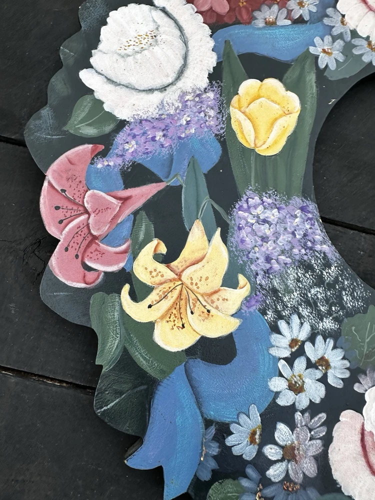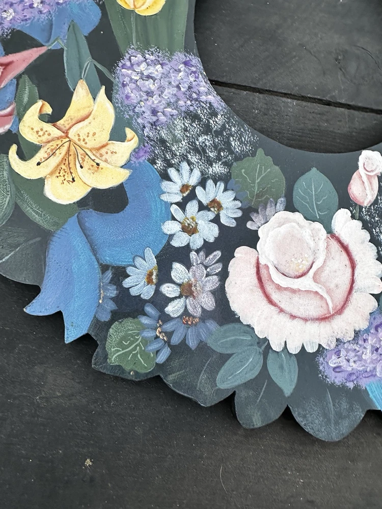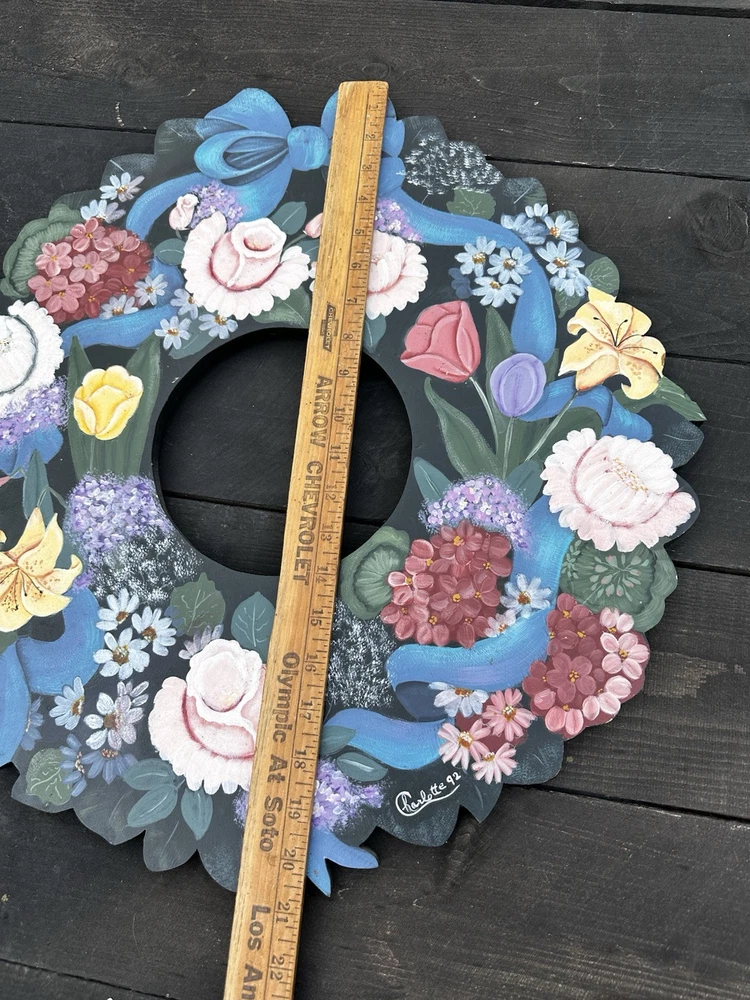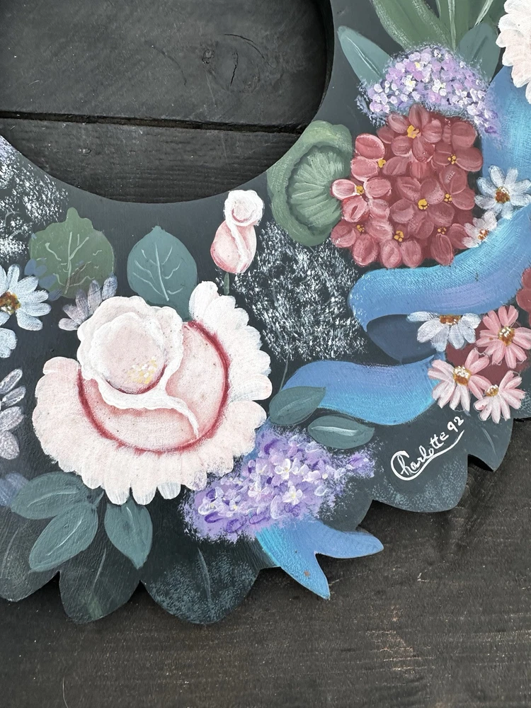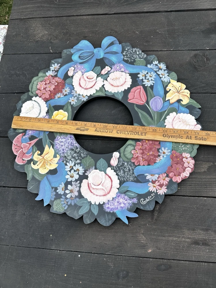 Enhance your home's charm with this vintage 20-inch painted wreath, a delightful blend of floral and rustic elegance. The wreath features an array of vibrant blooms including dahlias, hydrangeas, daffodils, and daisies, meticulously crafted on a durable wooden base. Its multicolored palette adds a festive touch to any space, making it an ideal choice for year-round decoration. Crafted with the West Pattern in 1992, this door decoration brings a shabby farmhouse feel to your living area. Perfect for any occasion, it serves as a versatile and timeless piece that will warmly greet your guests and add a splash of nature's beauty to your doorstep. Rosemary West pattern from 1991. The wreath measures 20” Painted and signed in 1992. Has a few tiny scratches. Please see detailed photos