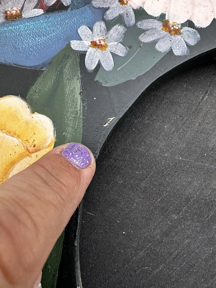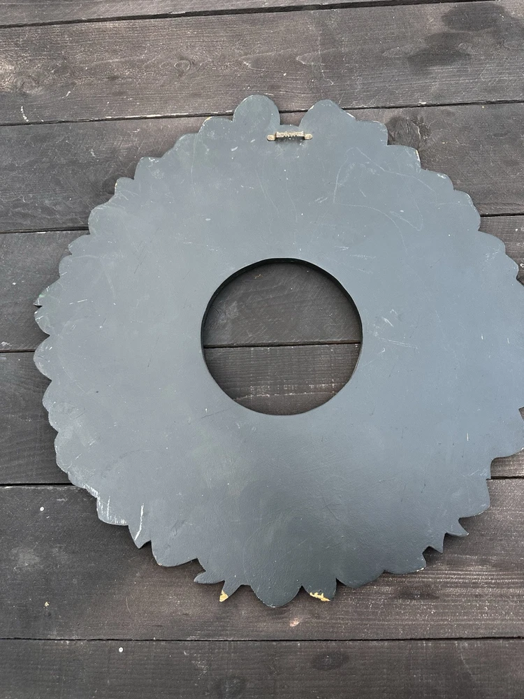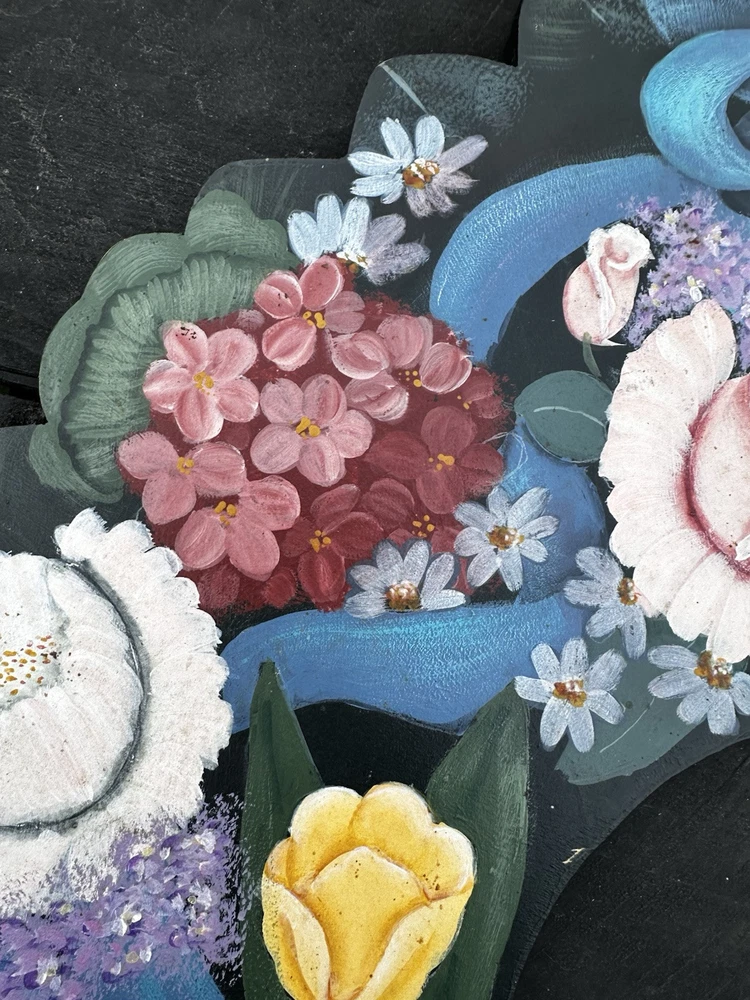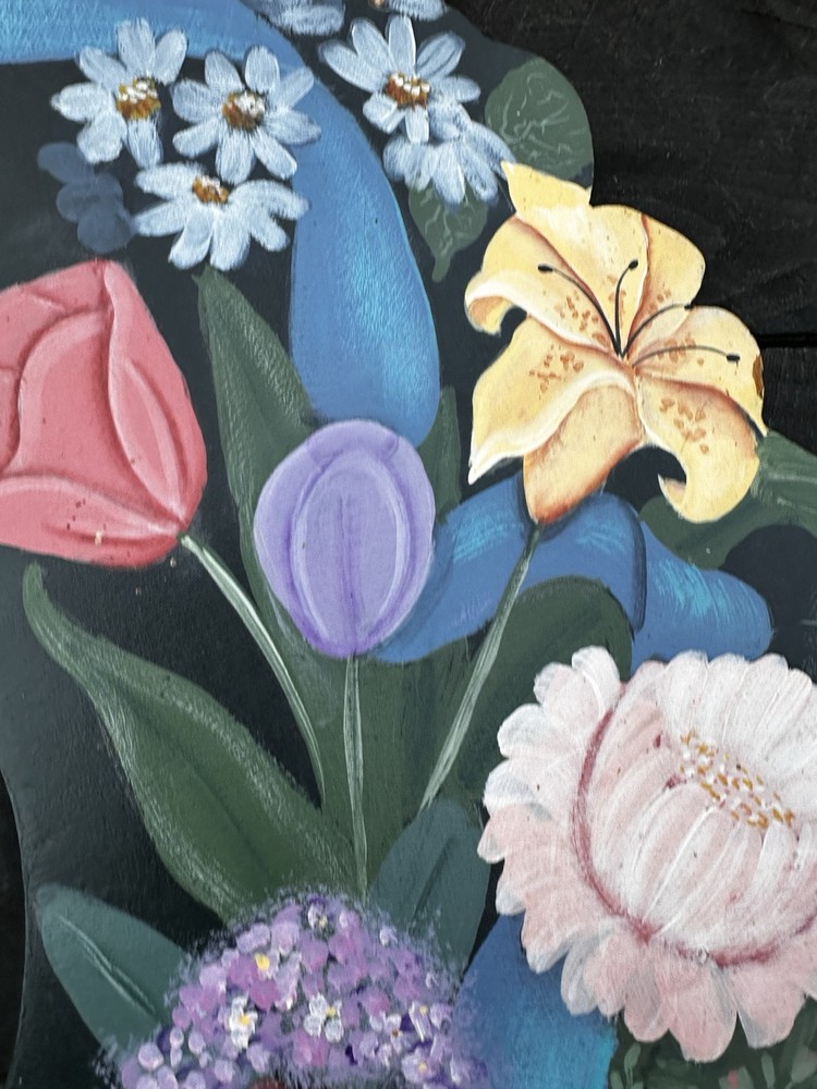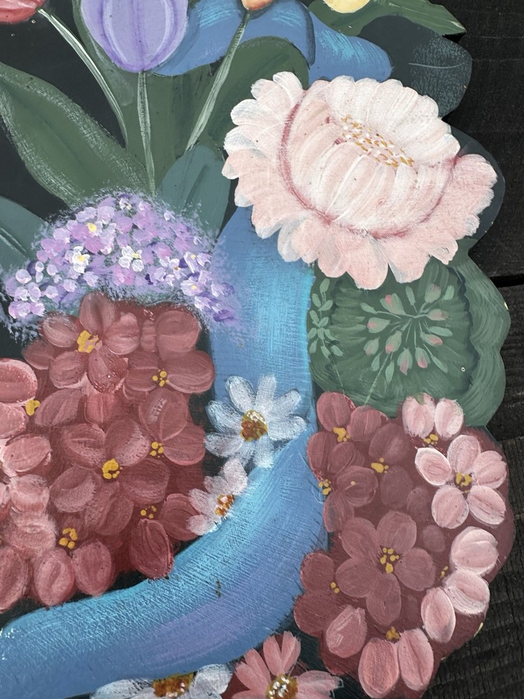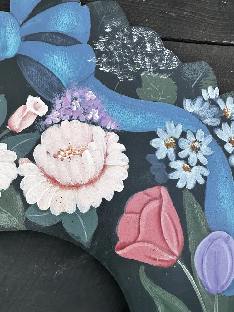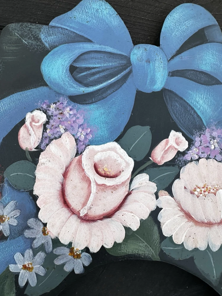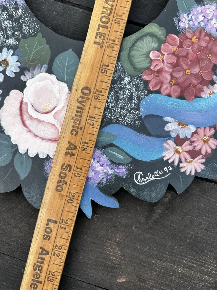 Enhance your home's charm with this vintage 20-inch painted wreath, a delightful blend of floral and rustic elegance. The wreath features an array of vibrant blooms including dahlias, hydrangeas, daffodils, and daisies, meticulously crafted on a durable wooden base. Its multicolored palette adds a festive touch to any space, making it an ideal choice for year-round decoration. Crafted with the West Pattern in 1992, this door decoration brings a shabby farmhouse feel to your living area. Perfect for any occasion, it serves as a versatile and timeless piece that will warmly greet your guests and add a splash of nature's beauty to your doorstep. Rosemary West pattern from 1991. The wreath measures 20” Painted and signed in 1992. Has a few tiny scratches. Please see detailed photos