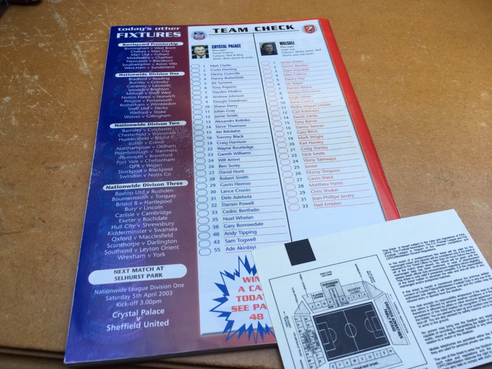Programme and ticket from the match between Crystal Palace and Walsall at Selhurst, 22nd March,2003. I have several other tickets and programmes available , please see my other listings. Happy to combine postage. Any questions please ask