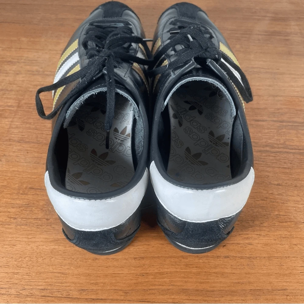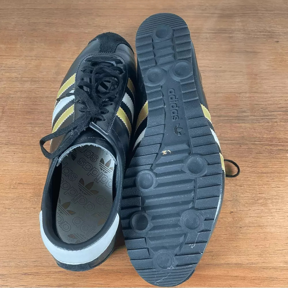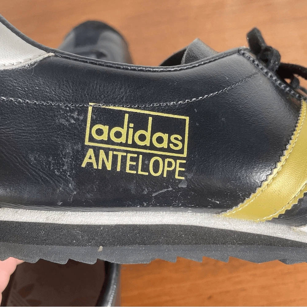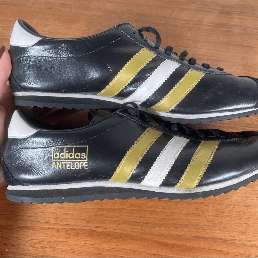 Black adidas antelope sneaker 2004 black with white and gold stripe. Relatively good condition, insoles are coming away as you can see but soles are in good shape. Great classic shoe rare and hard to find.