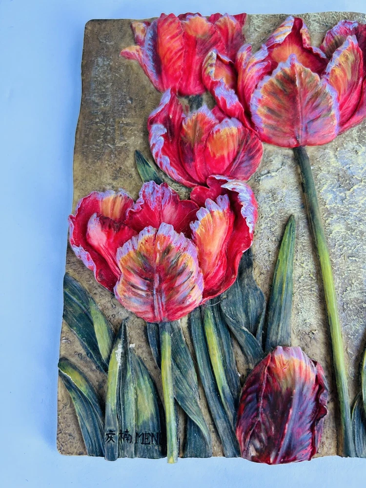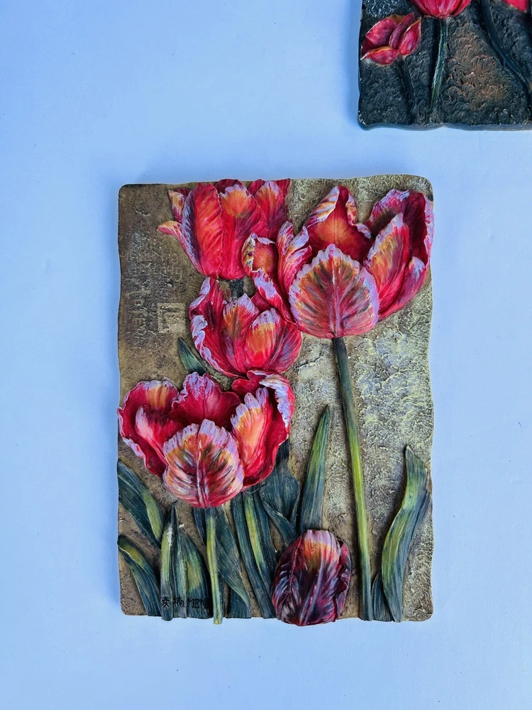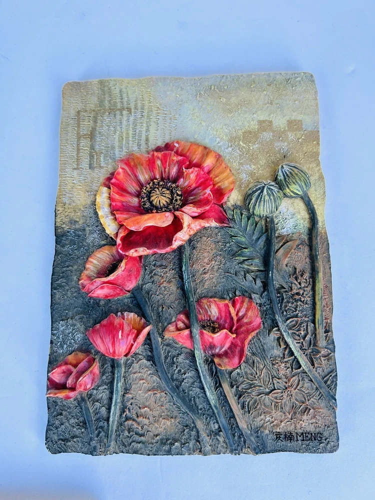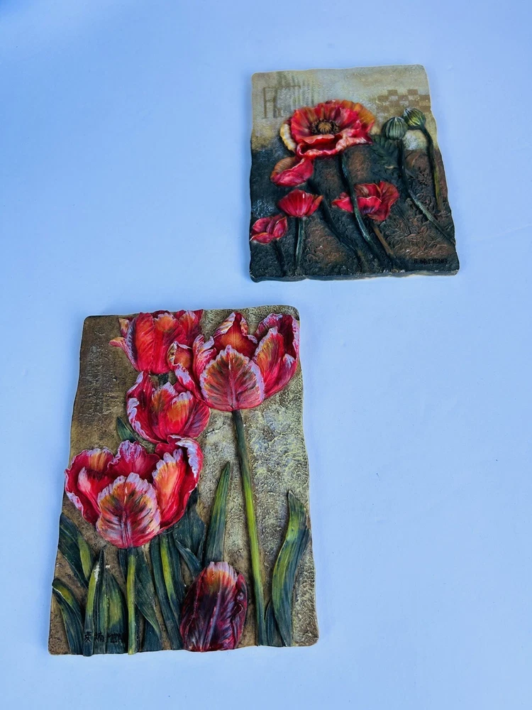 This vintage set of 3D wall plaques by MENG features beautiful floral patterns and intricate ceramic detailing. Measuring 6.25 inches in height, these pieces are perfect for adding a touch of art to any home decor. The set includes two plaques, each measuring 4.5 inches in width, making them a great addition to any small space or collection. The plaques are made of high-quality ceramic material and feature a unique combination of colors and designs. These pieces are perfect for anyone looking to add a touch of vintage charm to their home. Whether used as standalone decor or as part of a larger collection, these plaques are sure to impress. 11/7