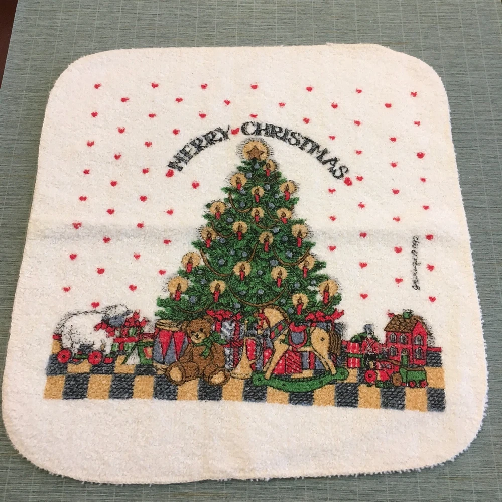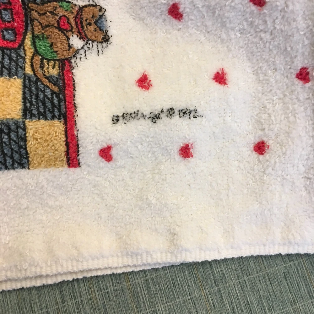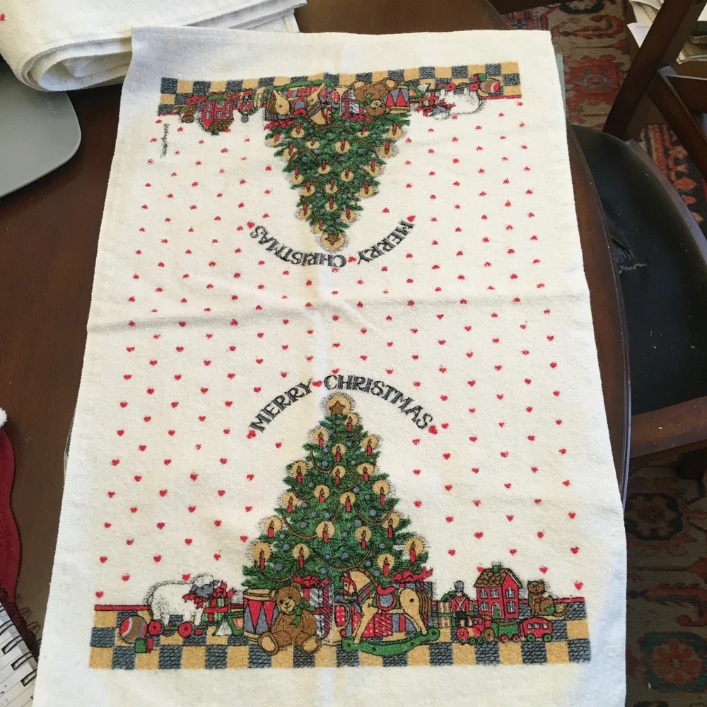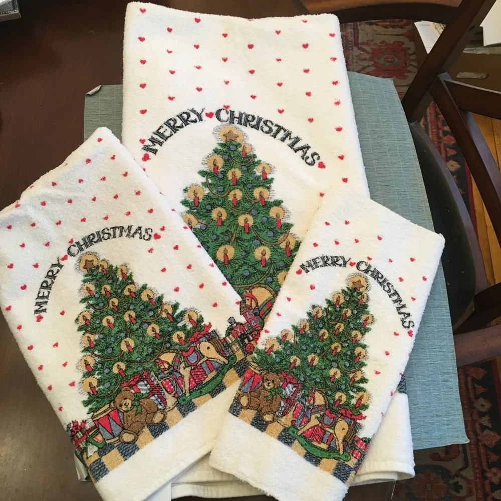 This wonderful, hard to find 3 Pc. bath set of Susan Winget art would be perfect for a guest at Christmastime. A full bath towel, a hand/guest towel, and a washcloth - all in Excellent Condition. The bath towel measures 23 1/2" x 41". The hand towel measures 15 1/2" x 23 1/2". The washcloth measures 11 1/2" x 12". Please look at all photos closely. Condition is "Used." Ships with USPS Ground Advantage.