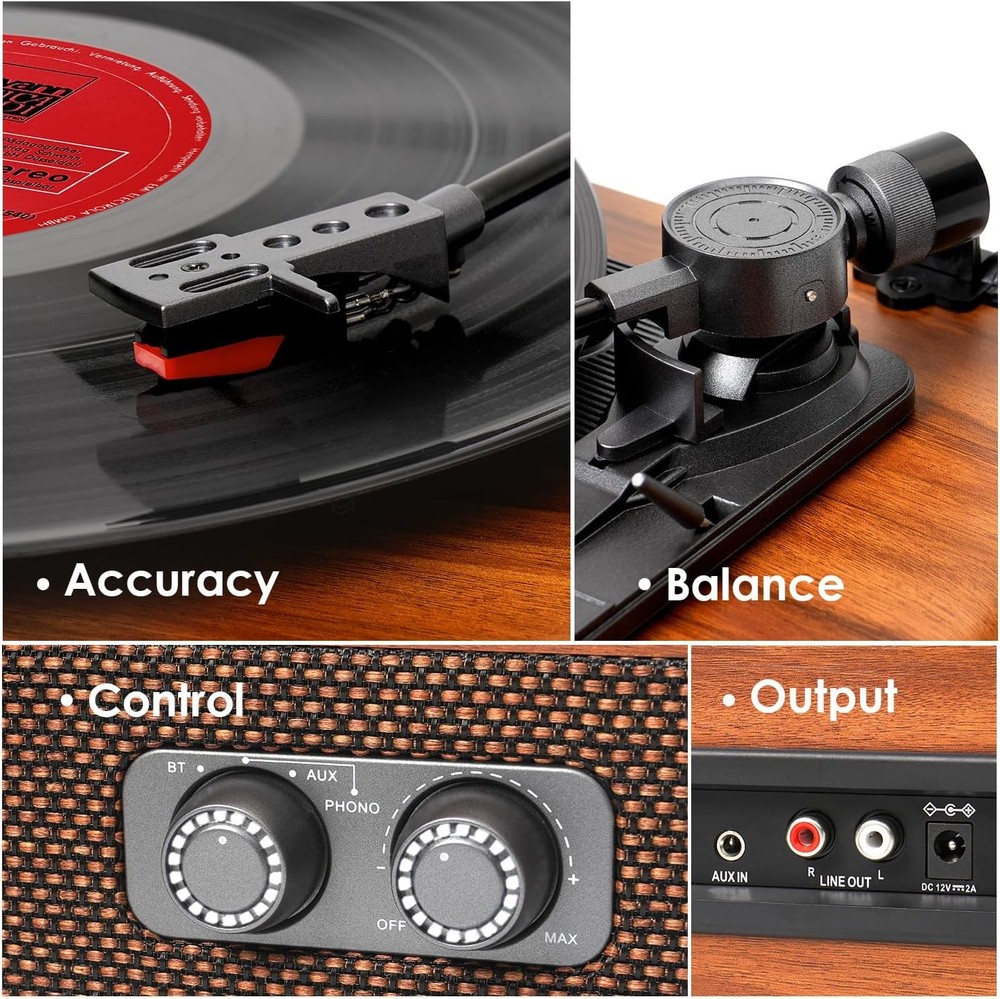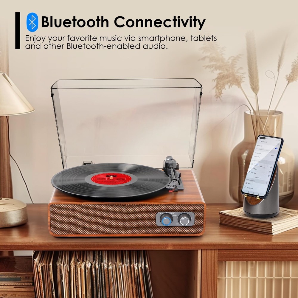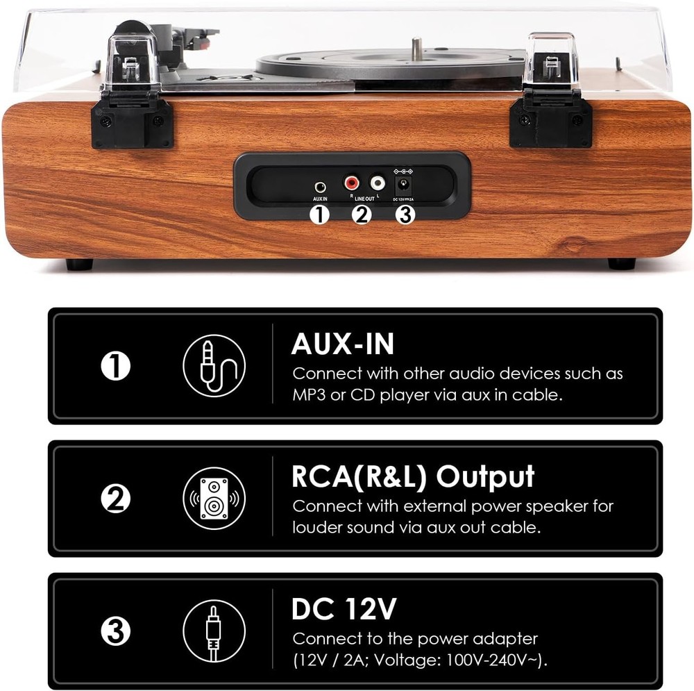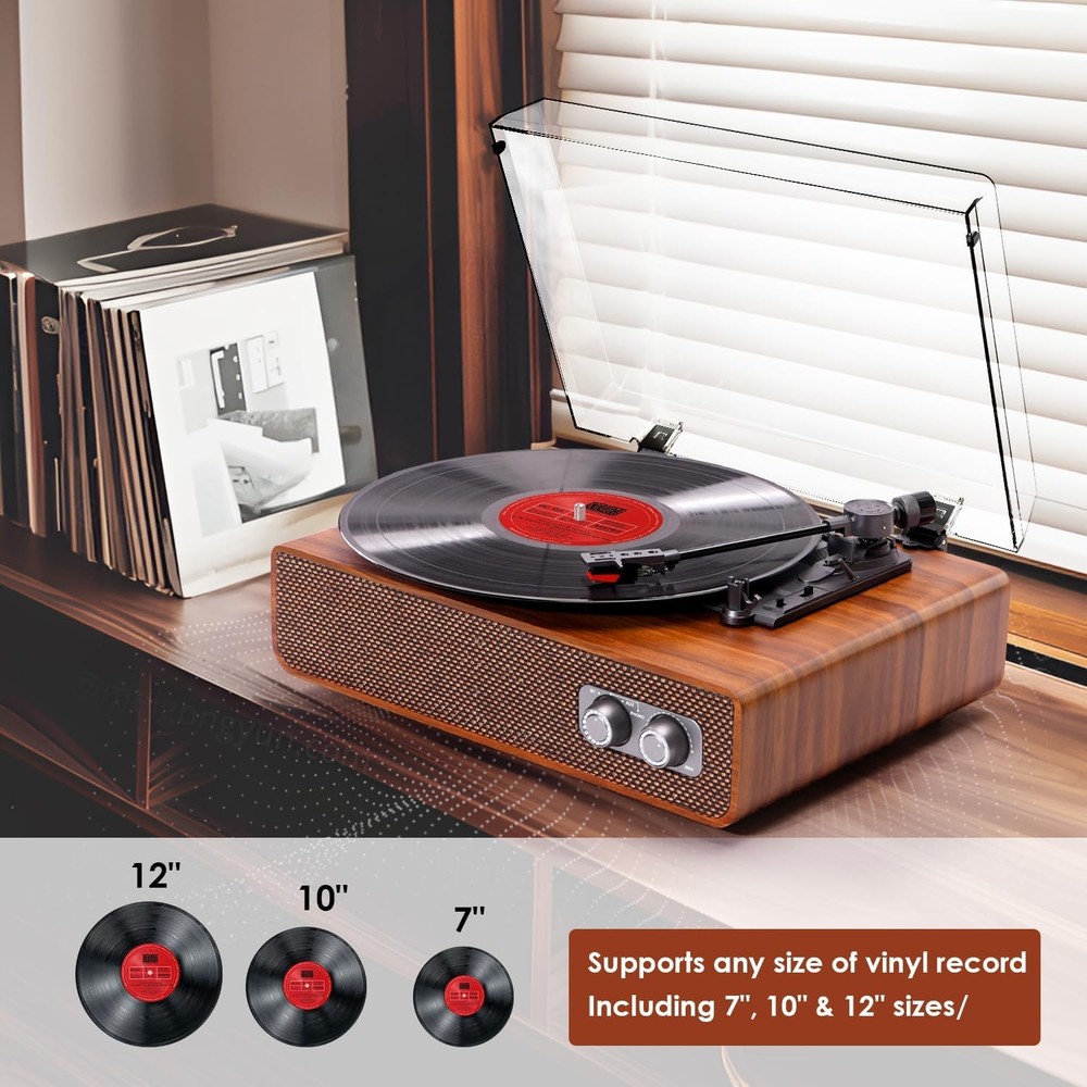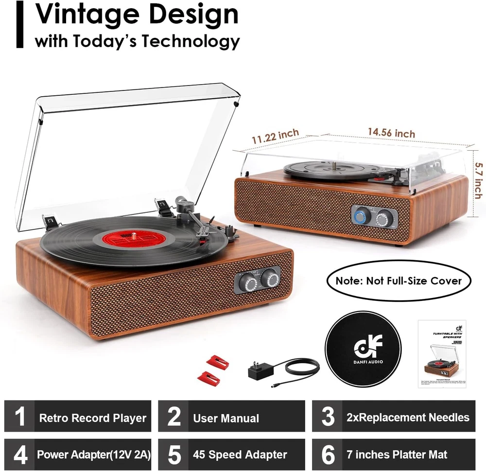 Vinyl Record Player Vintage 3 Speed Turntable Bluetooth with Upgraded Walnut Product Details Product Dimensions: 11 x 3.57 x 14.4 inches Item Weight: 8.27 pounds Item model number: TE-2018 Manufacturer: DANFI AUDIO DF Brand: DANFI AUDIO DF Connectivity Technology: RCA, Bluetooth Maximum Rotational Speed: 78 RPM Included Components: 1X 100V-240V 1.5M Power adapter, 1X Slipmat, 1X Backup needle, 1X 45 rpm adapter, 1X Users Manual Special Feature: Adjustable Speed, LED Shift Knob, Adjustable Counterweight, Non-Full-Size Dust Cover, Built-In Bluetooth Receiver Adjustable Speed, LED Shift Knob, Adjustable Counterweight, Non-Full-Size Dust Cover, Built-In Bluetooth ReceiverAdjustable Speed, LED Shift Knob, Adjustable Counterweight, Non-Full-Size Dust Cover, Built-In Bluetooth Receiver See more Material: Wood, Acrylic Style: Vintage Color: Walnut Model Name: TE-2018 Compatible Devices: MP3 Player, PC, Smartphone, Speaker, Tablet, CD 【MODERN TECHNOLOGY MEETS VINTAGE DESIGN】 Built from vintage style and modern aesthetics, it has minimalistic & simple design offers distinctive retro charm and LED shift knob to give a technological vibe, compact and sleek that great for desktop space especially small to medium-sized living room or bedroom. 【ADJUSTABLE NEEDLE COUNTERWEIGHT】 Essential fittings for any modern classic vinyl player, working to balance the stylus and adjust the needle pressure, allowing you to enjoy all details of vinyl records, help you truly appreciate crisp balanced vinyl sound. 【VERSATILE CONNECTION OPTIONS】The vinyl player offers a variety of connection options to audio devices, including Bluetooth input, RCA line-out ports, AUX line-in It provides with the flexibility to play records with or without external speakers, choose the audio setup that best suits your needs. 【WIRELESS BLUETOOTH INPUT】Build-in Bluetooth receiving function allows you connect to Bluetooth devices wirelessly such as smartphone, tablets, and playback streaming music via turntable's built-in speakers.