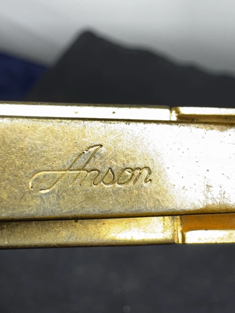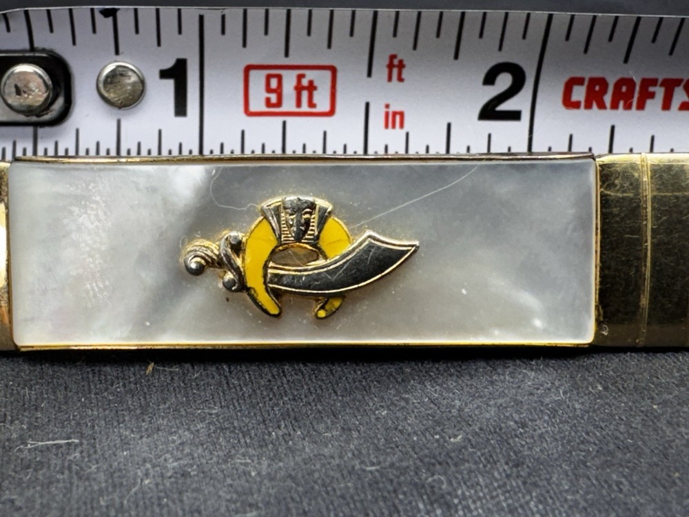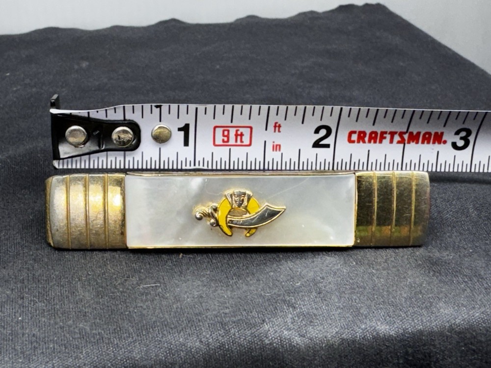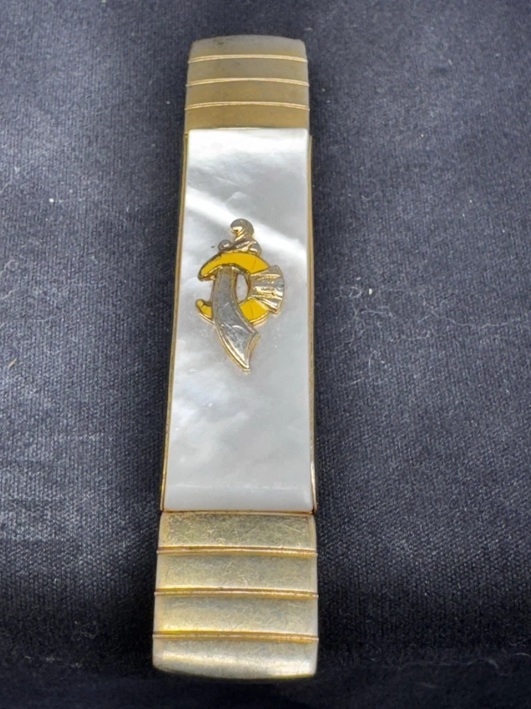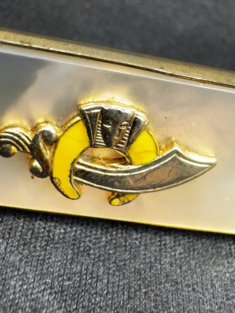 This 1950's Goldtone Mother Of Pearl Masonic Shriners Tie Clasp by Anson is a unique and stylish accessory for men's ties. The tie bar or clip features a masonic theme with a beautiful mother of pearl main stone, adding a touch of elegance and sophistication to any outfit. Perfect for those who appreciate vintage and collectible pieces with a touch of fraternal symbolism.