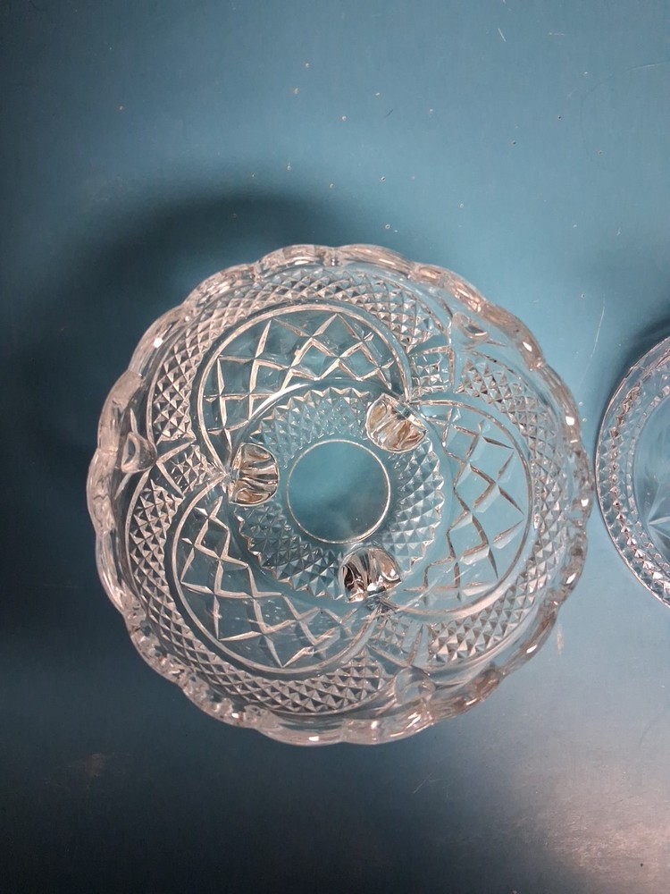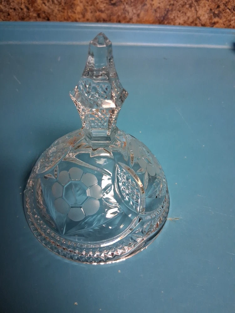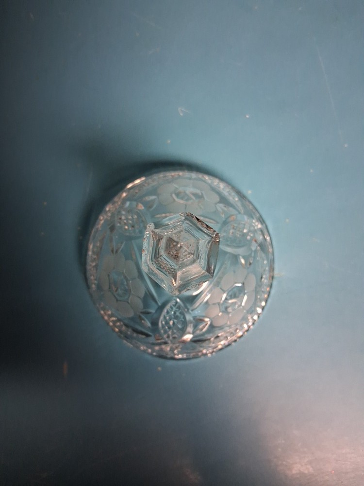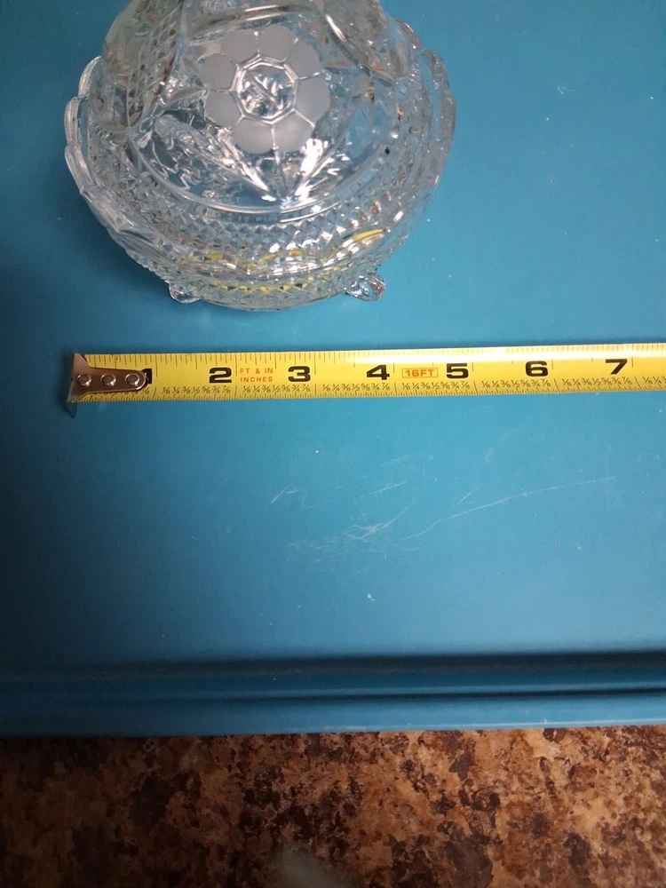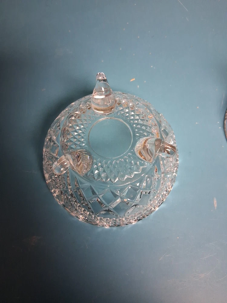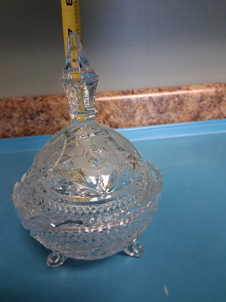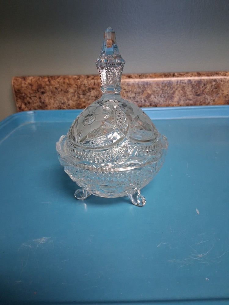 Add a touch of vintage charm to your home with this beautiful crystal clear glass candy dish. The dish is footed with a lid and stands at 7 inches tall. Its triangular shape adds a unique touch to its design. This two-piece set includes one compartment to hold your favorite candies or small treats. It is made of high-quality glass material and is perfect for any occasion. The dish is in excellent condition and is sure to impress your guests.