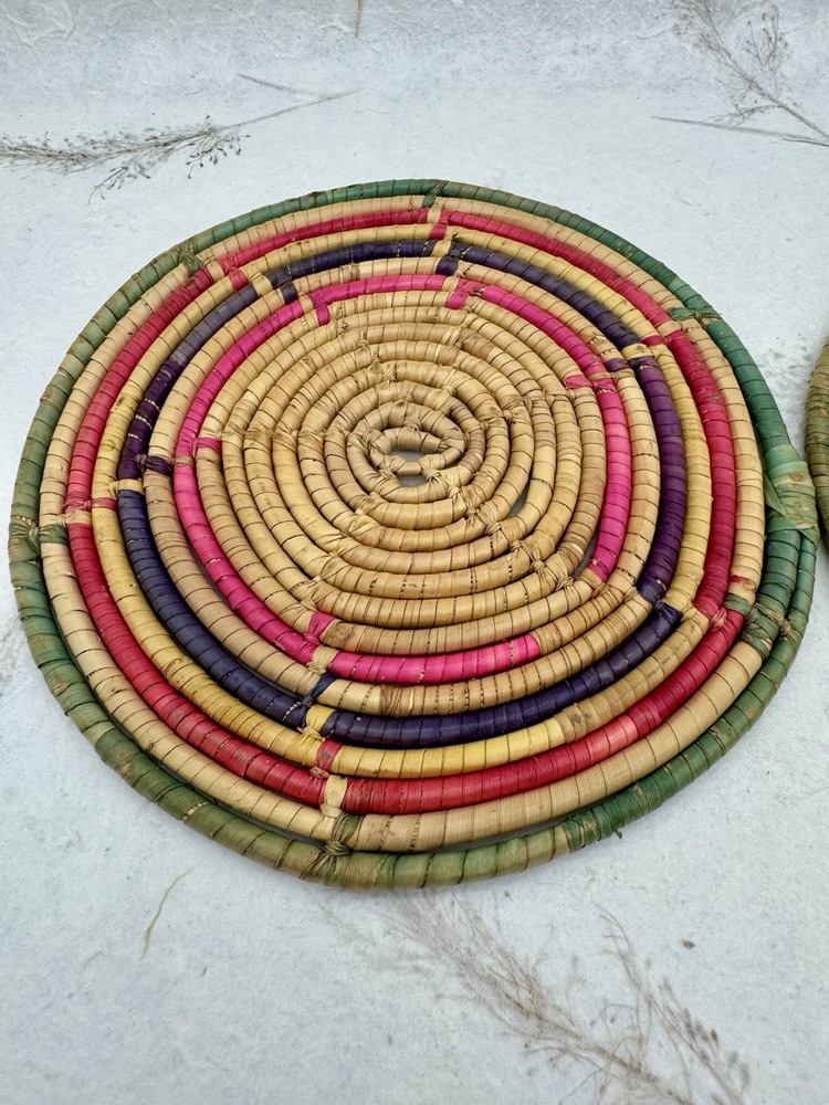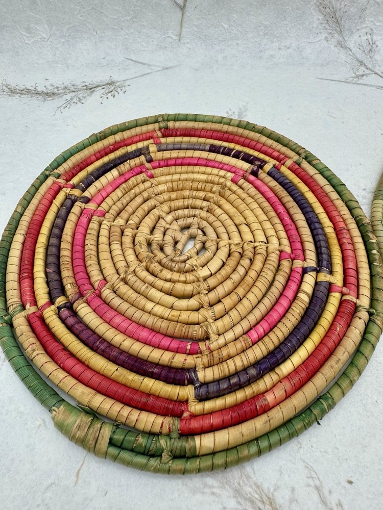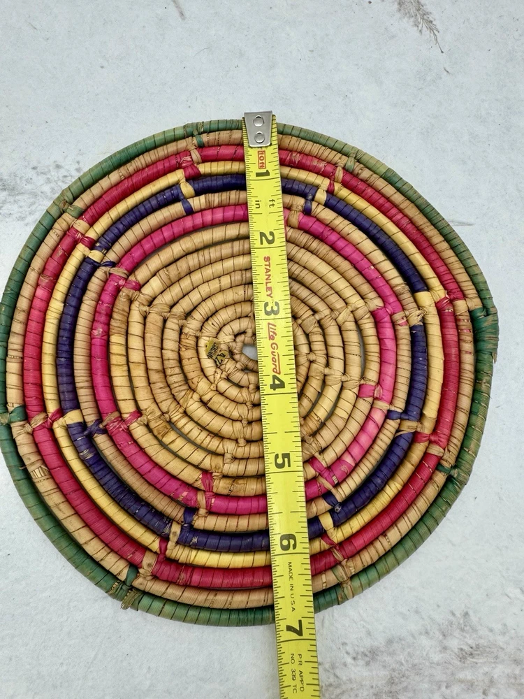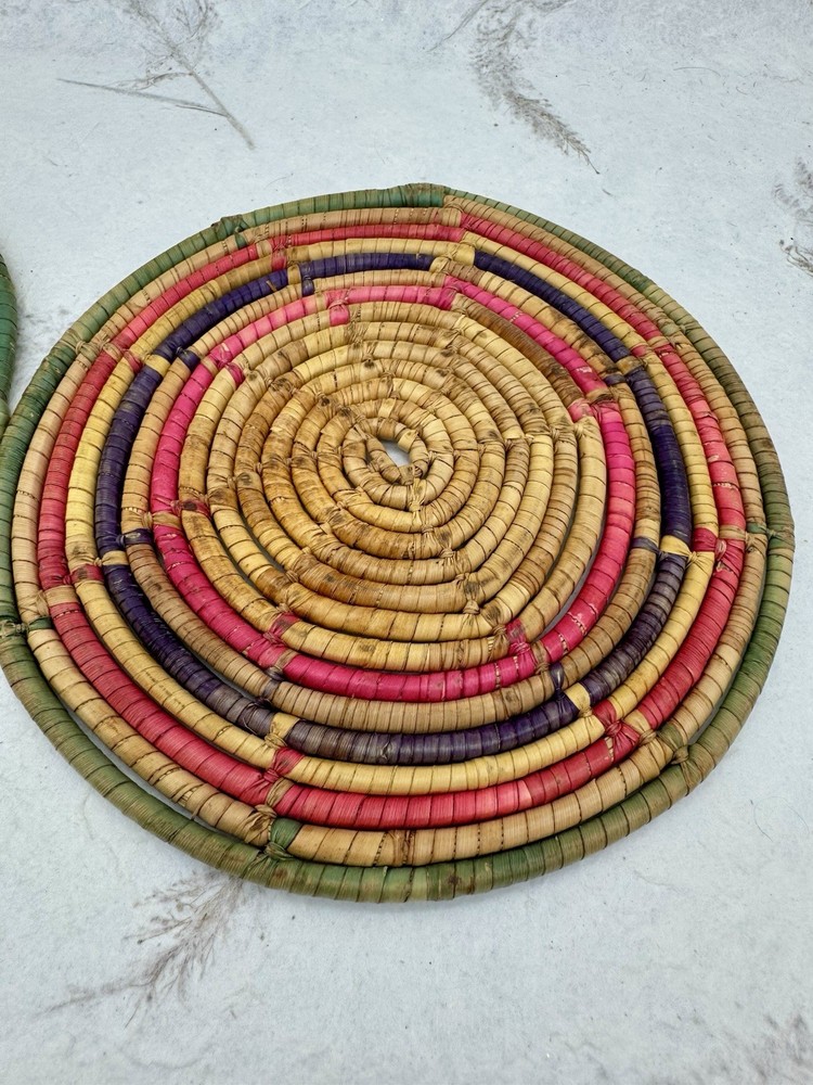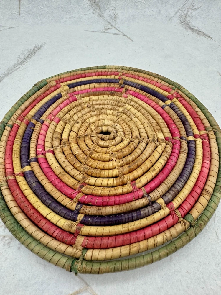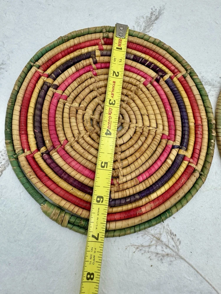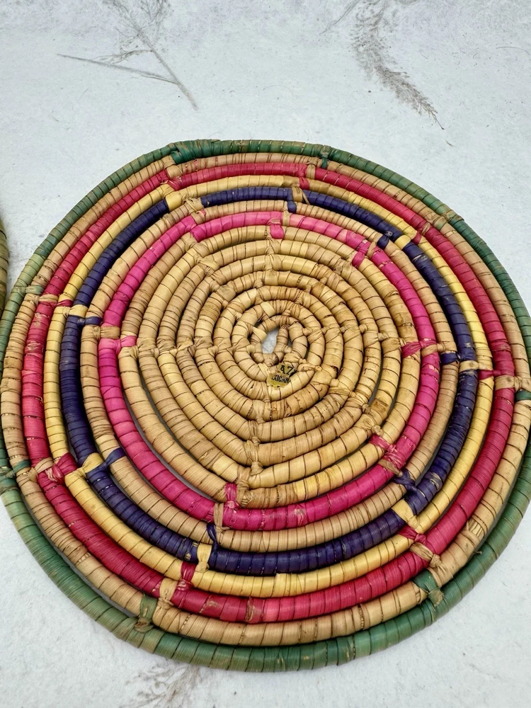 ๐ธ This vintage trivet hot pad set features a unique coiled design made from wicker straw rattan in a retro and lounge style. ๐ธ The abstract pattern and multicolor finish add a pop of vintage charm to your kitchen decor. ๐ธ Made in Mexico, these small round trivets are approximately 7 inches in diameter and perfect for adding a touch of retro flair to your dining experience. ๐ธ Preowned vintage condition with minimal wear. Colors are nice! Smoke free environment. ๐ธ Please view photos for closer inspection and more details. Thanks for shopping ๐ธ Thanks for shopping ๐ธ