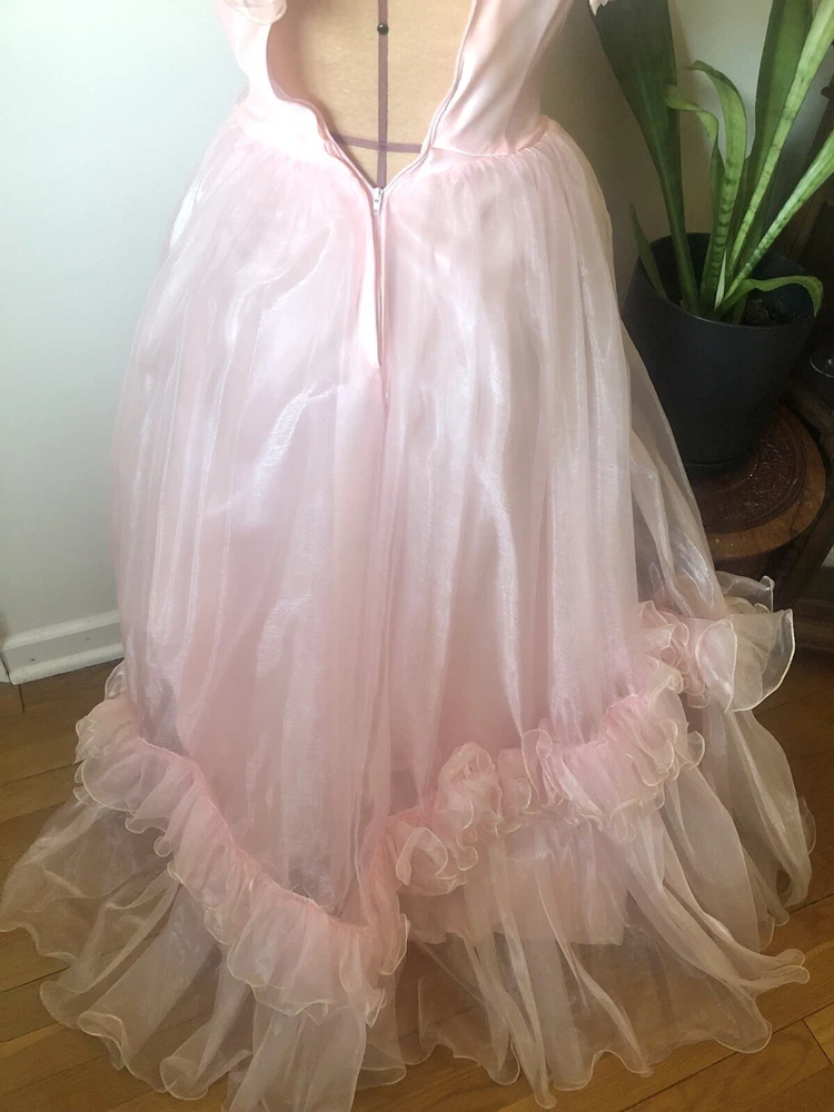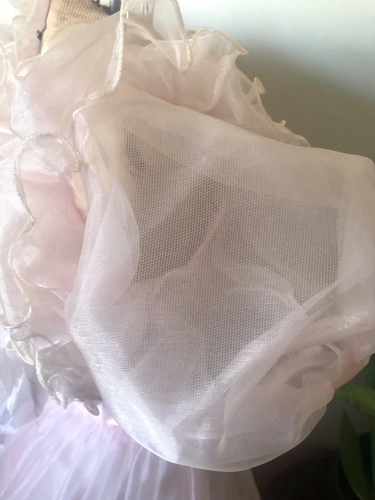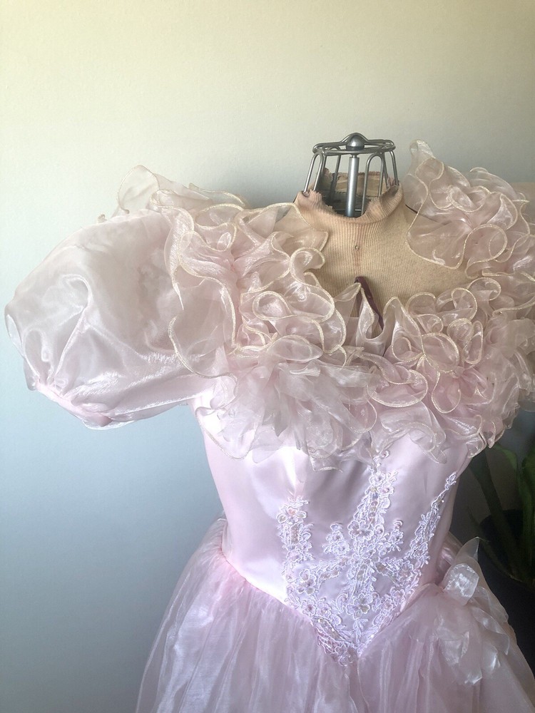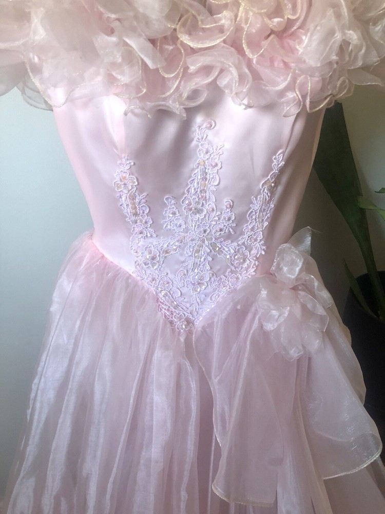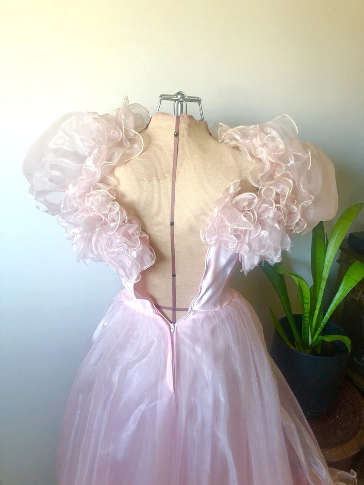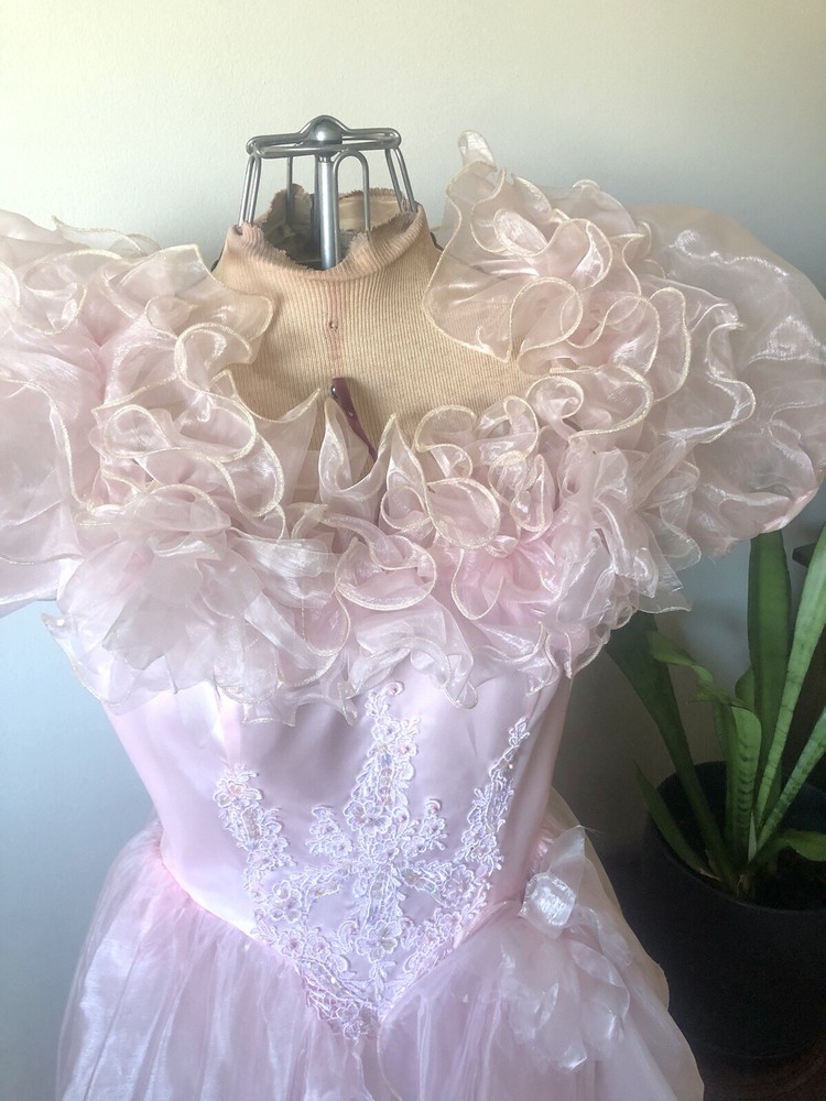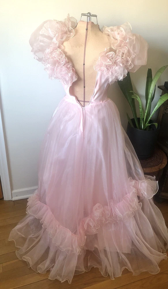 1980’s pink gown. Cotton candy organza and satin. The bodice has a heavily ruffled boat neckline. The ruffle edges are Iridescent. Matching flowers are tucked in the dense ruffles. Puff sleeves. The satin is lace adorned with bead and sequin flourishes. The full skirting is organza over tulle and satin. More ruffles and an organza flower with sash at the basque (v shaped) waist. Back zipper closure. No tags are present. This has some serious Glinda vibes. Or Disney princess, sugarplum fairy… oh the possibilities! Size 2XS/XS Approximate measurements are: Bust 30” Waist 24” Dress length from waist 42” Condition: Very Good. This piece was altered to fit a tiny figure. The seams under the arms have up to 2+” of fabric. The sleeves were not reattached under the arms after the bodice was taken in. There are small darts noted at the back waist area. The hem is edge is dingy bit not noticeable. There is an occasional very small spot. Please refer to the last 3 pictures **No returns are accepted **