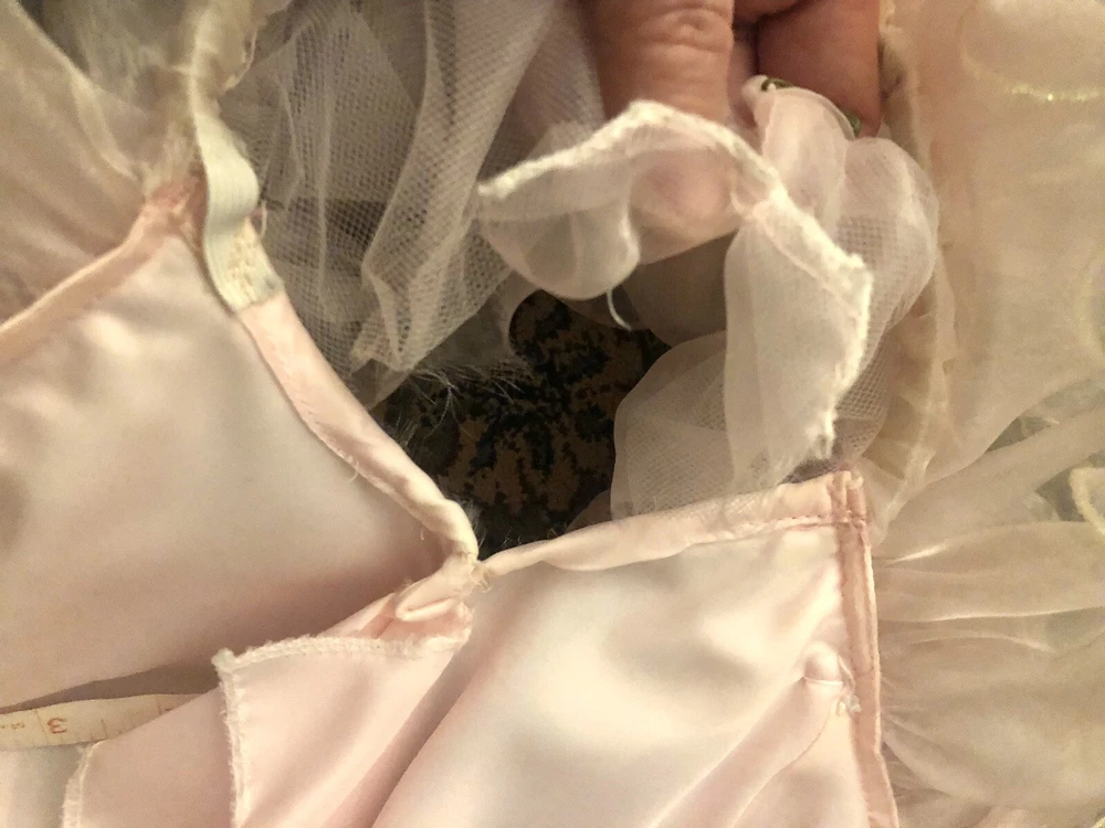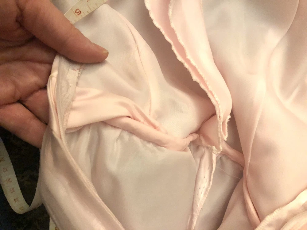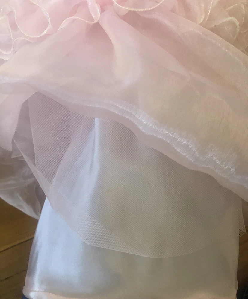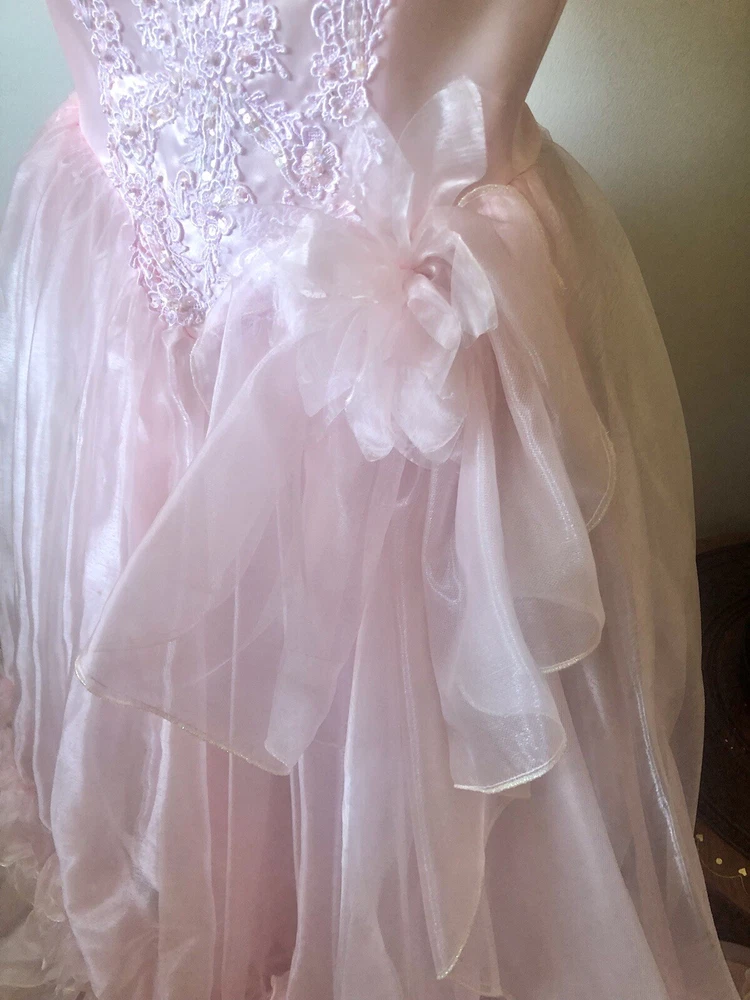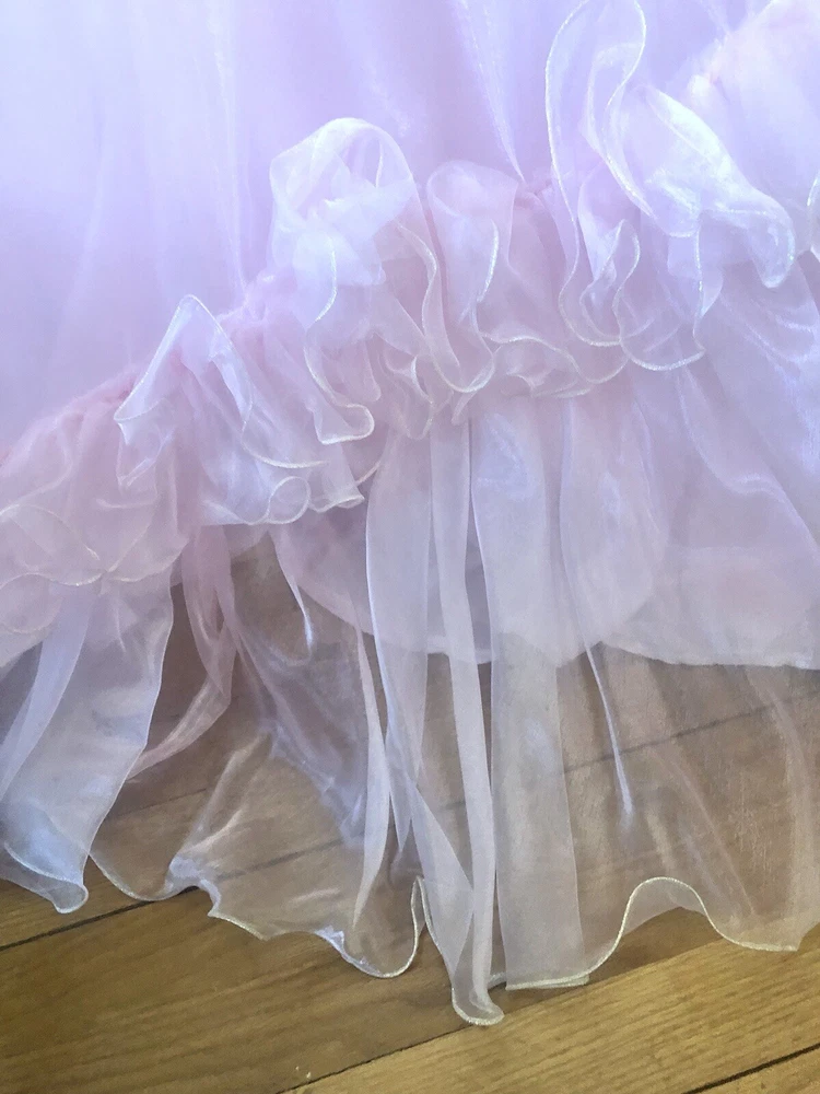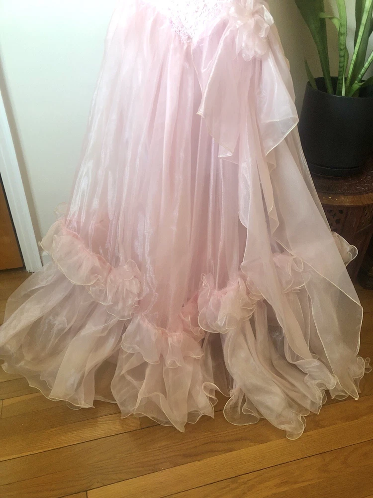 1980’s pink gown. Cotton candy organza and satin. The bodice has a heavily ruffled boat neckline. The ruffle edges are Iridescent. Matching flowers are tucked in the dense ruffles. Puff sleeves. The satin is lace adorned with bead and sequin flourishes. The full skirting is organza over tulle and satin. More ruffles and an organza flower with sash at the basque (v shaped) waist. Back zipper closure. No tags are present. This has some serious Glinda vibes. Or Disney princess, sugarplum fairy… oh the possibilities! Size 2XS/XS Approximate measurements are: Bust 30” Waist 24” Dress length from waist 42” Condition: Very Good. This piece was altered to fit a tiny figure. The seams under the arms have up to 2+” of fabric. The sleeves were not reattached under the arms after the bodice was taken in. There are small darts noted at the back waist area. The hem is edge is dingy bit not noticeable. There is an occasional very small spot. Please refer to the last 3 pictures **No returns are accepted **