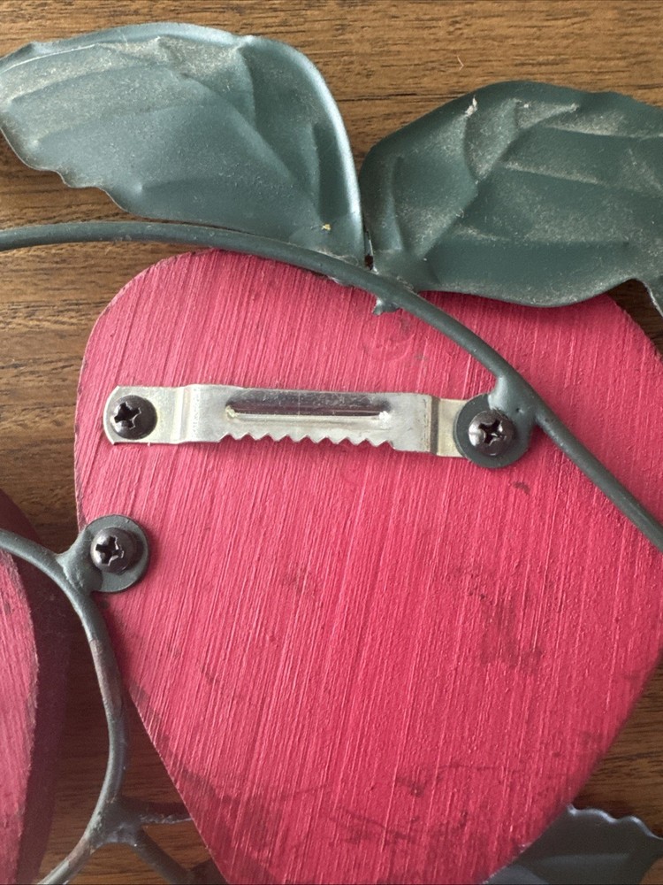 Add a charming retro touch to your kitchen with this vintage wooden and metal apple wall hanging. Featuring three red apples with green metal leaves and curling vines, it brings nostalgic farmhouse vibes straight from the 1980s or early 90s. Perfect for a country kitchen, cottagecore aesthetic, or vintage fruit-themed decor. • Hand-painted red wood apples • Embossed metal leaves and wire scroll detail • Sturdy hanging hardware attached • Approx. 16” wide x 9” tall • Vintage pre-owned condition with some wear and patina (see photos) This piece is a lovely example of nostalgic country decor and would look great in a cozy kitchen or vintage-themed gallery wall.