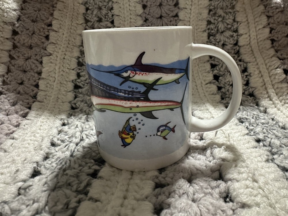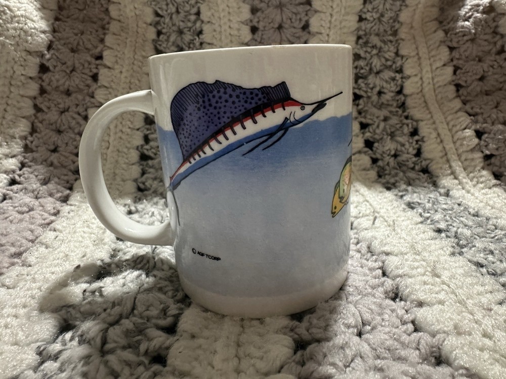 The product is a vintage 80's Fish ceramic coffee mug featuring a novelty sailfish, swordfish, and marlin design. This round mug has a capacity of 12 fl oz and is decorated in a nautical style. Made of ceramic, it is suitable for hot beverages and is a unique addition to any kitchen or dining set. Perfect for those who appreciate quirky and nostalgic items, this brown-colored mug combines functionality with a playful fish-themed pattern.