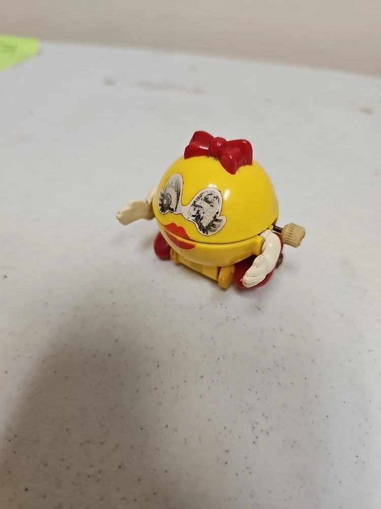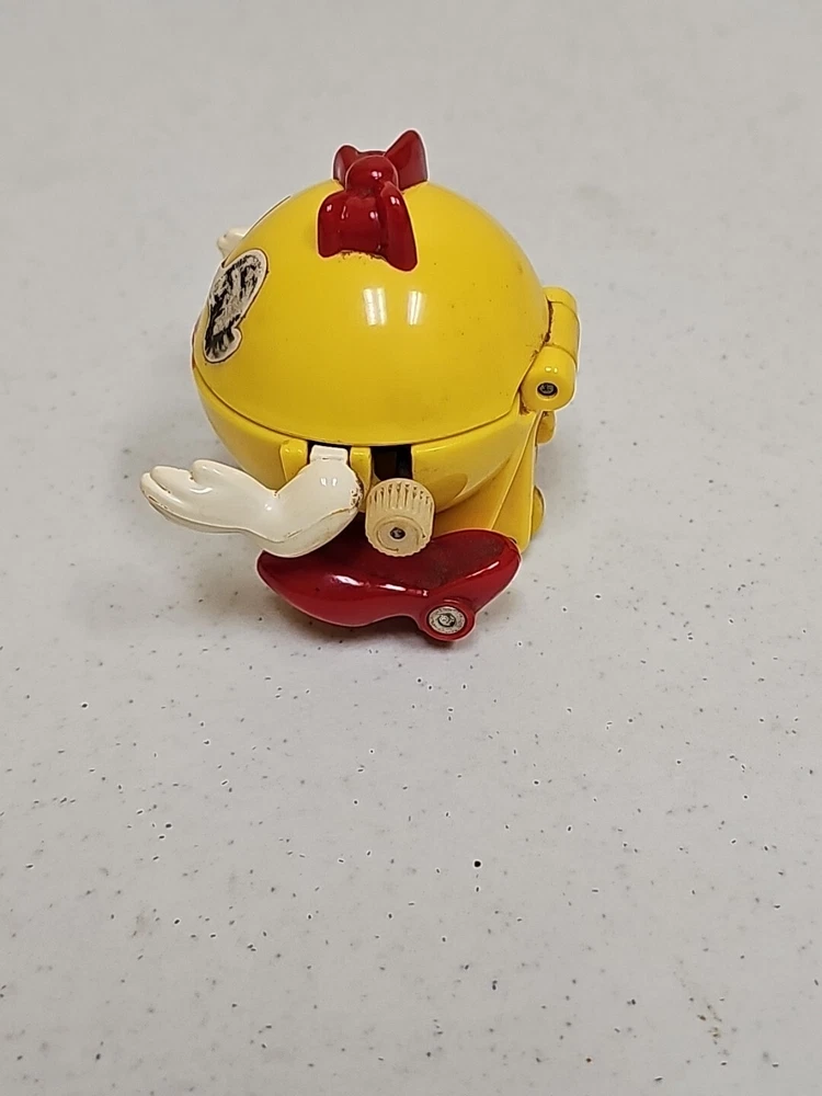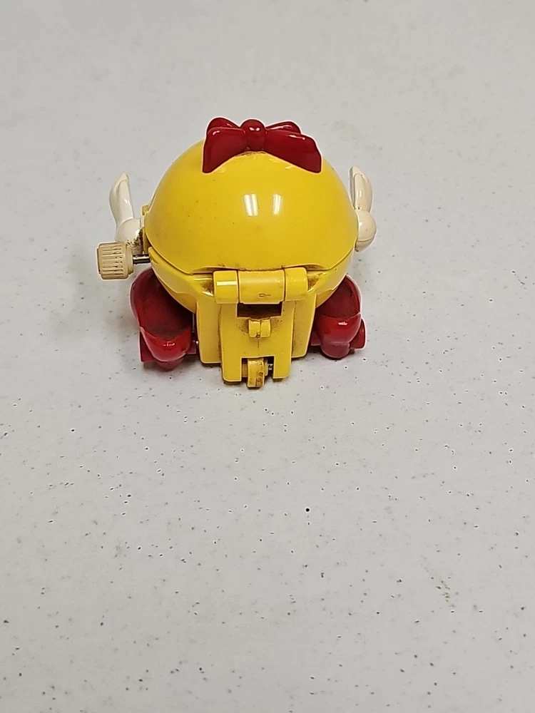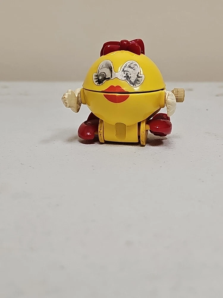 Embrace the nostalgic charm with this Vintage 80s Ms. PAC-MAN Wind Up Walking Toy. A classic treasure from TOMY, this delightful piece harks back to the era of quintessential arcade fun. Its timeless design is a homage to the iconic Pac Man character family, bringing a touch of retro gaming to your collection. Crafted in Taiwan, this wind-up toy stands as a testament to the era's craftsmanship. A must-have for collectors and enthusiasts, the item captures the spirit of vintage toys, making it a unique addition to any display of wind-up toys or video game memorabilia.